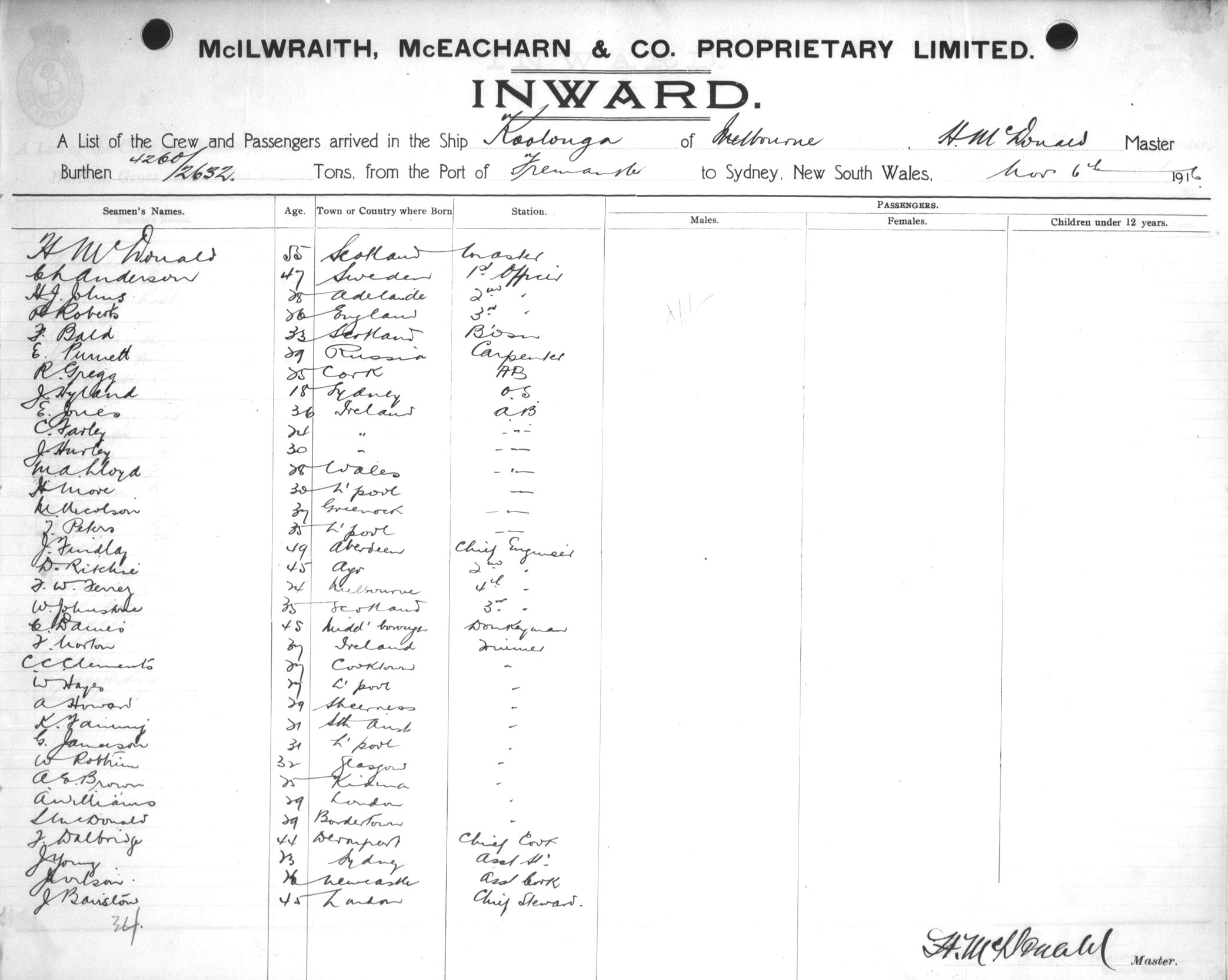KOOLONGAOF MELBOURNE, H. MCDONALD, MASTER, BURTHEN 4260/2632 TONS FROM THE PORT OF FREMANTLE TO SYDNEY, NEW SOUTH WALES, 6TH NOVEMBER 1916 |