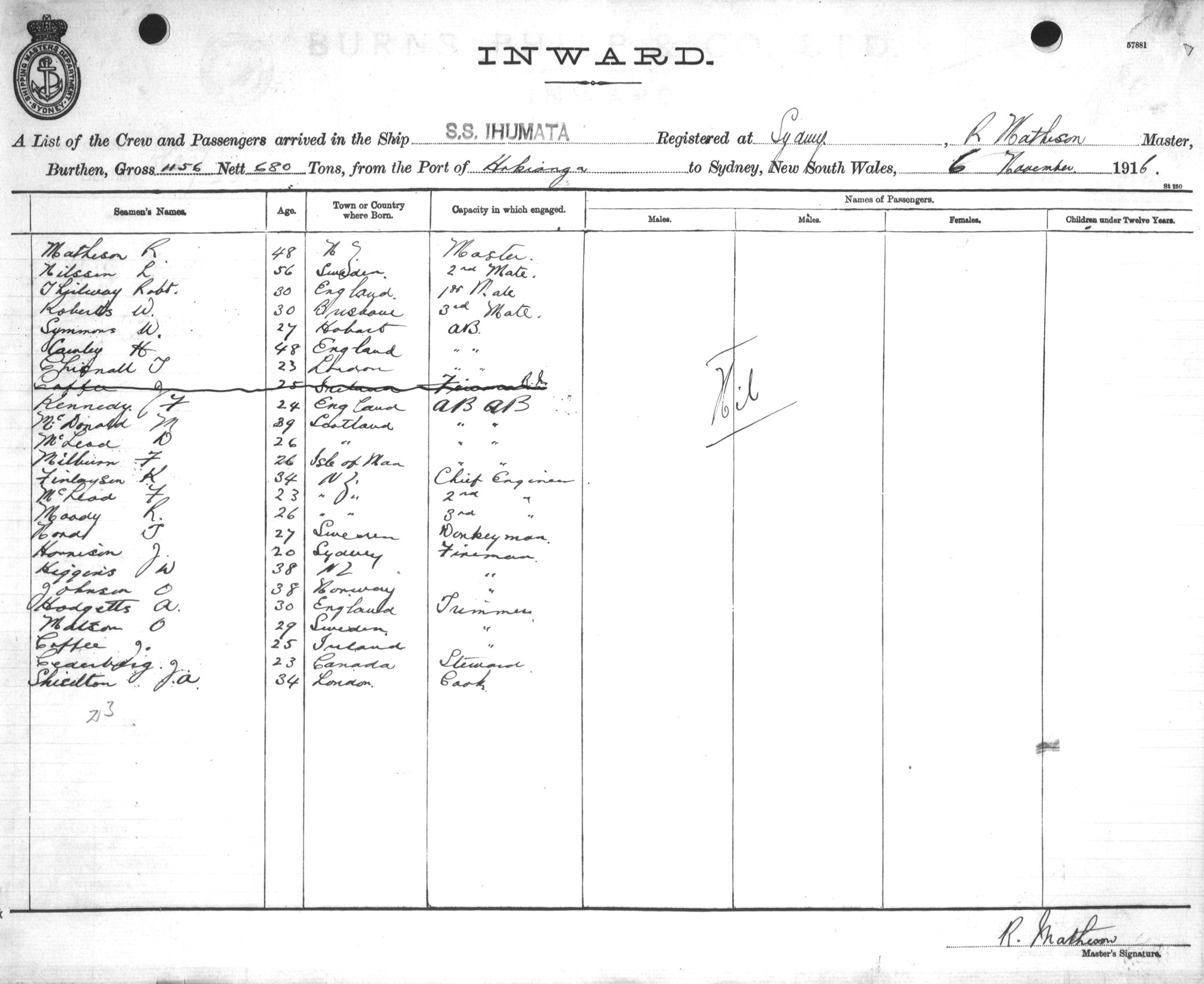 IHUMATAOF SYDNEY, R. MATHISON, MASTER, BURTHEN 680/456 TONS FROM THE PORT OF HOKIANGA, N.Z. TO SYDNEY, NEW SOUTH WALES, 6TH NOVEMBER 1916 |