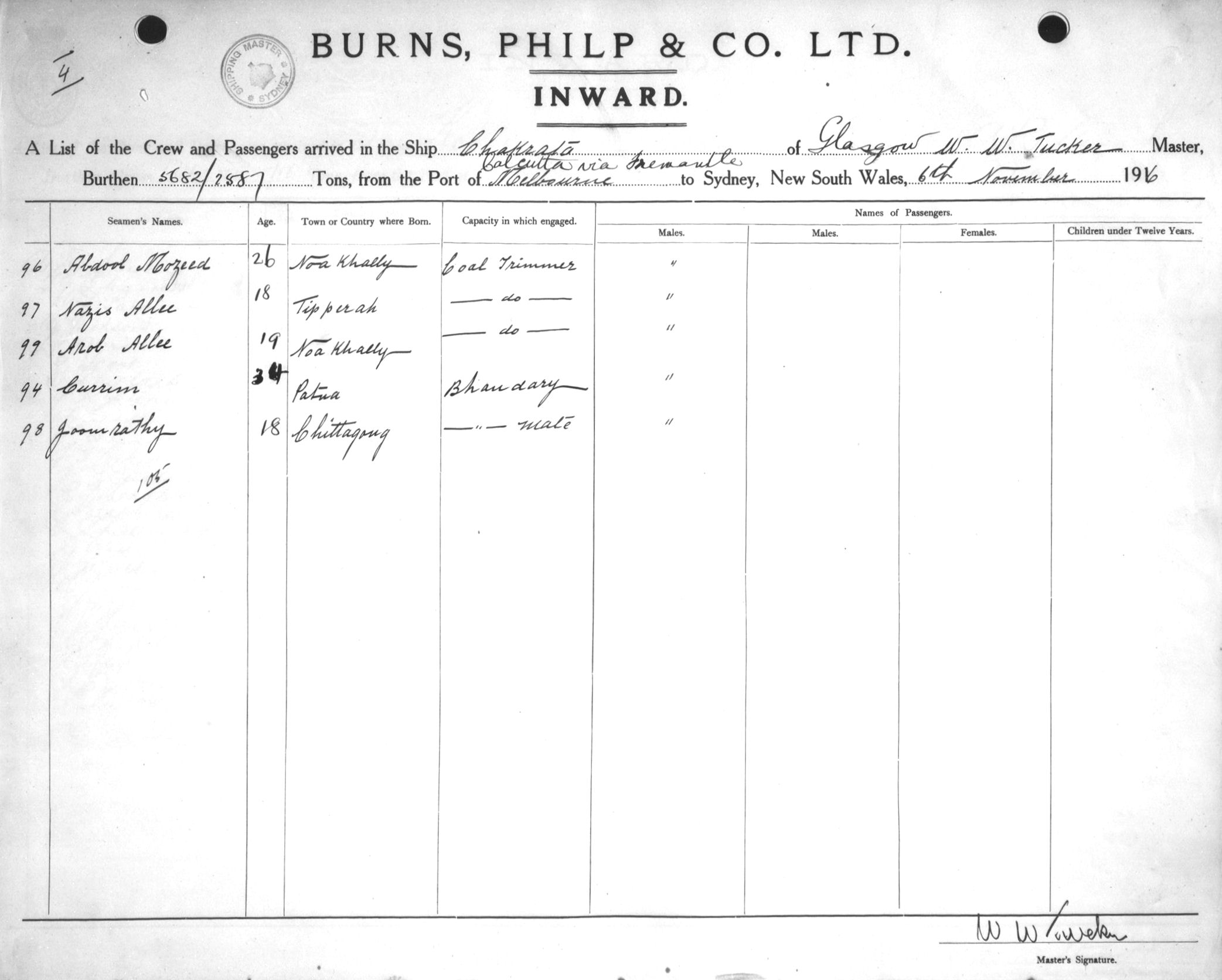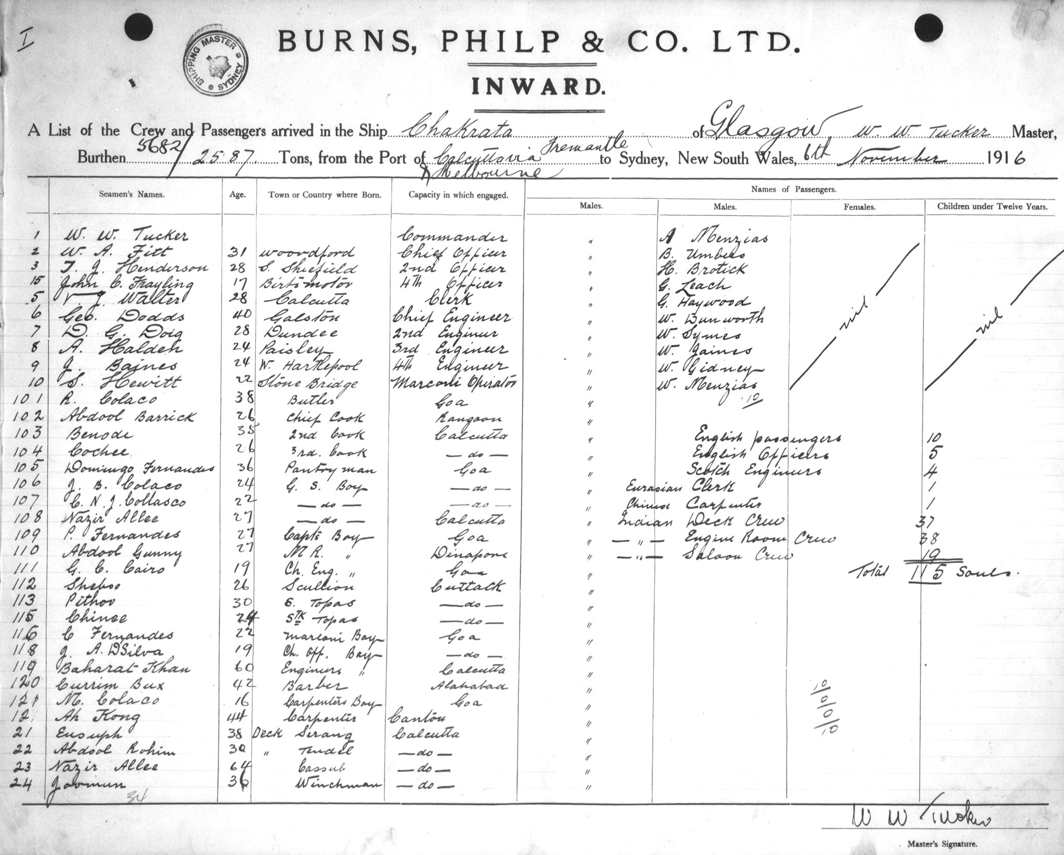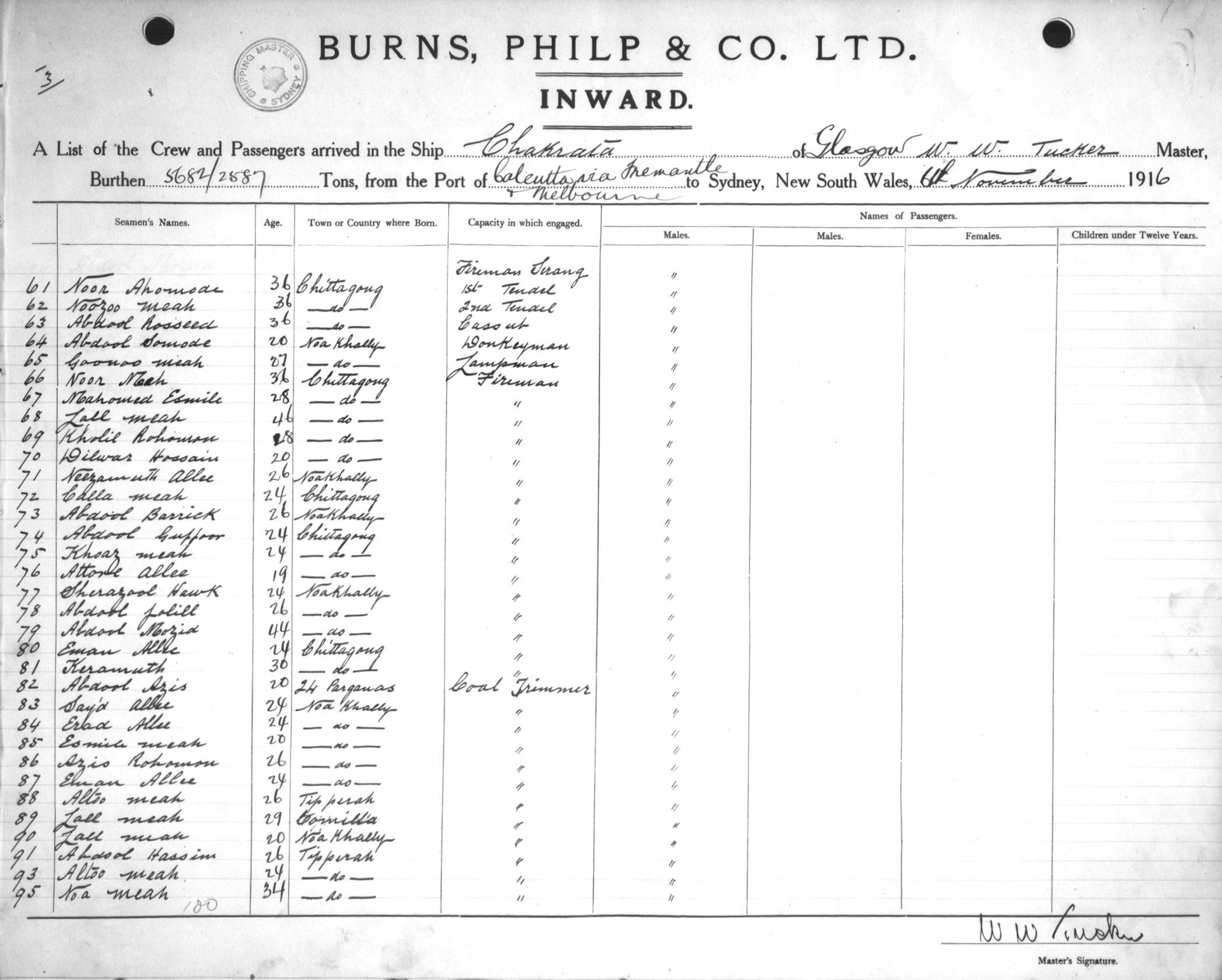 CHAKRATAOF GLASGOW, W. W. TUCKER, MASTER, BURTHEN 5682/2587 TONS FROM THE PORT OF CALCUTTA via FREMANTLE & MELBOURNE TO SYDNEY, NEW SOUTH WALES, 6TH NOVEMBER 1916 |