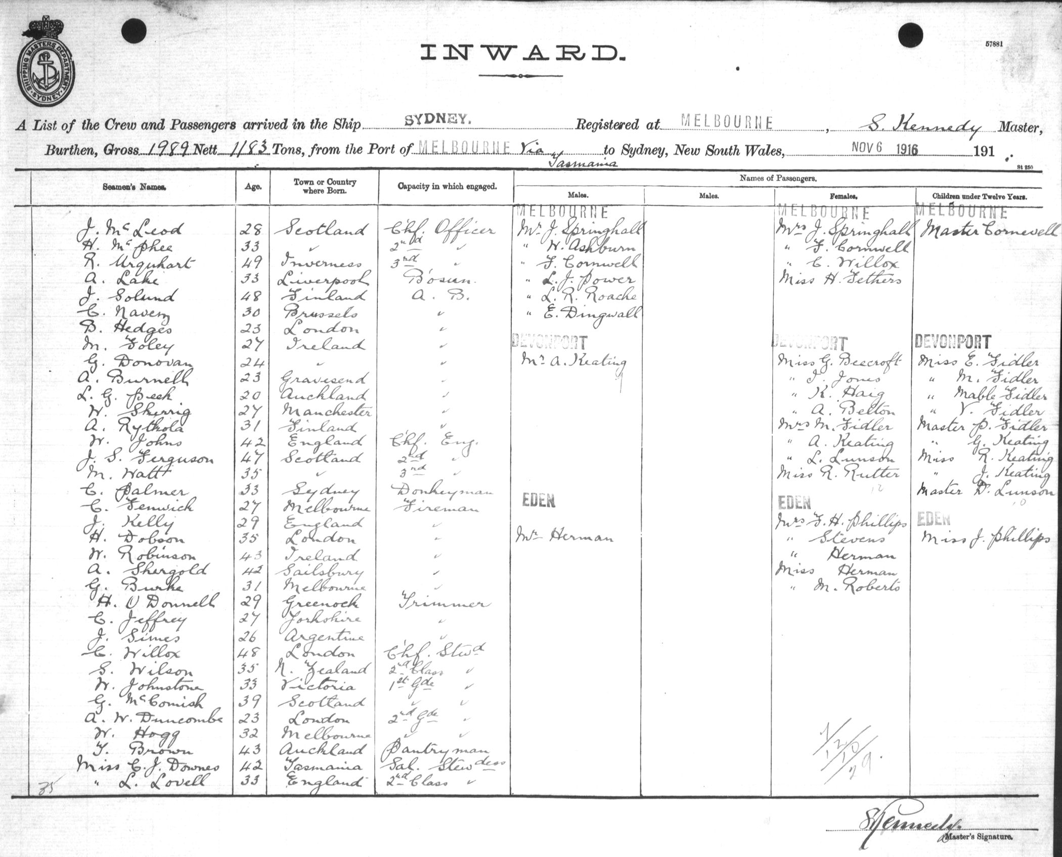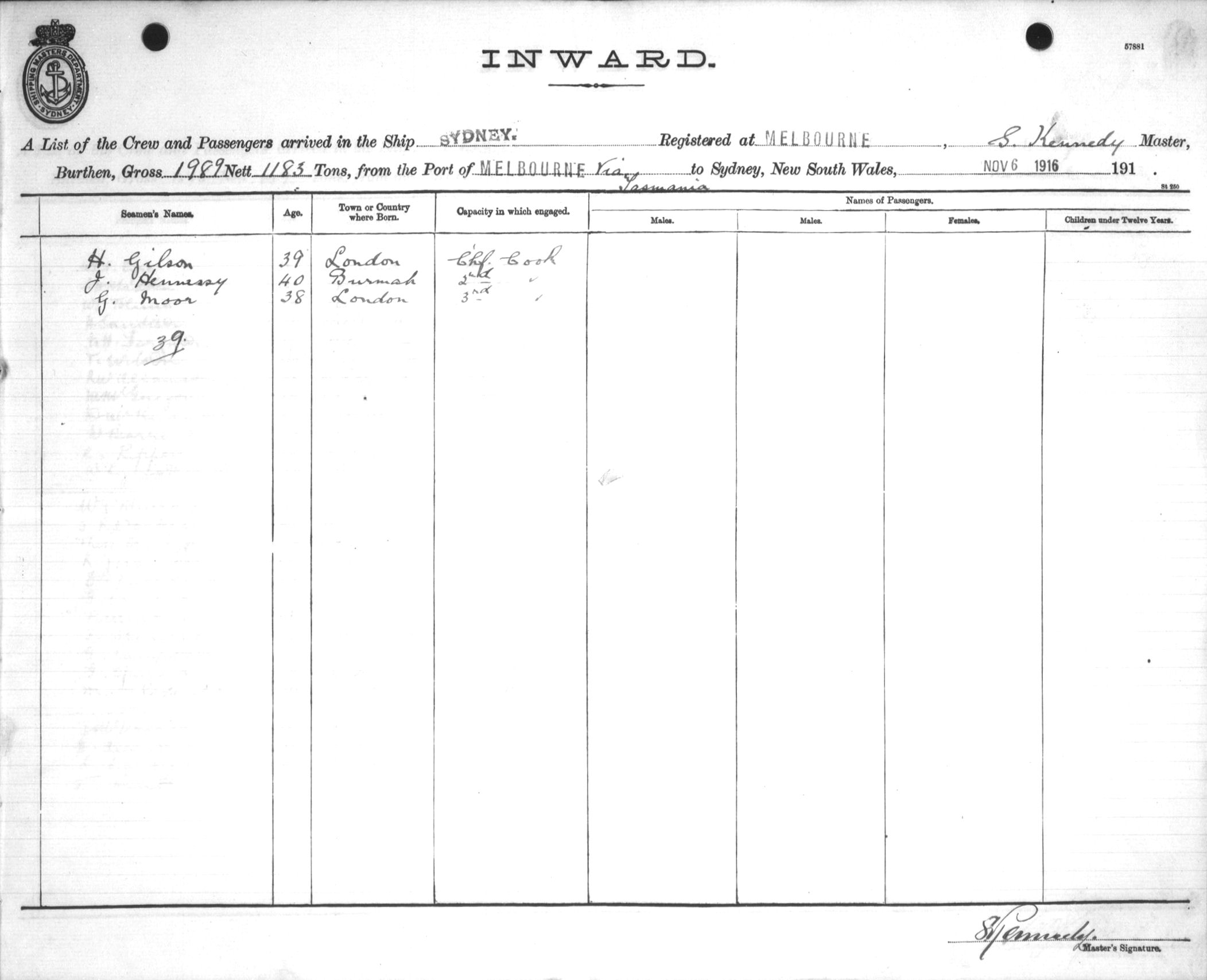 SYDNEYOF MELBOURNE, S. KENNEDY, MASTER, BURTHEN 1989/1183 TONS FROM THE PORT OF MELBOURNE via TASMANIA TO SYDNEY, NEW SOUTH WALES, 6TH NOVEMBER 1916 |