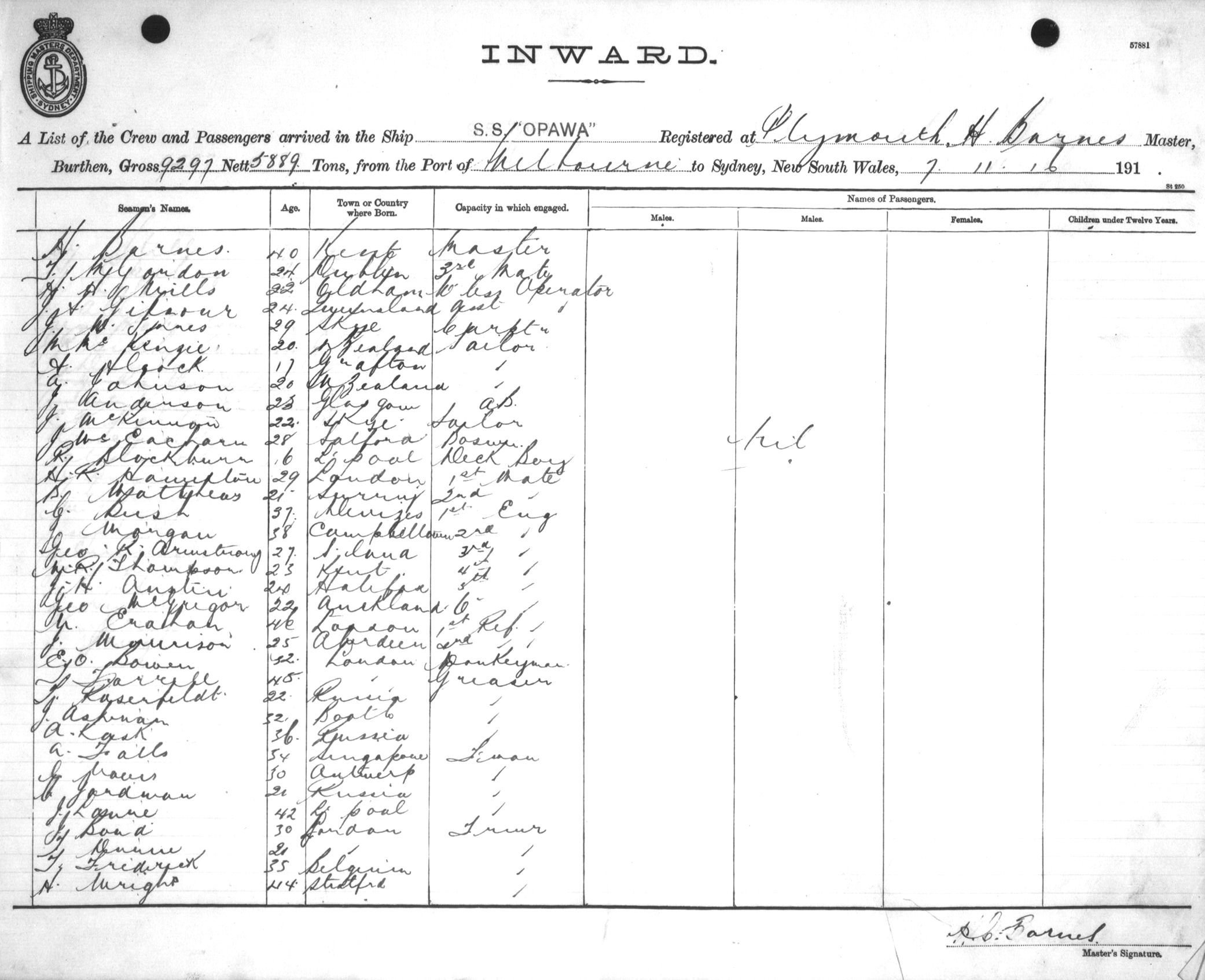 OPAWAOF PLYMOUTH, H. BARNES, MASTER, BURTHEN 9297/5889 TONS FROM THE PORT OF MELBOURNE TO SYDNEY, NEW SOUTH WALES, 7TH NOVEMBER 1916 |