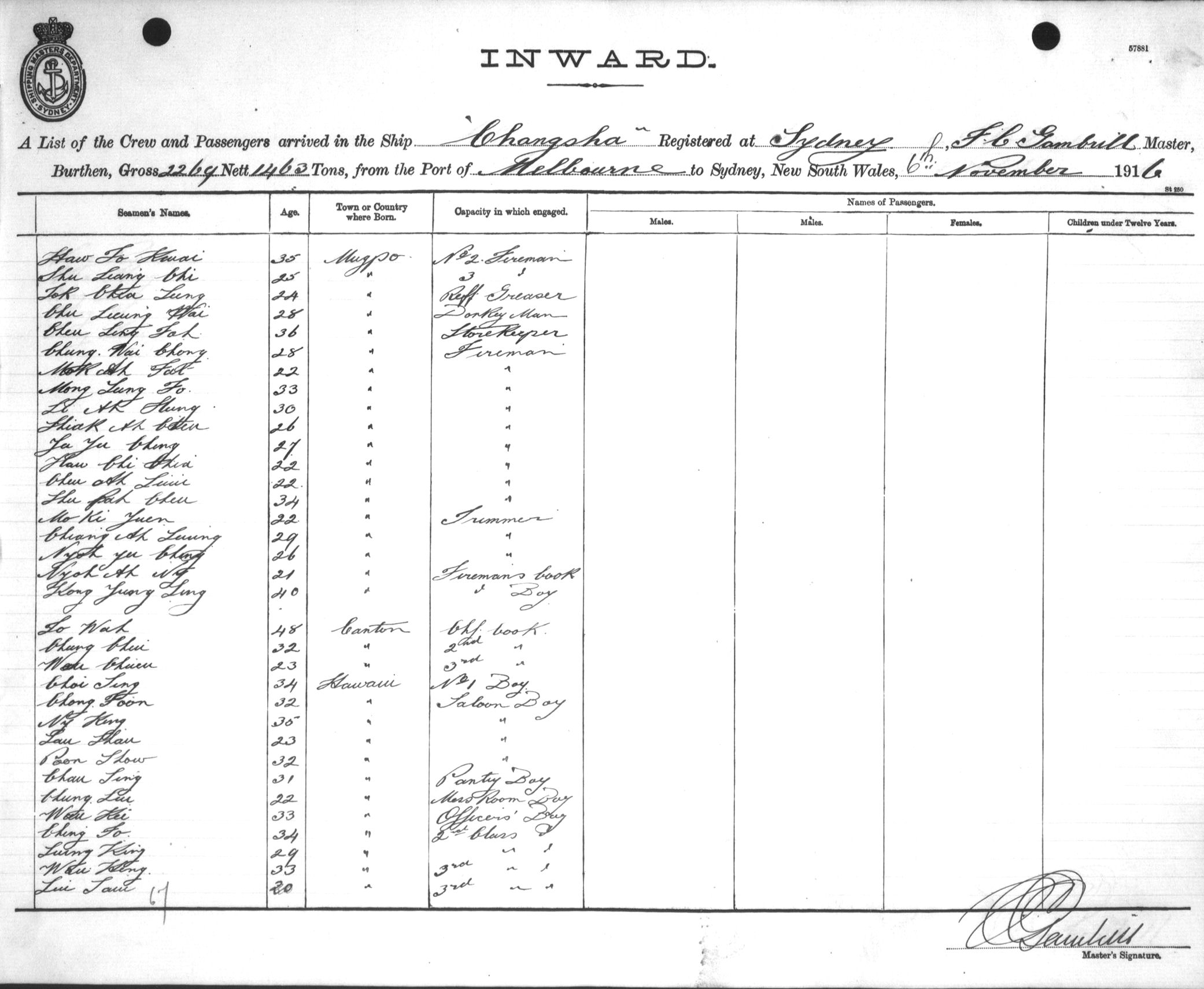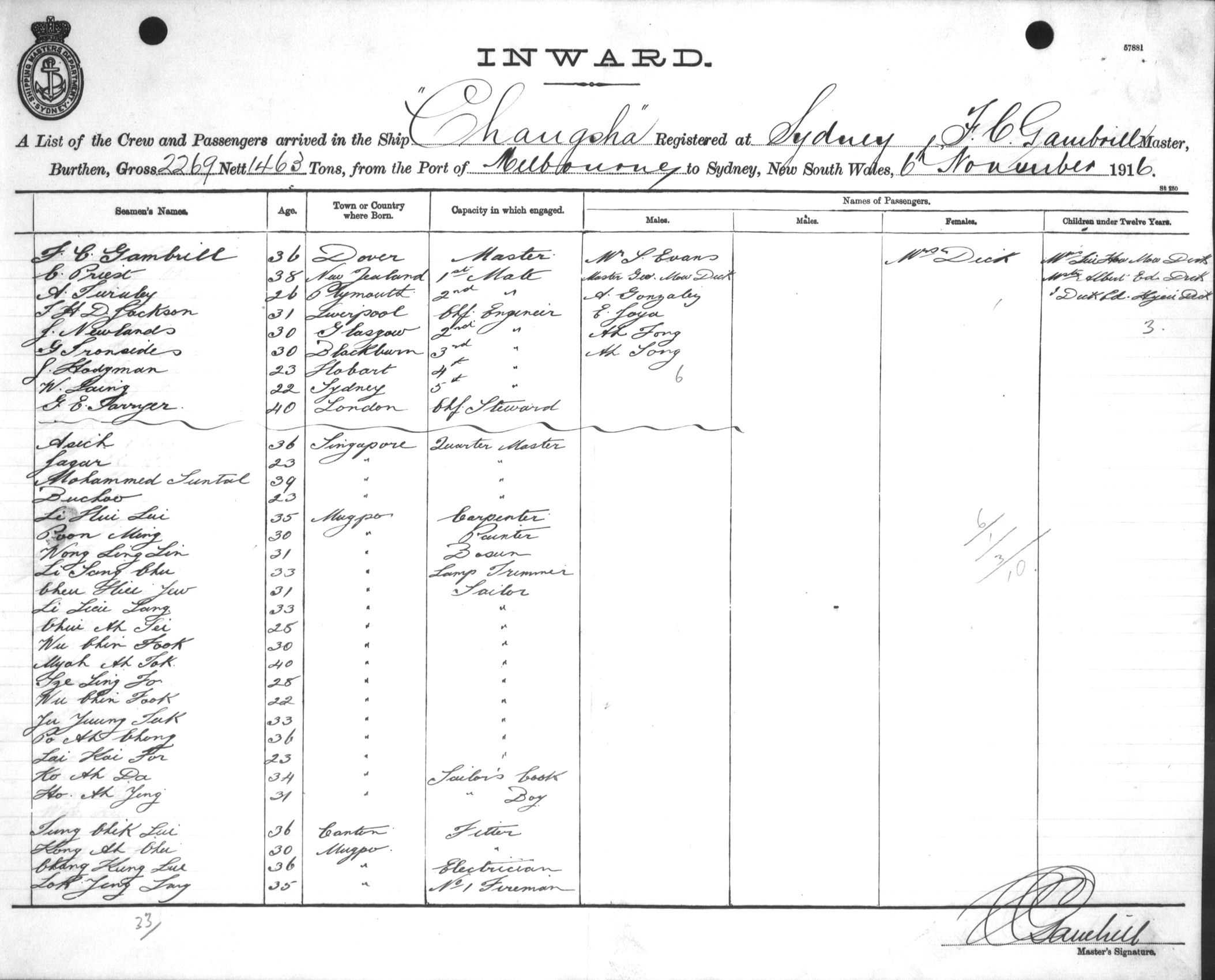 CHANGSHAOF SYDNEY, F. C. GAMBRILL, MASTER, BURTHEN 2269/1463 TONS FROM THE PORT OF MELBOURNE TO SYDNEY, NEW SOUTH WALES, 6TH NOVEMBER 1916 |