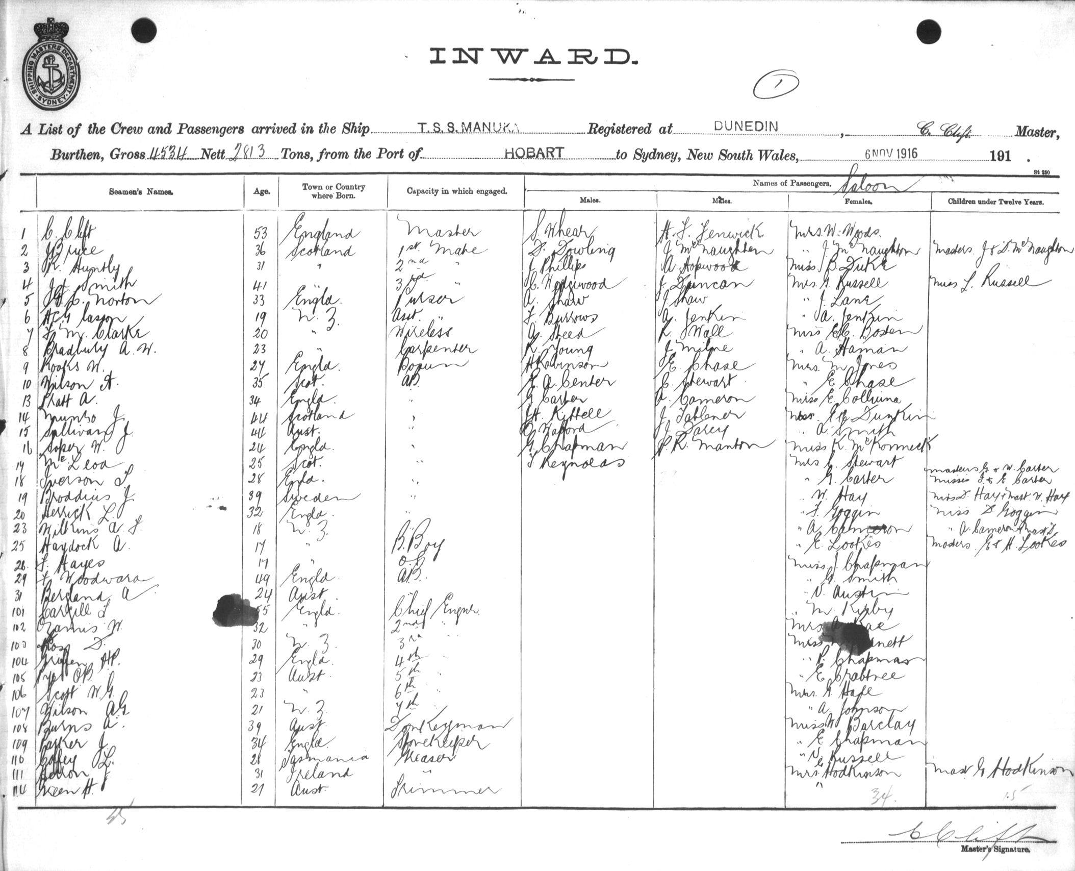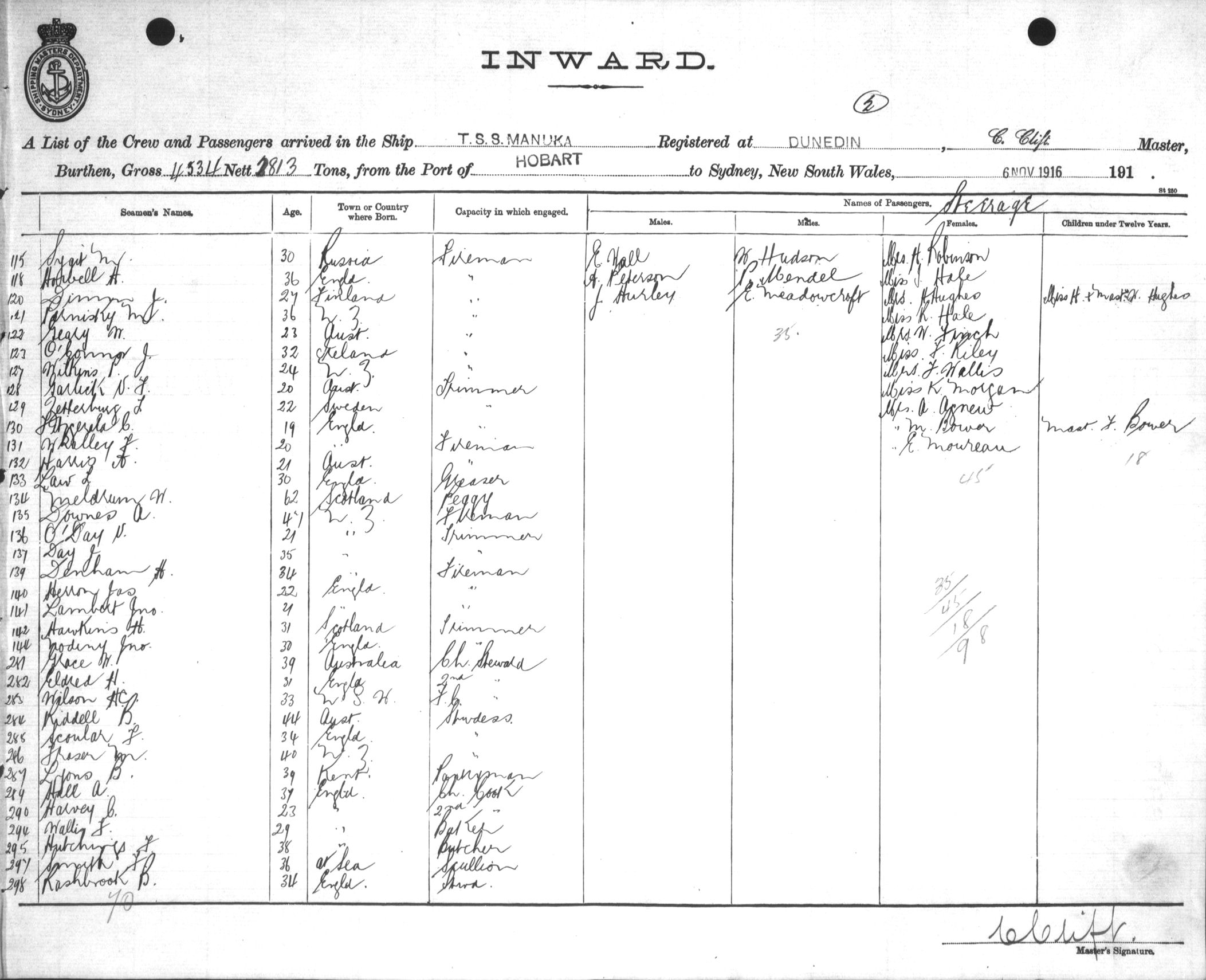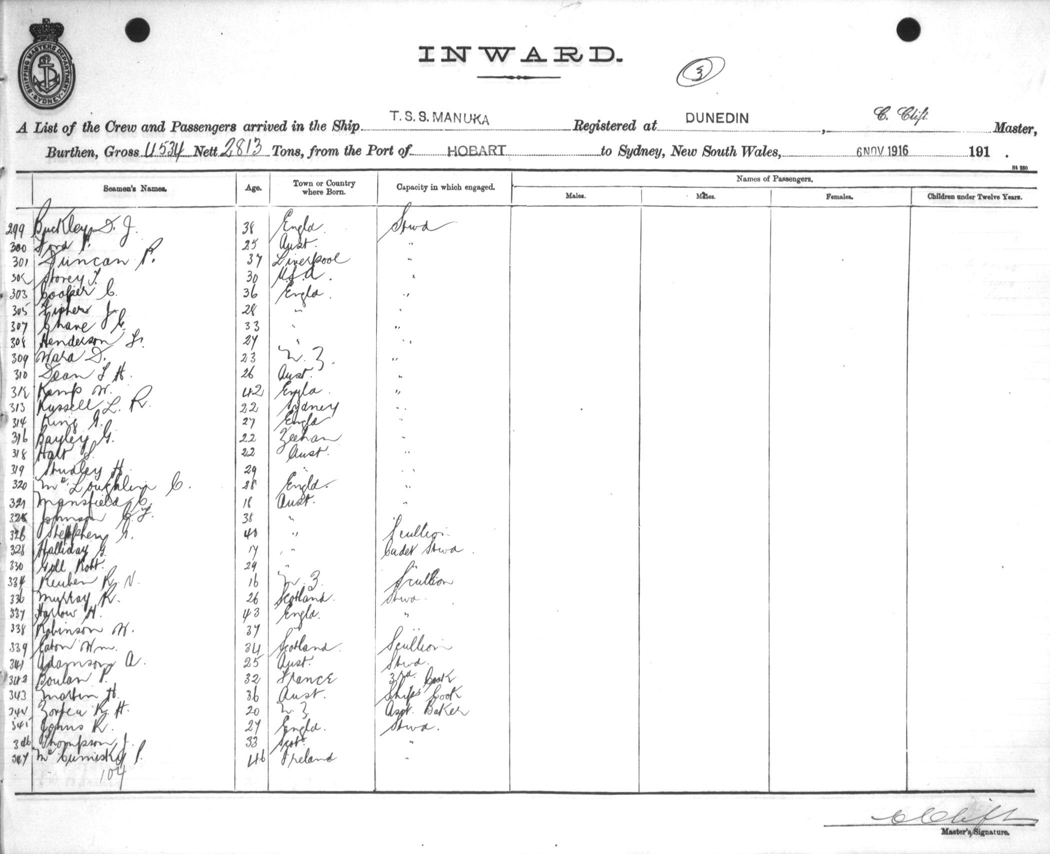 MANUKAOF DUNEDIN, C. CLIFT, MASTER, BURTHEN 4534/2813 TONS FROM THE PORT OF HOBART TO SYDNEY, NEW SOUTH WALES, 6TH NOVEMBER 1916 |