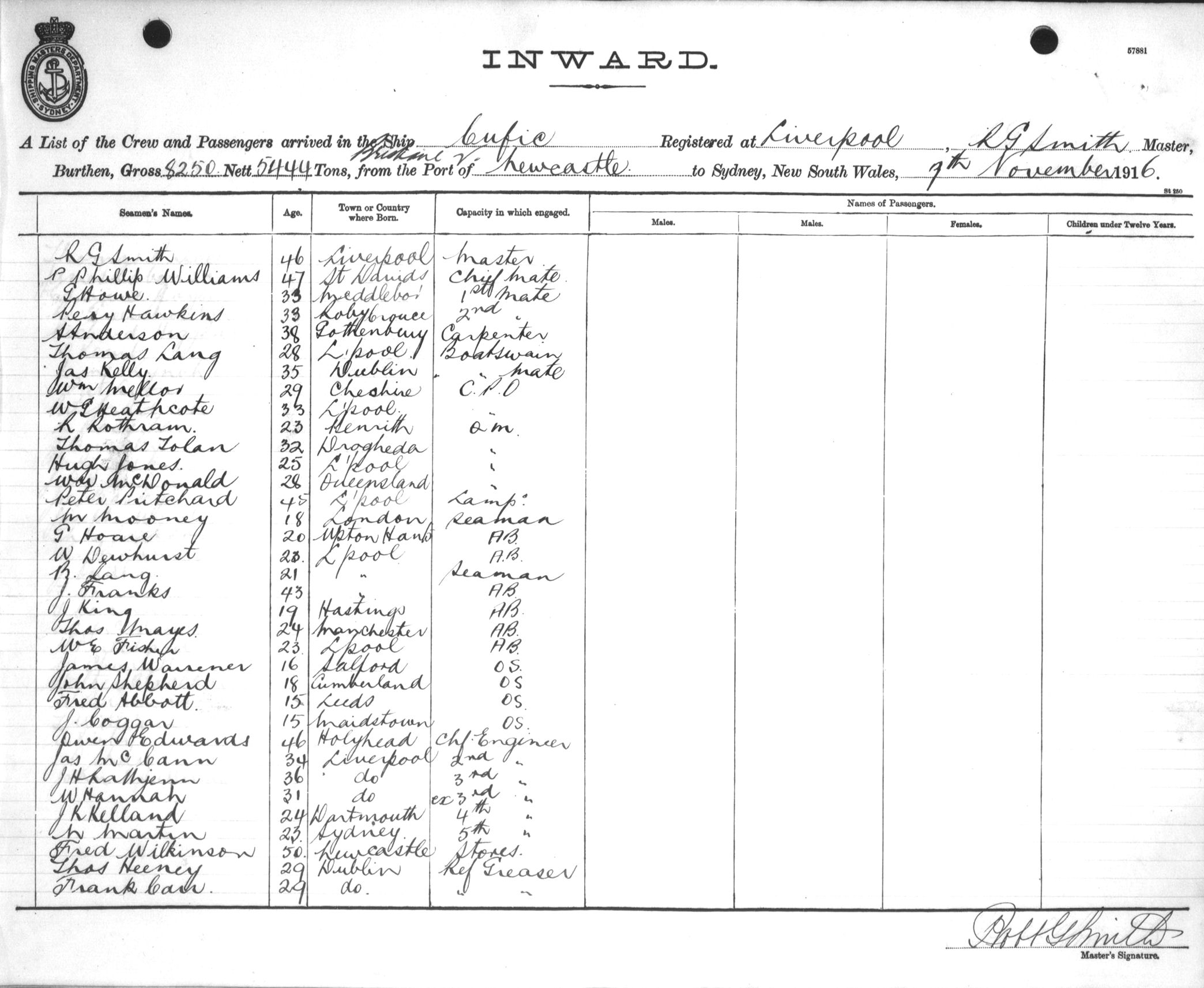 Mariners and ships in Australian Waters | CUFICOF LIVERPOOL, R. G. SMITH, MASTER, BURTHEN 8250/5444 TONS FROM THE PORT OF BRISBANE via NEWCASTLE TO SYDNEY, NEW SOUTH WALES, 9TH NOVEMBER 1916 |