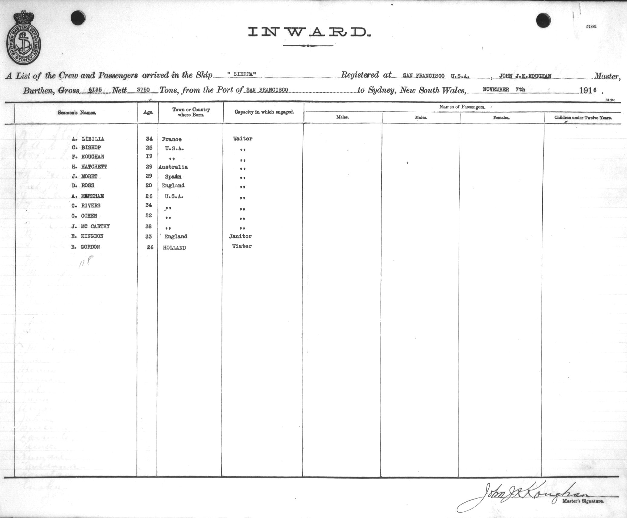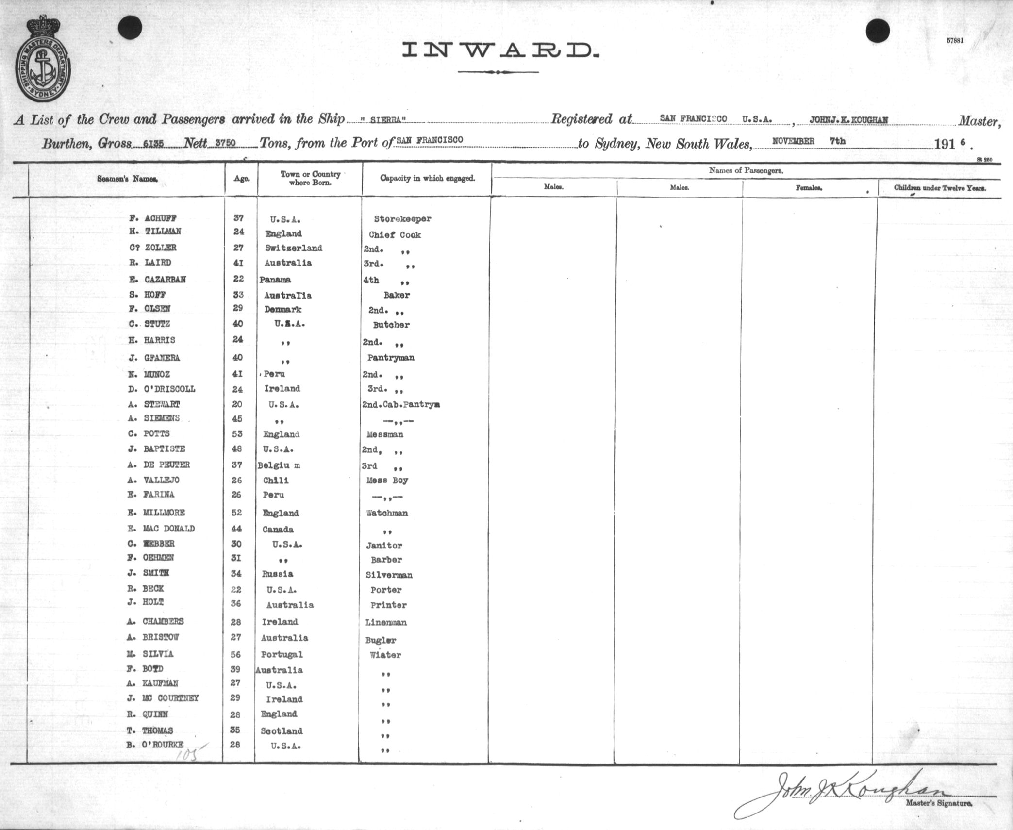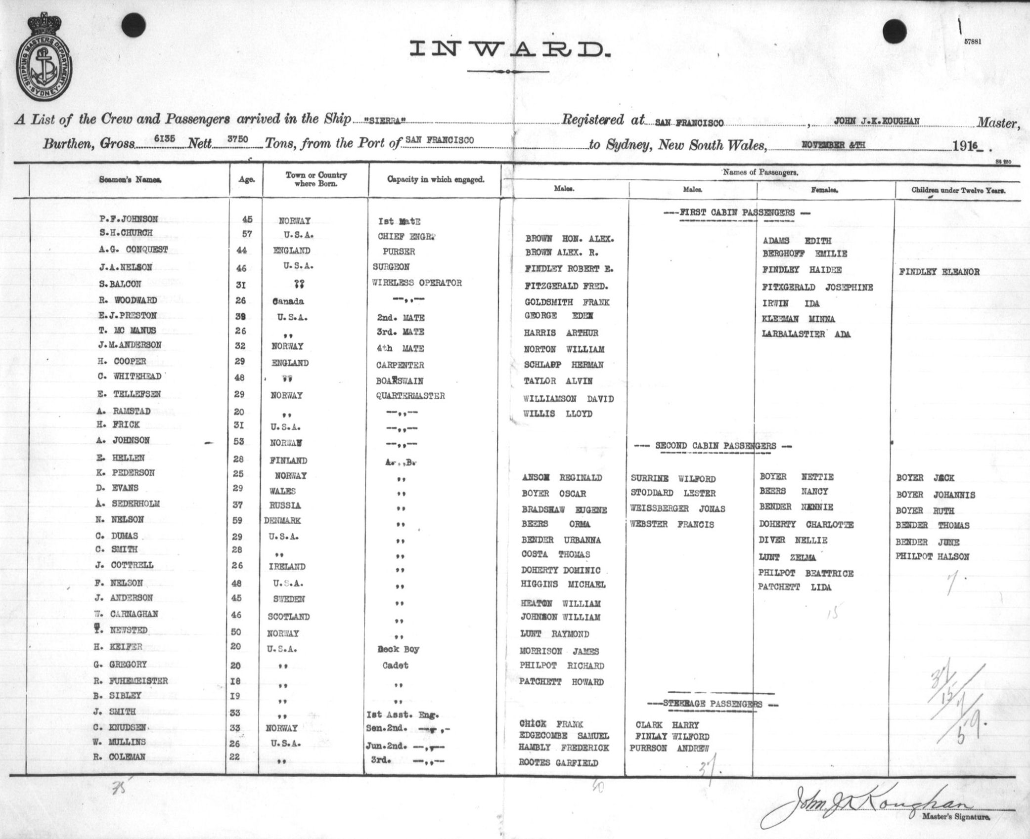 SIERRAOF SAN FRANCISCO, JOHN J. K. KOUGHAN, MASTER, BURTHEN 6155/3750 TONS FROM THE PORT OF SAN FRANCISCO TO SYDNEY, NEW SOUTH WALES, 7TH NOVEMBER 1916 |
