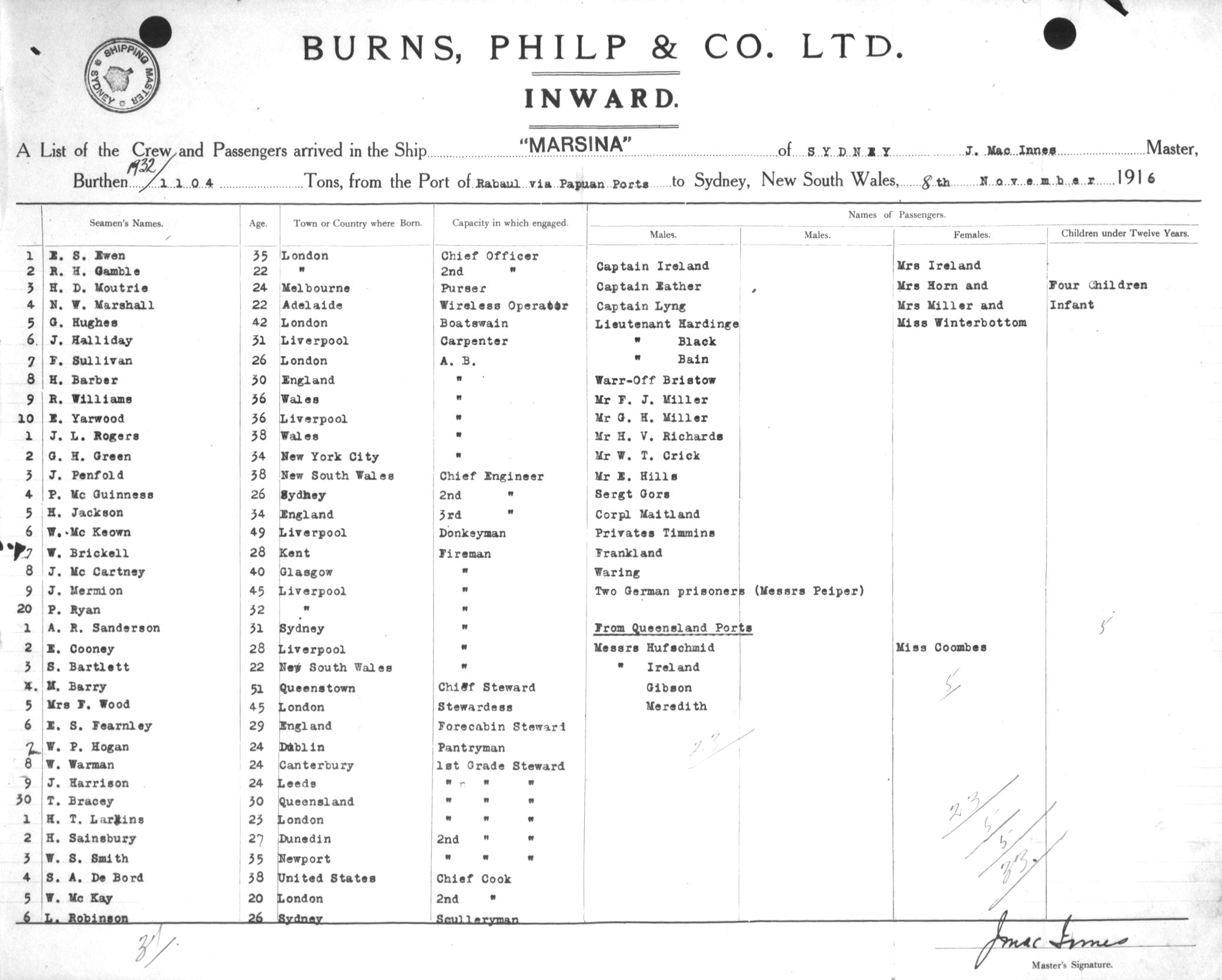 MARSINAOF SYDNEY, J. MACINNES, MASTER, BURTHEN 1932/1104 TONS FROM THE PORT OF RABAUL via PAPUAN PORTS TO SYDNEY, NEW SOUTH WALES, 8TH NOVEMBER 1916 |