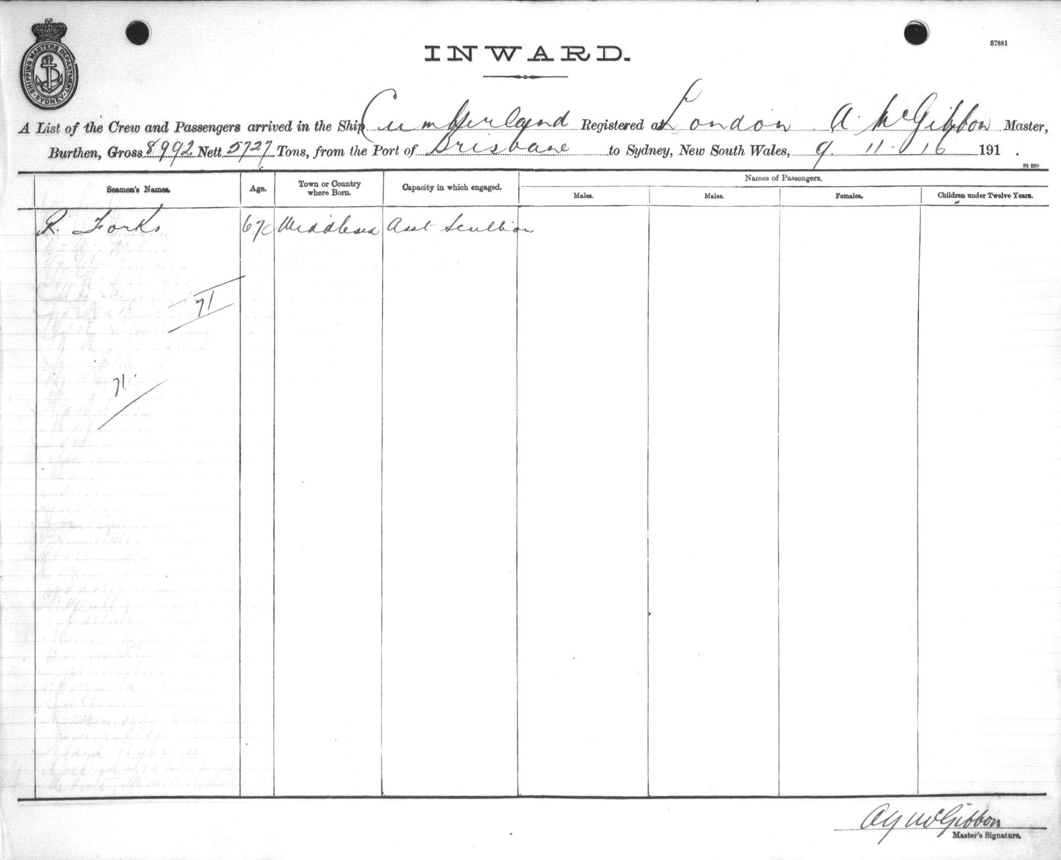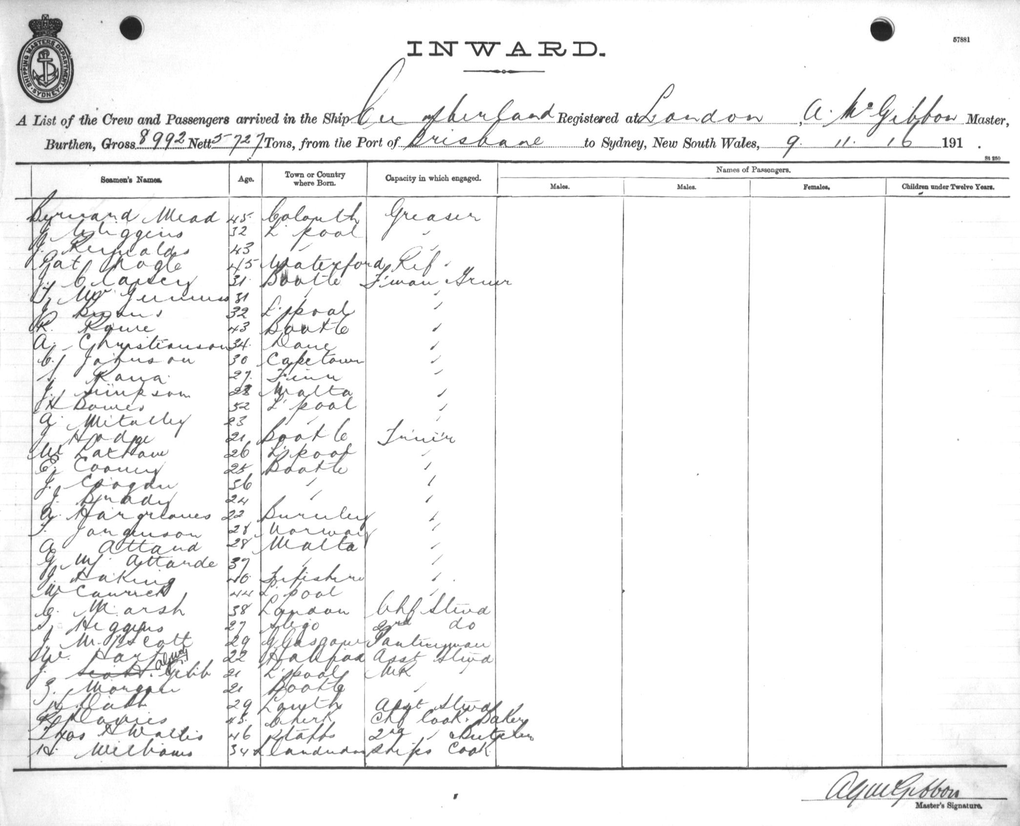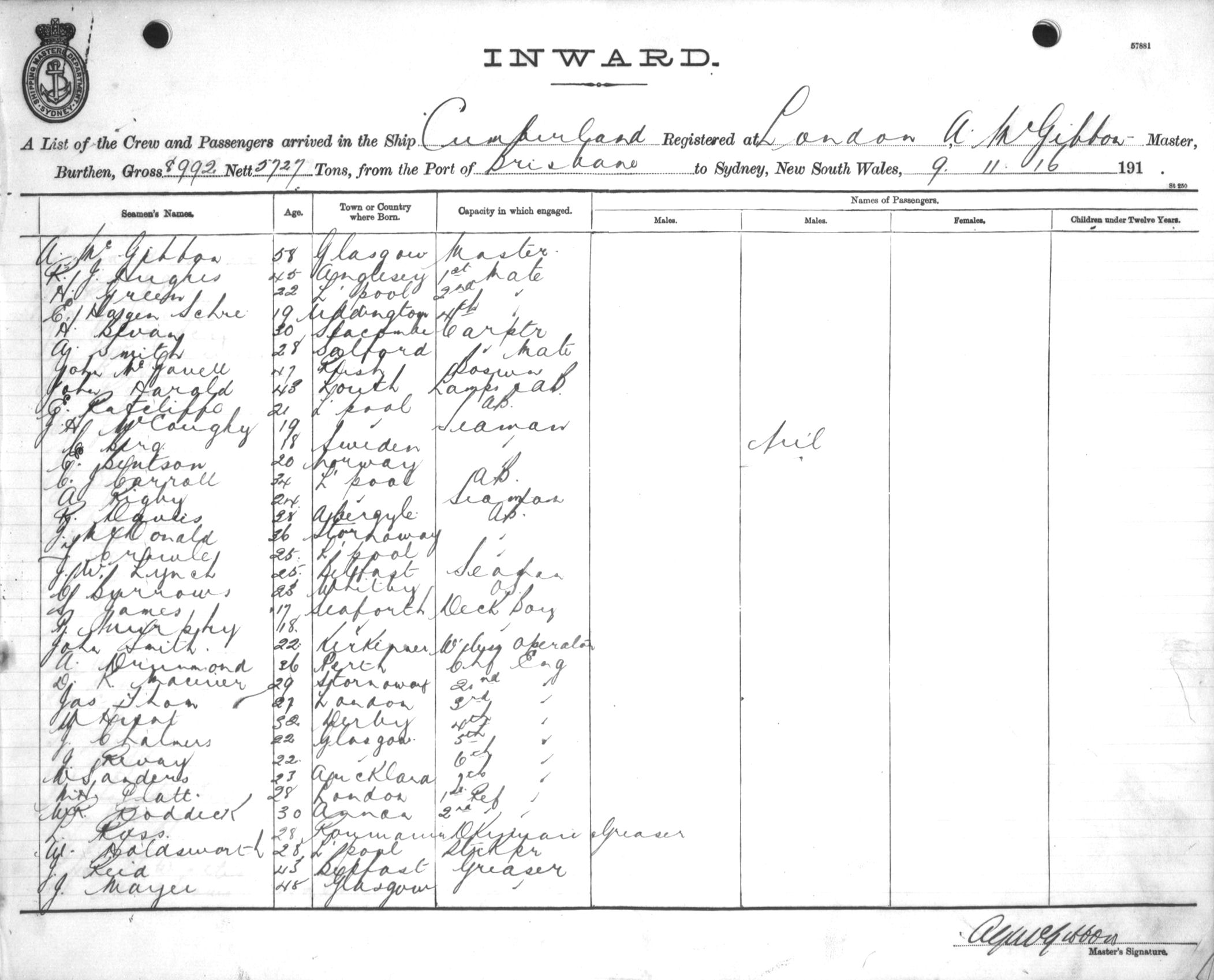 Mariners and ships in Australian Waters | CUMBERLANDOF LONDON, A. MCGIBBON, MASTER, BURTHEN 8992/5727 TONS FROM THE PORT OF BRISBANE TO SYDNEY, NEW SOUTH WALES, 9TH NOVEMBER 1916 |