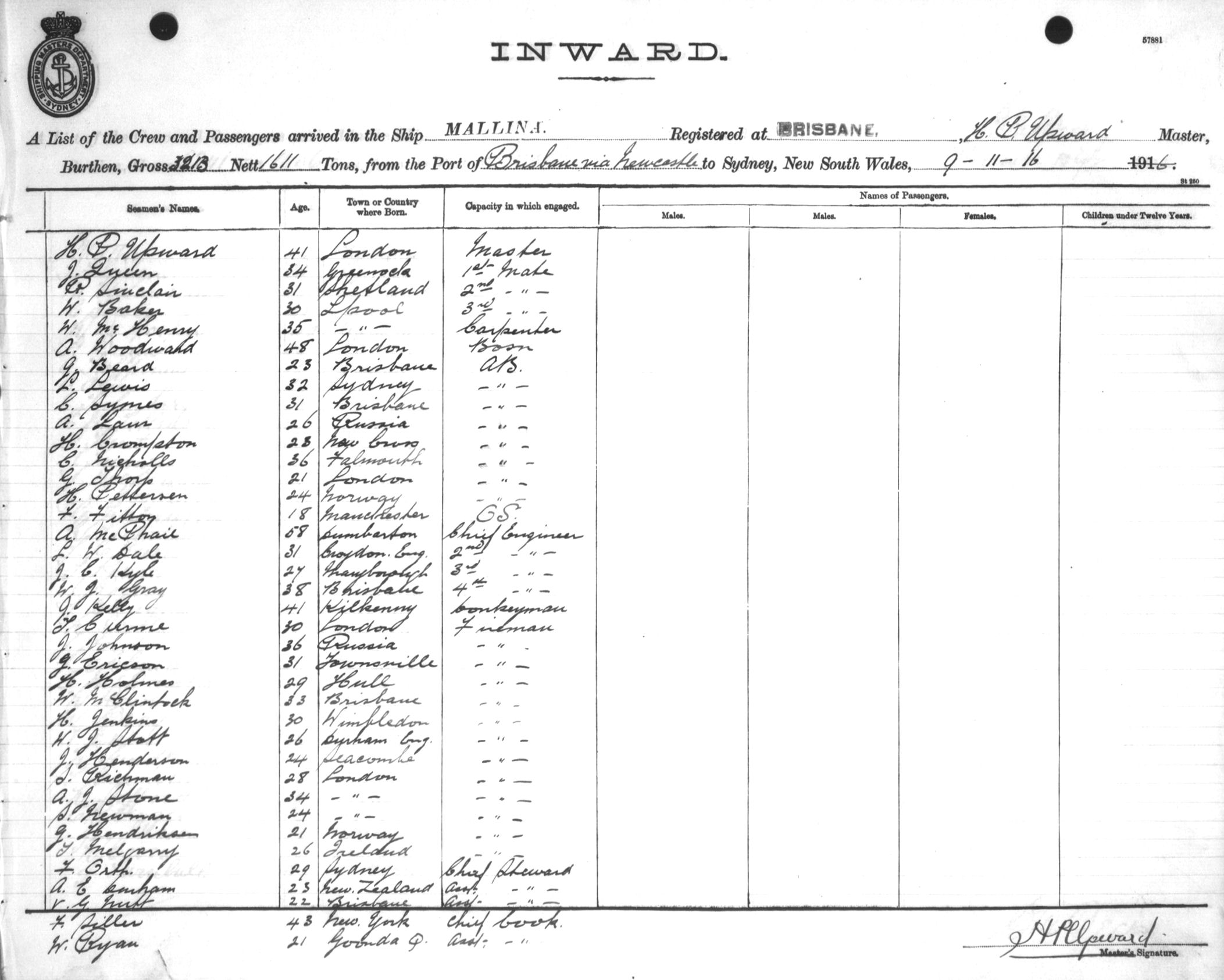 Mariners and ships in Australian Waters | MALLINAOF BRISBANE, H. P. UPWARD, MASTER, BURTHEN 3213/1611 TONS FROM THE PORT OF BRISBANE via NEWCASTLE TO SYDNEY, NEW SOUTH WALES, 9TH NOVEMBER 1916 |