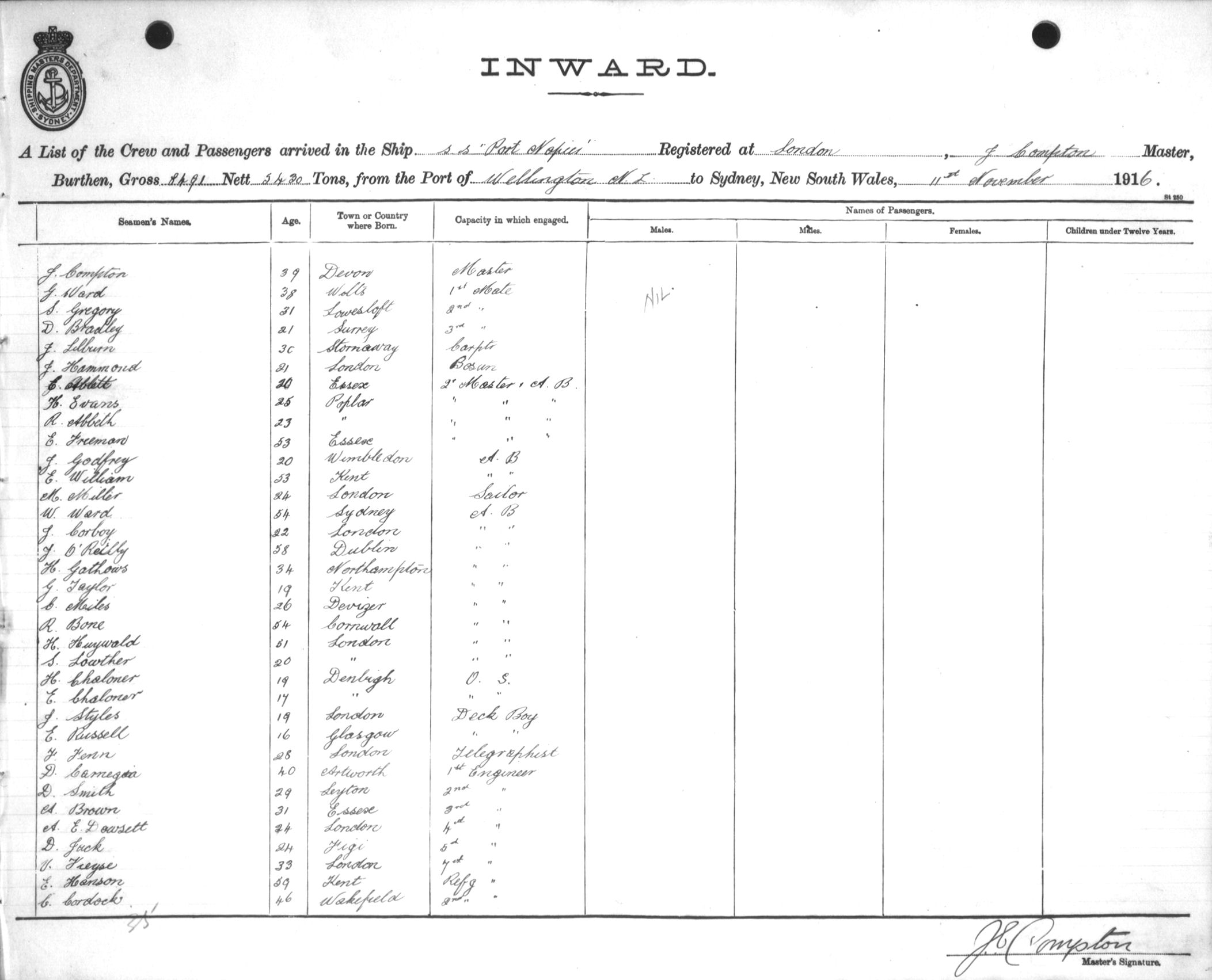 PORT NAPIEROF LONDON, J. COMPTON, MASTER, BURTHEN 8491/5430 TONS FROM THE PORT OF WELLINGTON, N.Z. TO SYDNEY, NEW SOUTH WALES, 11TH NOVEMBER 1916 |