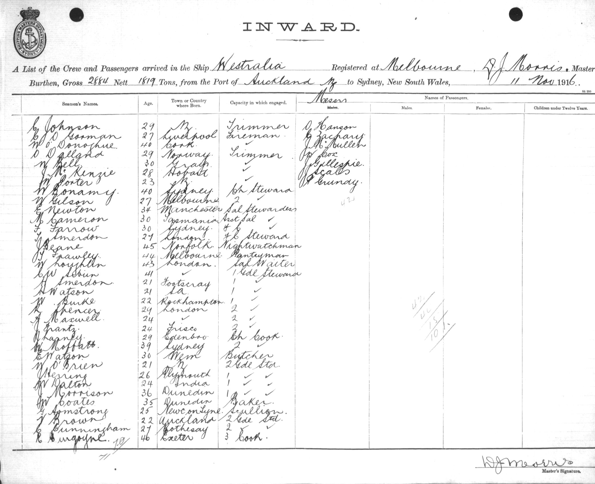 WESTRALIAOF MELBOURNE, D. J. MORRIS, MASTER, BURTHEN 2884/1819 TONS FROM THE PORT OF AUCKLAND TO SYDNEY, NEW SOUTH WALES, 11TH NOVEMBER 1916 |
