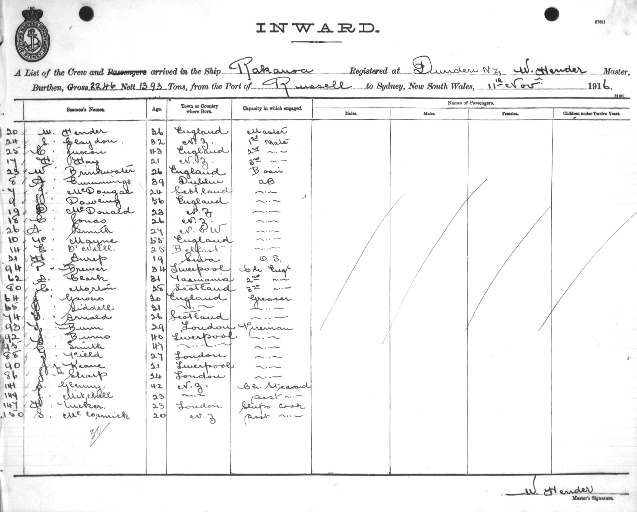 RAKANOAOF DUNEDIN, W. HENDER, MASTER, BURTHEN 2246/1393 TONS FROM THE PORT OF RUSSELL, N.Z. TO SYDNEY, NEW SOUTH WALES, 11TH NOVEMBER 1916 |