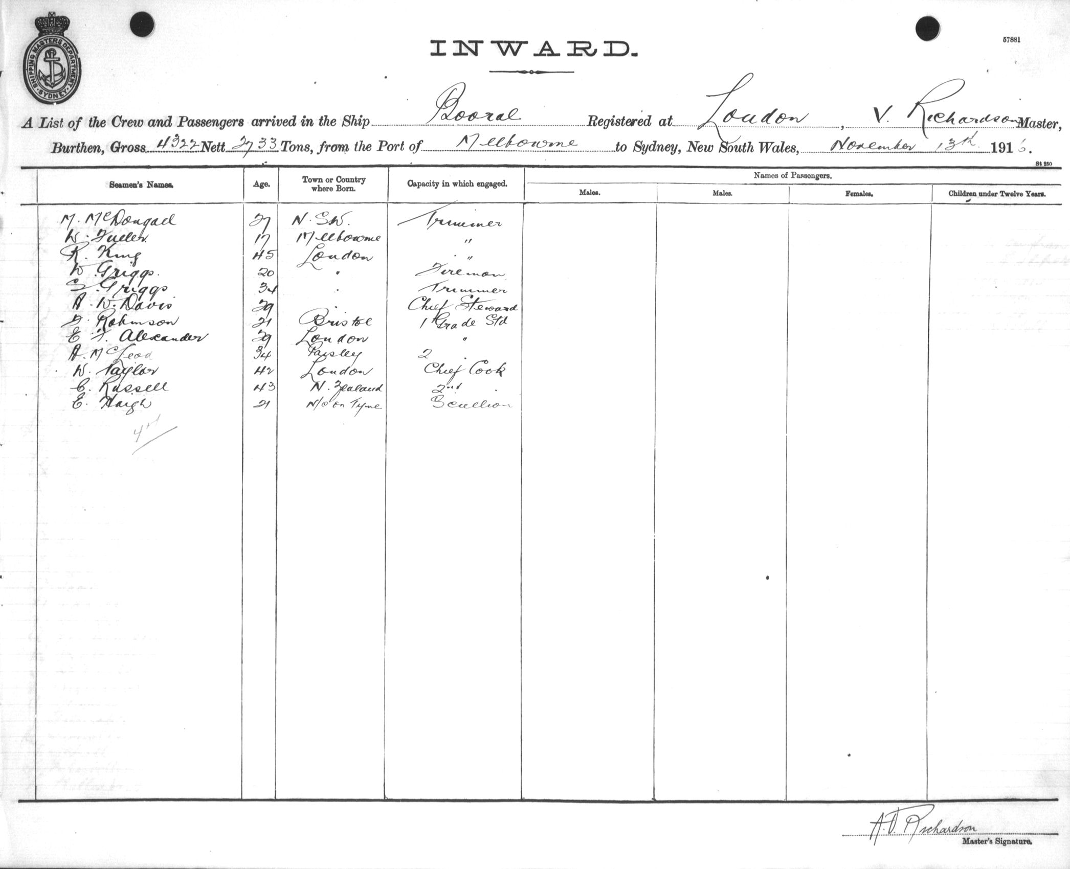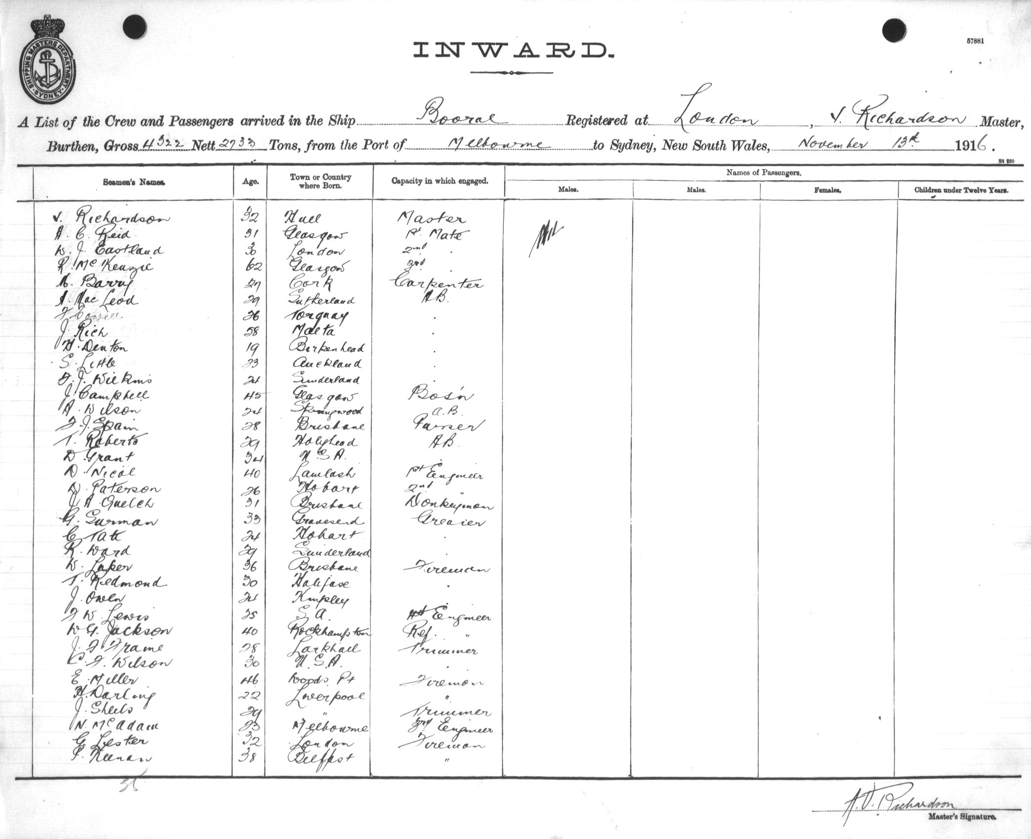 BOORALOF LONDON, V. RICHARDSON, MASTER, BURTHEN 4322/2733 TONS FROM THE PORT OF MELBOURNE TO SYDNEY, NEW SOUTH WALES, 13TH NOVEMBER 1916 |