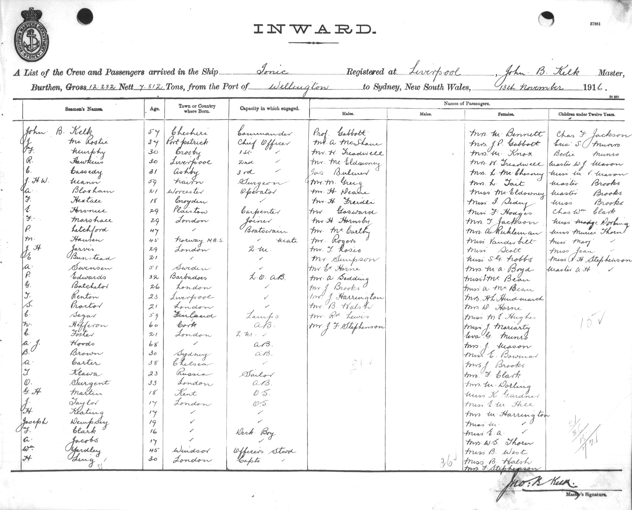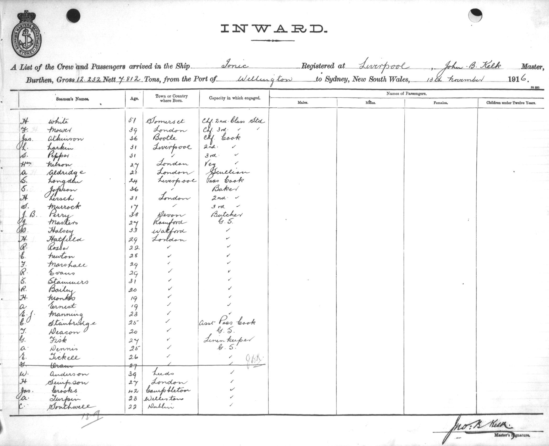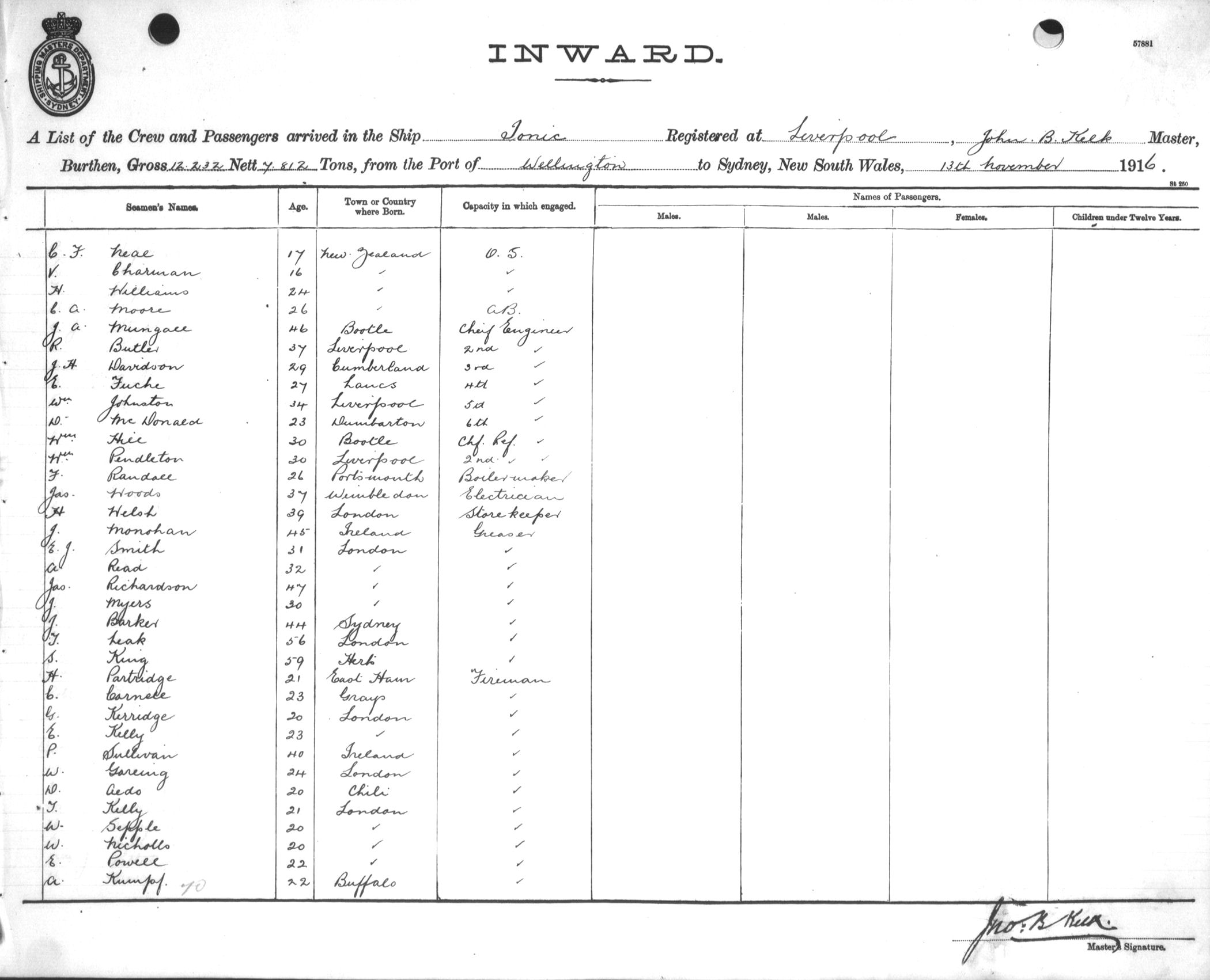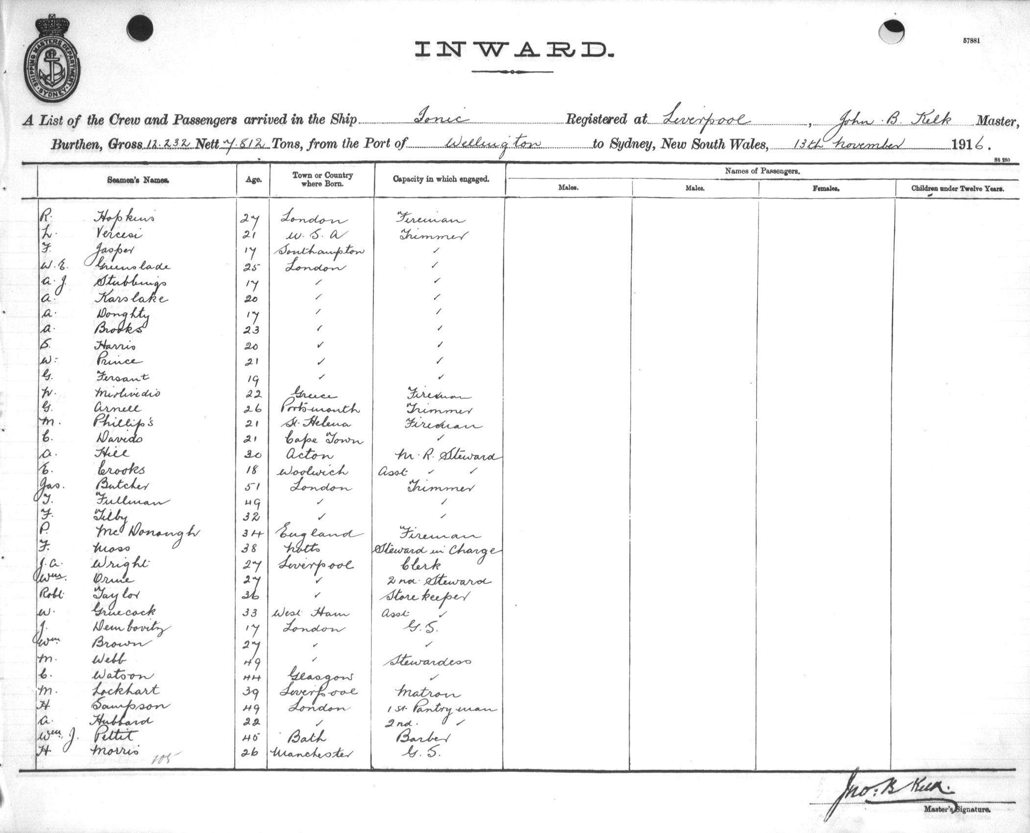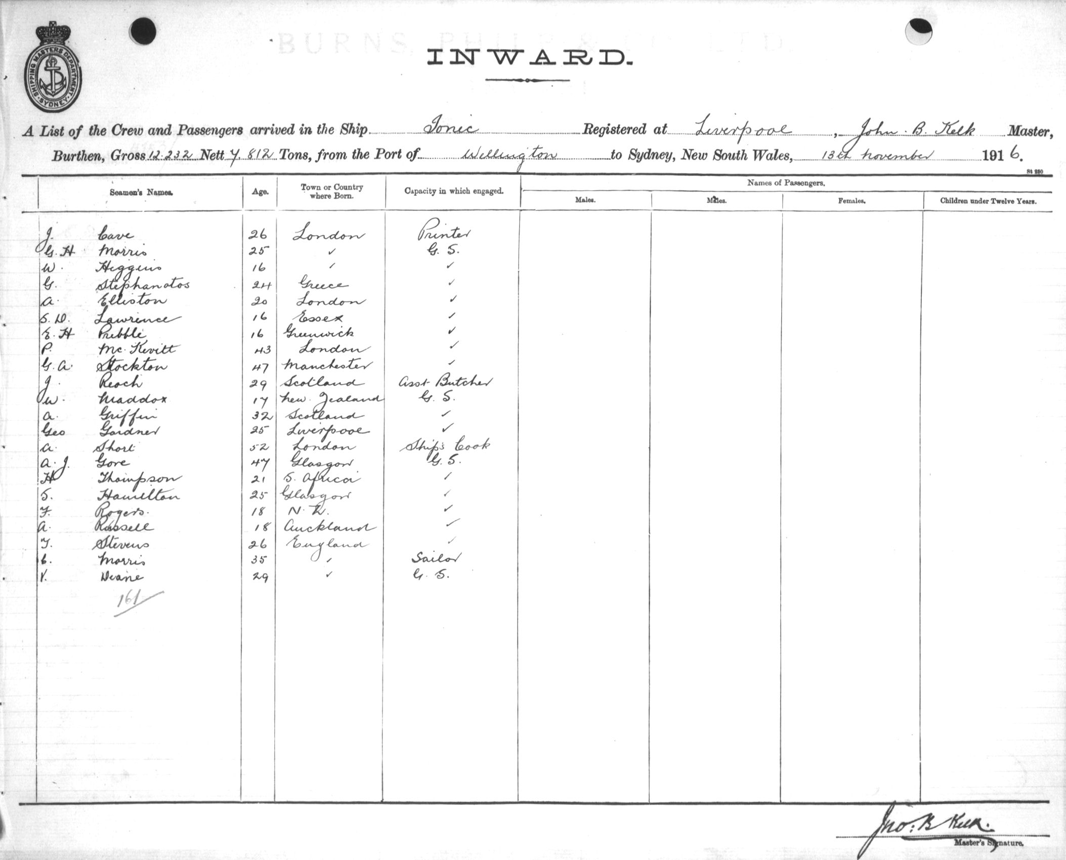 IONICOF LIVERPOOL, JOHN B. KELK, MASTER, BURTHEN 12232/7812 TONS FROM THE PORT OF WELLINGTON TO SYDNEY, NEW SOUTH WALES, 13TH NOVEMBER 1916 |