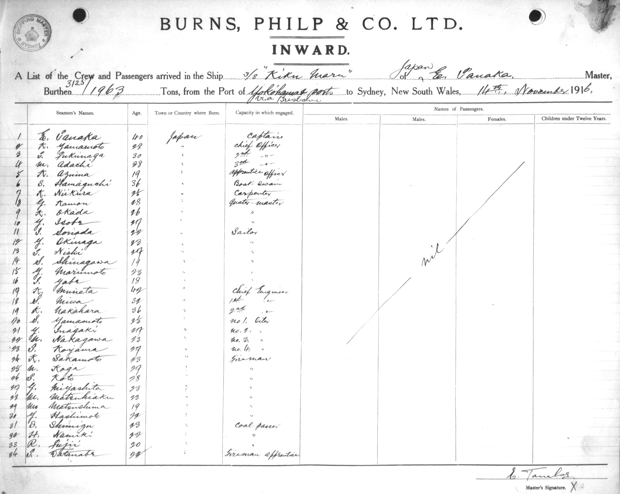 KIKU MARUOF JAPAN, E. TANAKA, MASTER, BURTHEN 3125/1963 TONS FROM THE PORT OF YOKOHAMA & PORTS via BRISBANE TO SYDNEY, NEW SOUTH WALES, 14TH NOVEMBER 1916 |