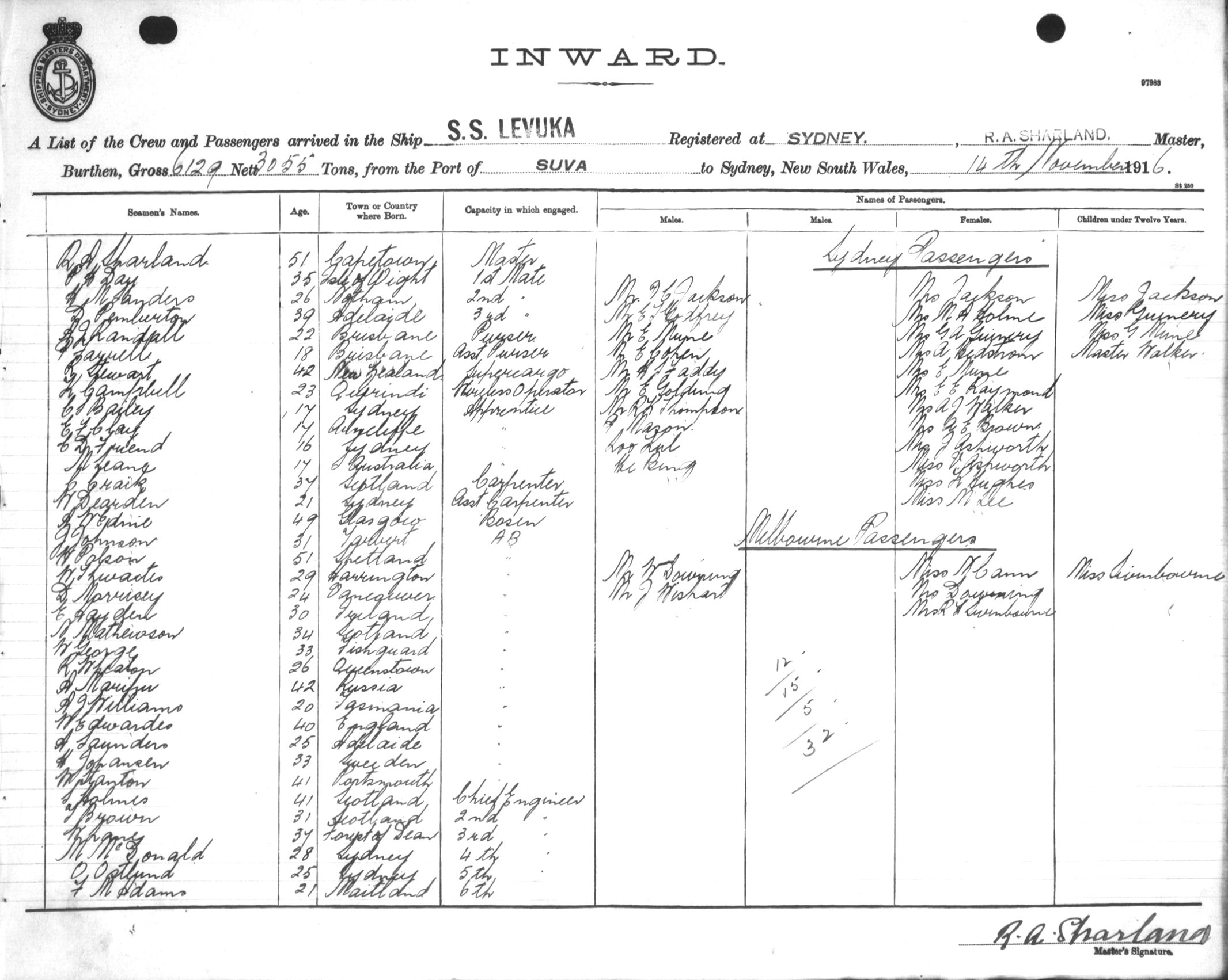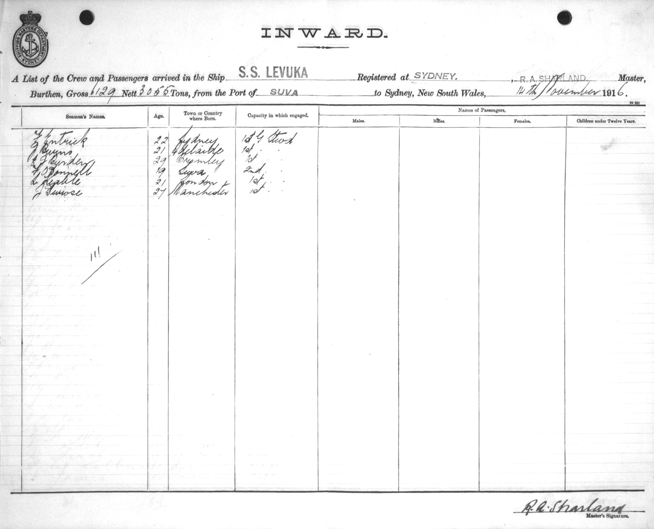LEVUKAOF SYDNEY, R. A. SHARLAND, MASTER, BURTHEN 6129/3055 TONS FROM THE PORT OF SUVA TO SYDNEY, NEW SOUTH WALES, 14TH NOVEMBER 1916 |