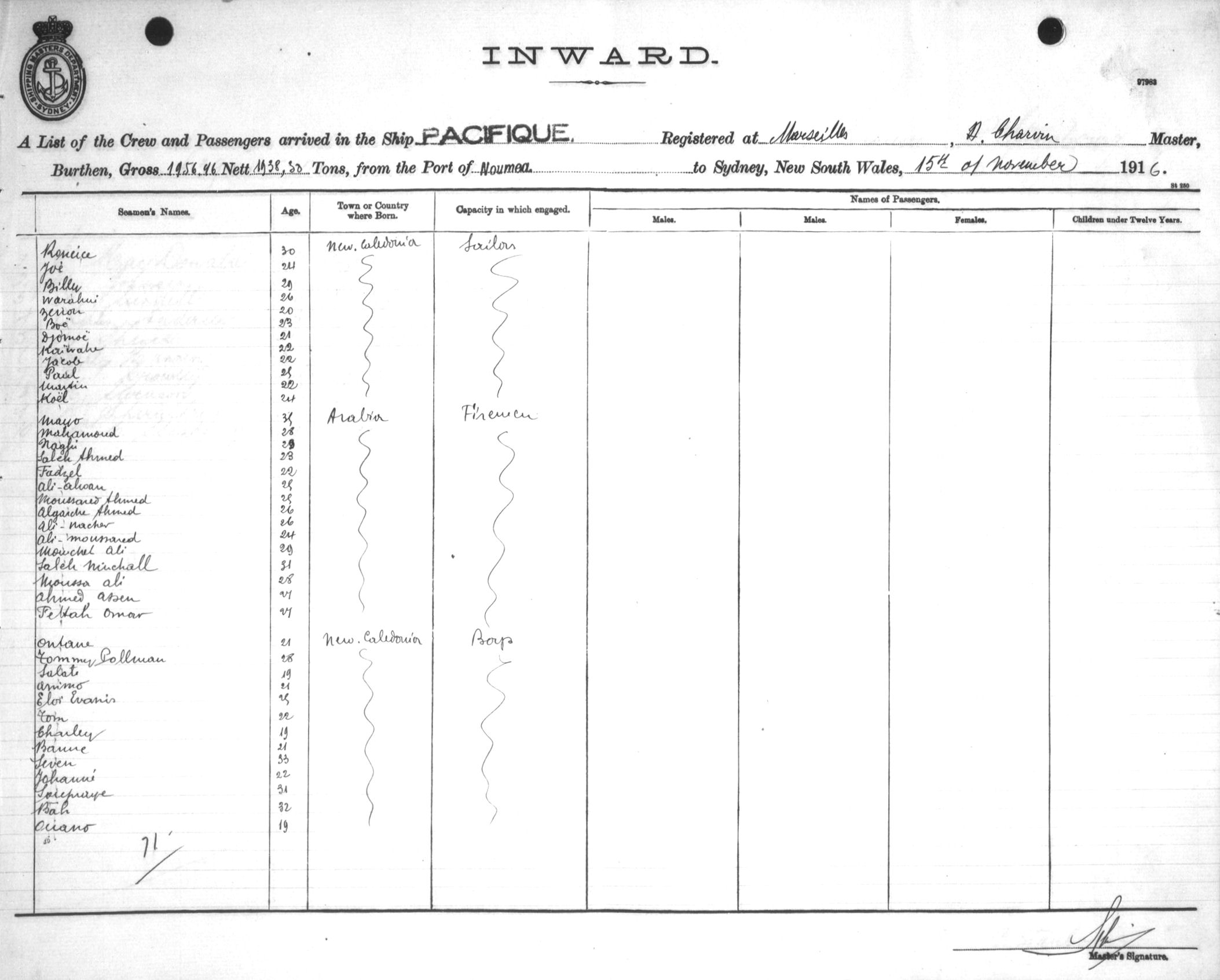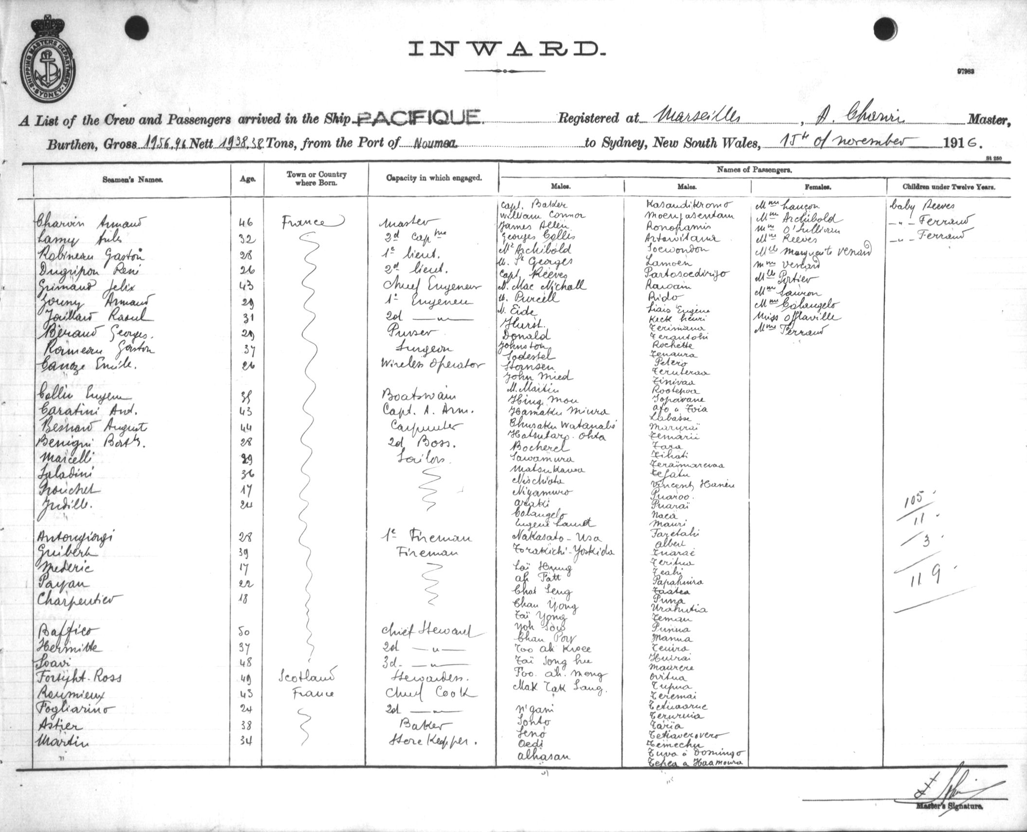 PACIFIQUEOF MARSEILLE, A. CHARVIN, MASTER, BURTHEN 1956.96/1938.38 TONS FROM THE PORT OF NOUMEA TO SYDNEY, NEW SOUTH WALES, 15TH NOVEMBER 1916 |