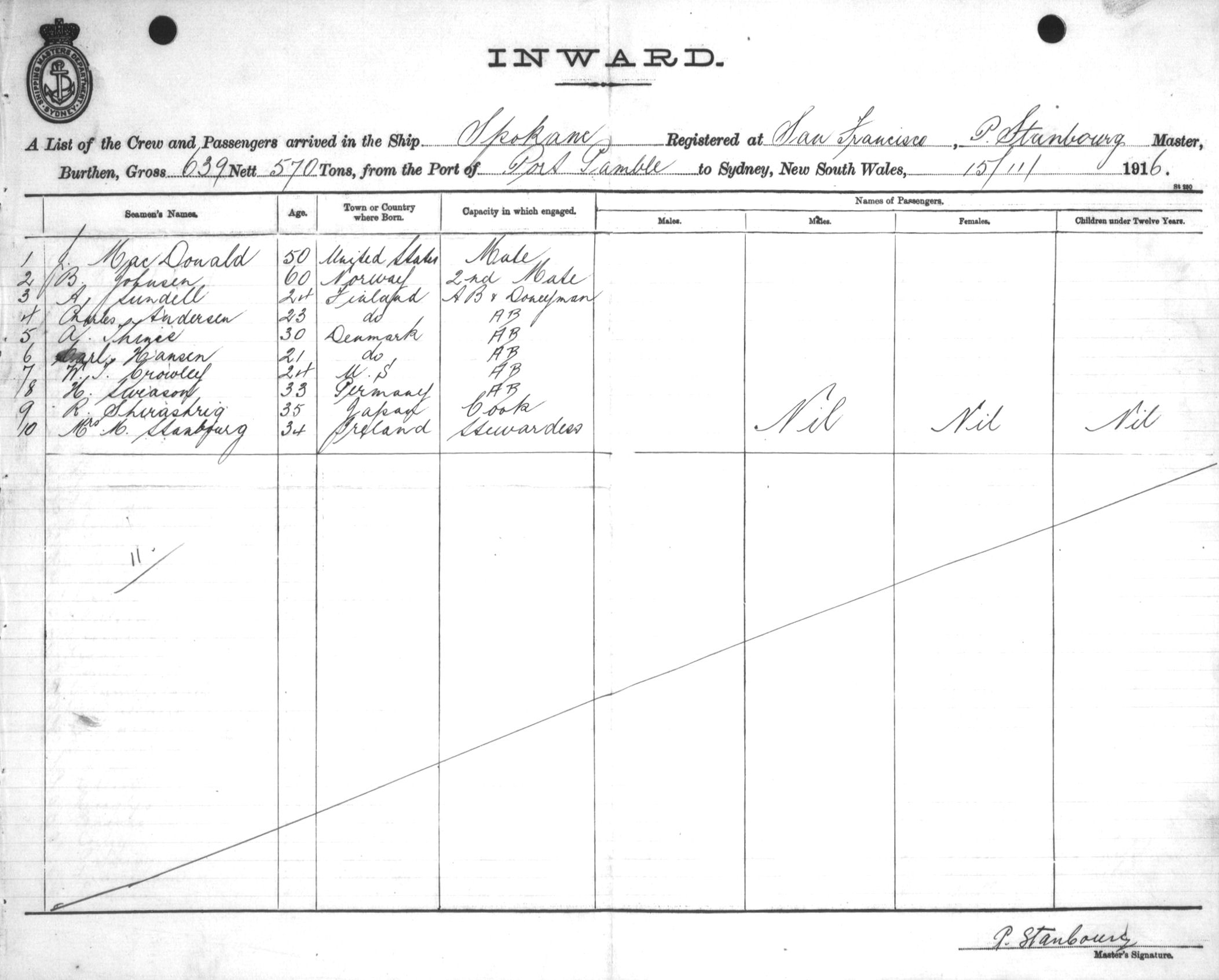SPOKANEOF SAN FRANCISCO, P. STANBOURG, MASTER, BURTHEN 639/570 TONS FROM THE PORT OF PORT GAMBLE TO SYDNEY, NEW SOUTH WALES, 15TH NOVEMBER 1916 |
