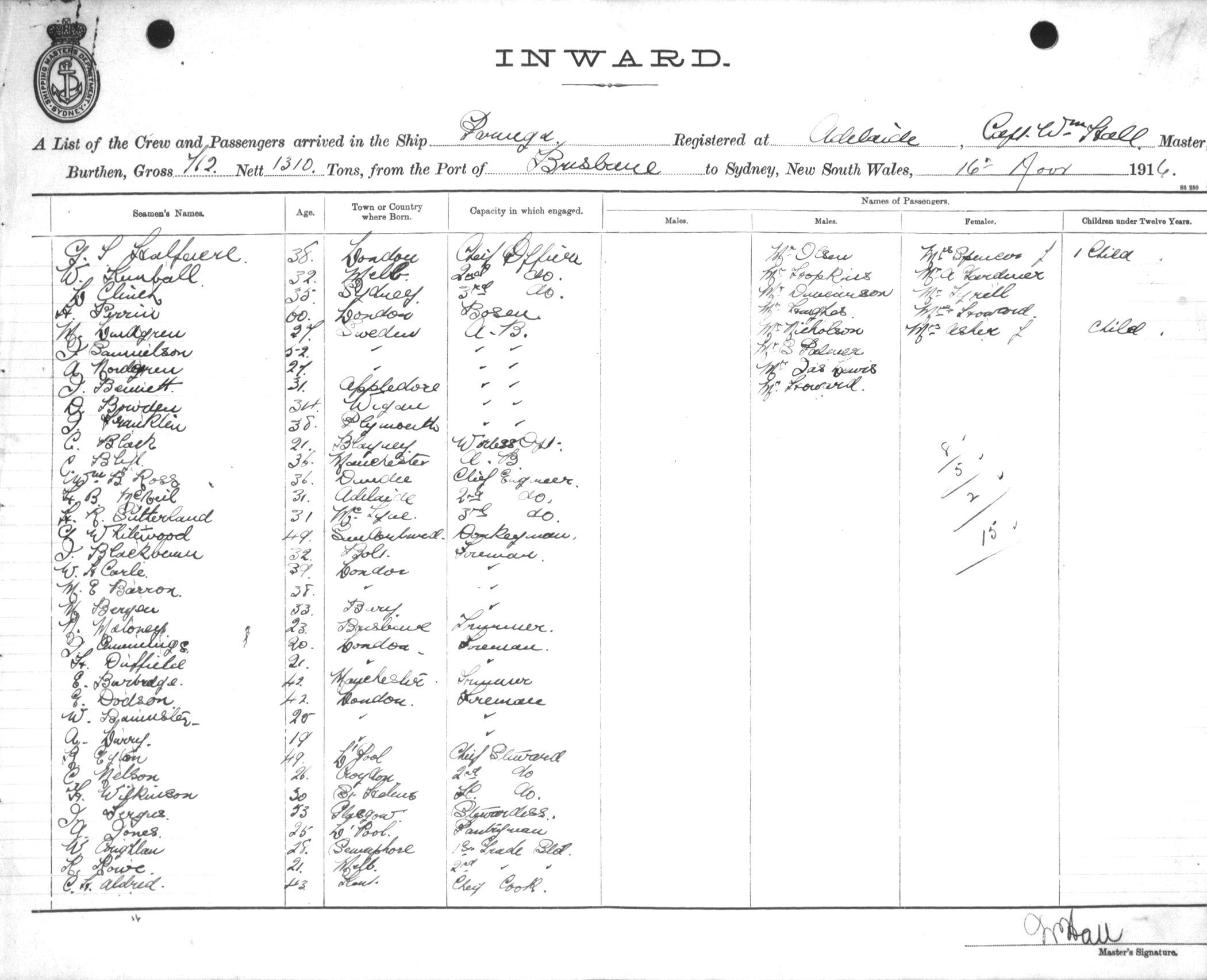 PARINGAOF ADELAIDE, WILLIAM HALL, MASTER, BURTHEN 1310/712 TONS FROM THE PORT OF BRISBANE TO SYDNEY, NEW SOUTH WALES, 16TH NOVEMBER 1916 |