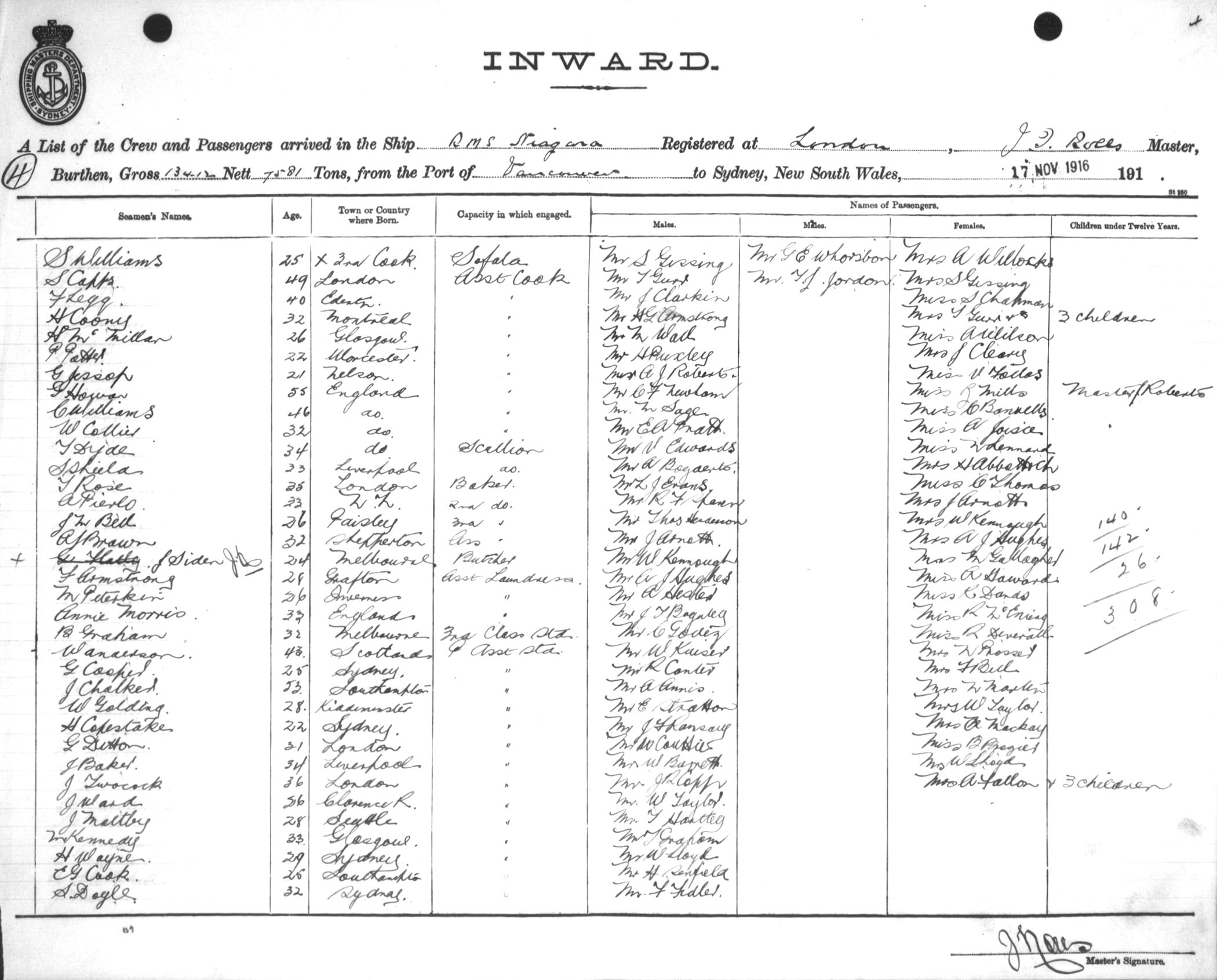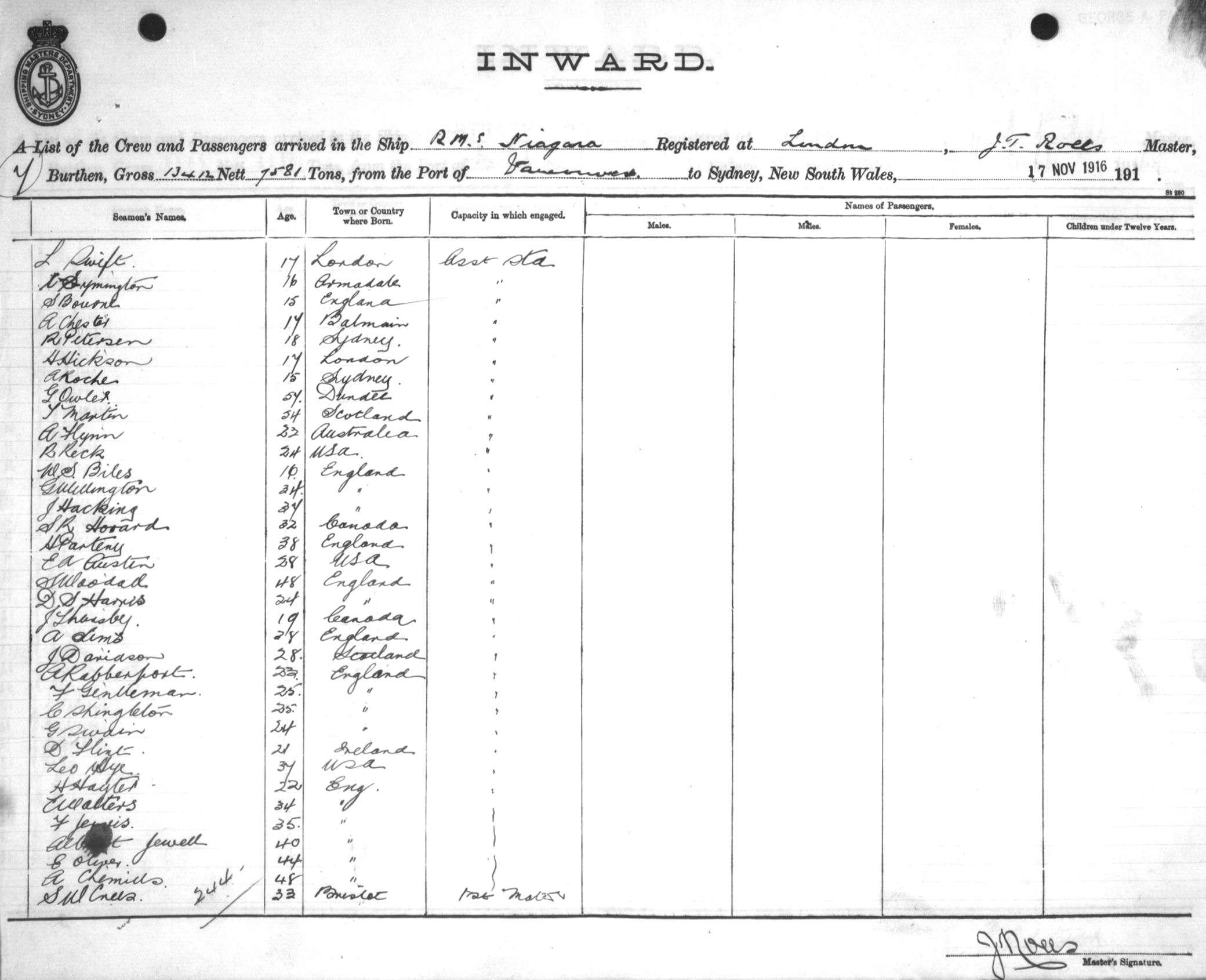 NIAGARAOF LONDON, J. T. ROLLS, MASTER, BURTHEN 13412/7581 TONS FROM THE PORT OF VANCOUVER TO SYDNEY, NEW SOUTH WALES, 17TH NOVEMBER 1916 |