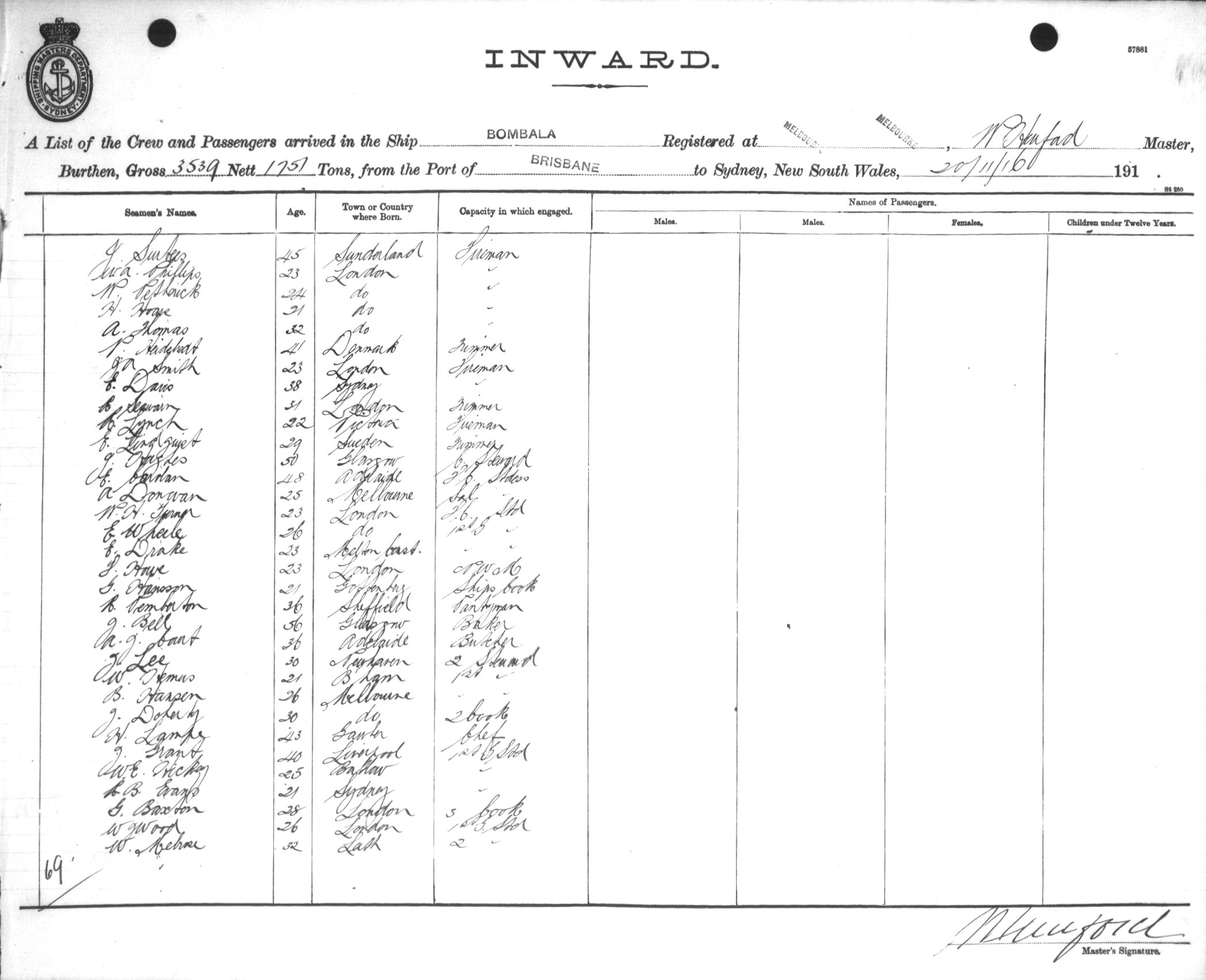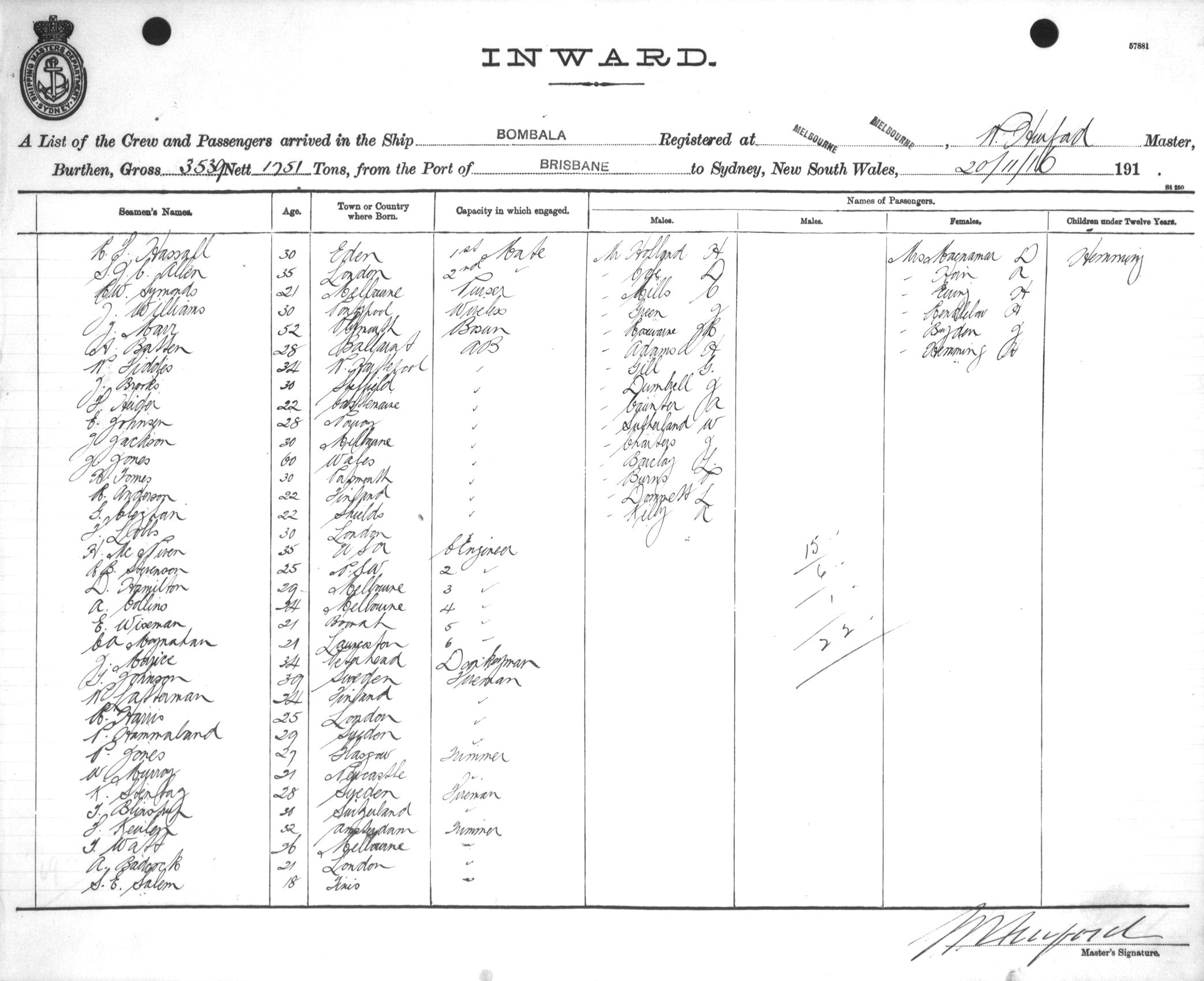 BOMBALAOF MELBOURNE, W. HURFORD, MASTER, BURTHEN 3539/1751 TONS FROM THE PORT OF BRISBANE TO SYDNEY, NEW SOUTH WALES, 20TH NOVEMBER 1916 |