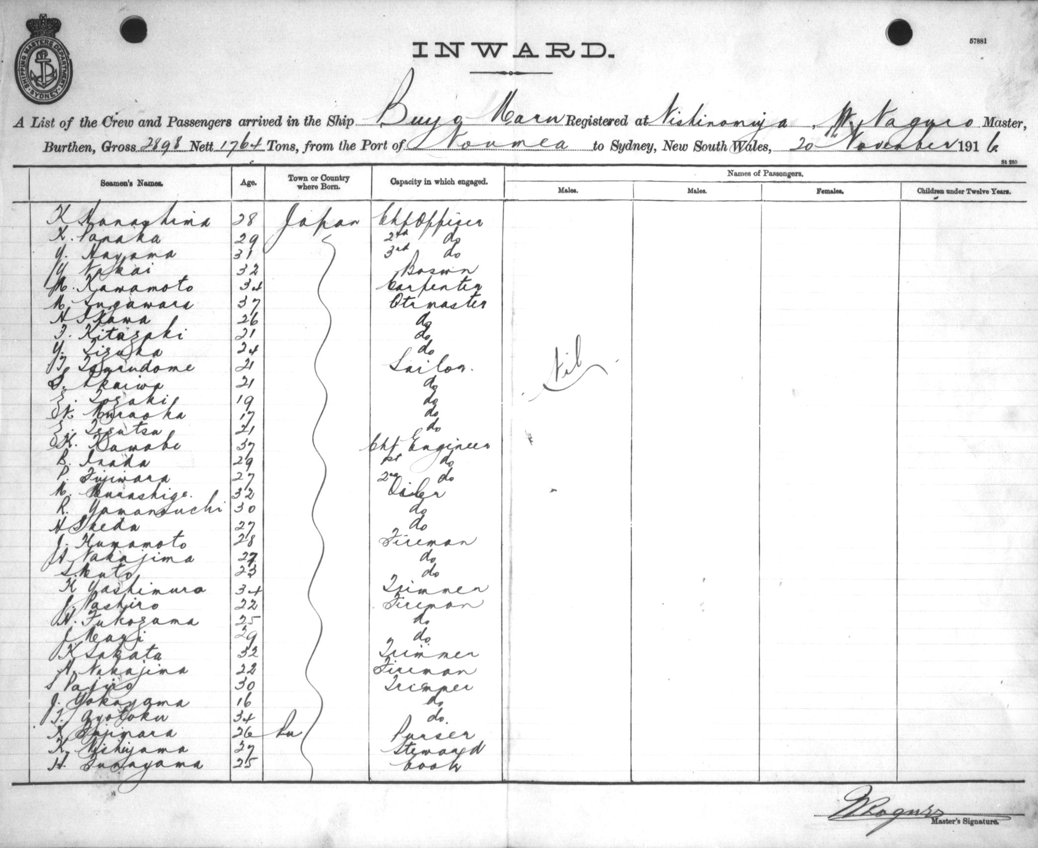 Mariners and ships in Australian Waters | BUYGO MARUOF NISHINOMIYA, W. NAGURO, MASTER, BURTHEN 2898/1764 TONS FROM THE PORT OF NOUMEA TO SYDNEY, NEW SOUTH WALES, 20 NOVEMBER 1916 |