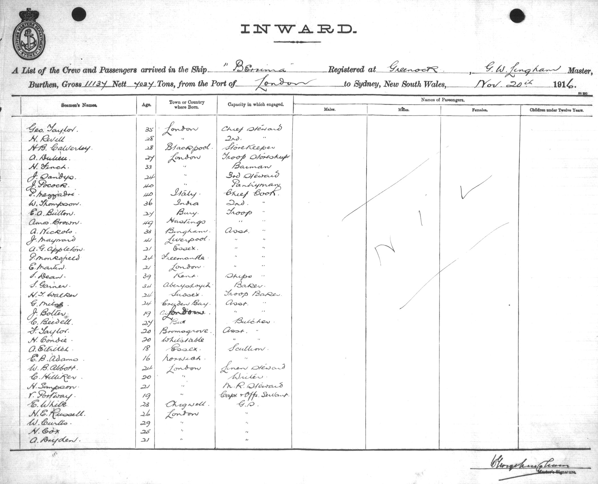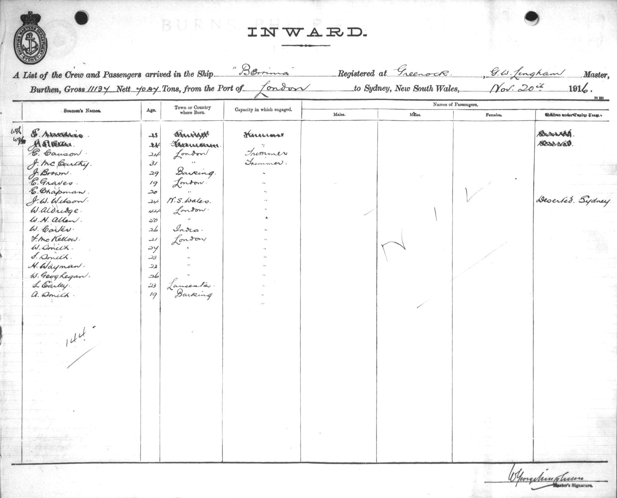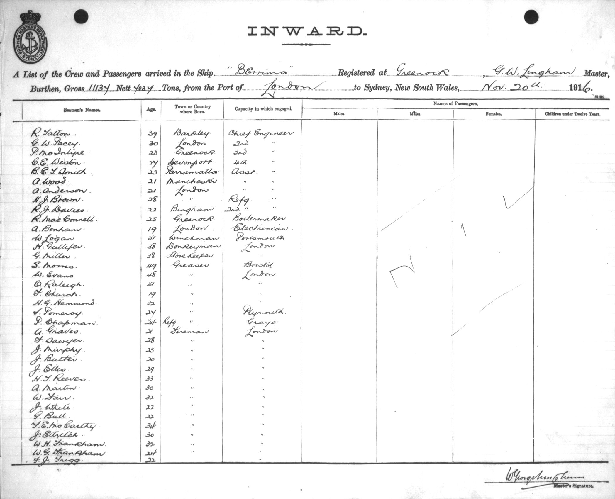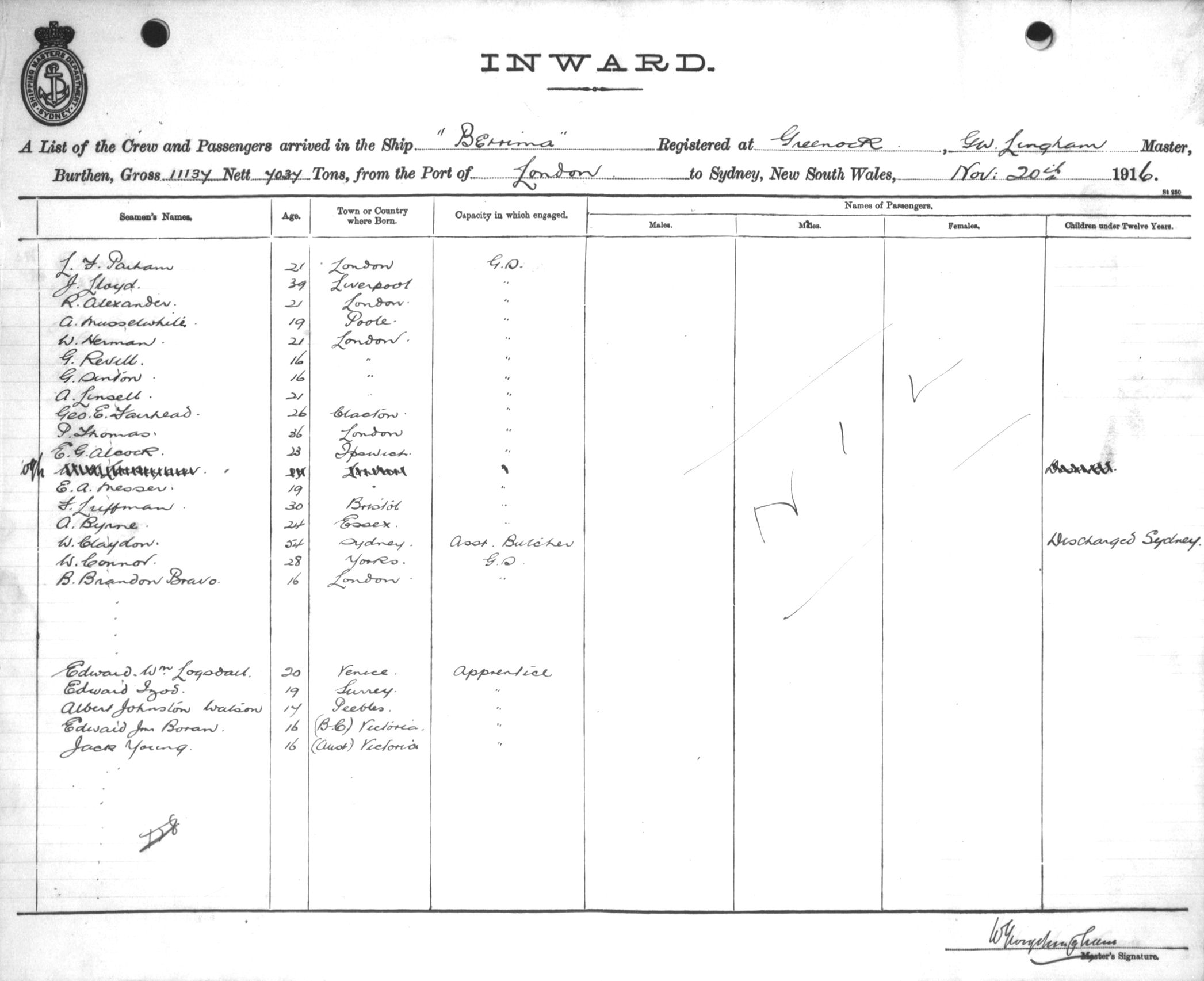 Mariners and ships in Australian Waters | BERRIMAOF GREENOCK, G. W. LINGHAM, MASTER, BURTHEN 11137/7037 TONS FROM THE PORT OF LONDON TO SYDNEY, NEW SOUTH WALES, 20TH NOVEMBER 1916 |