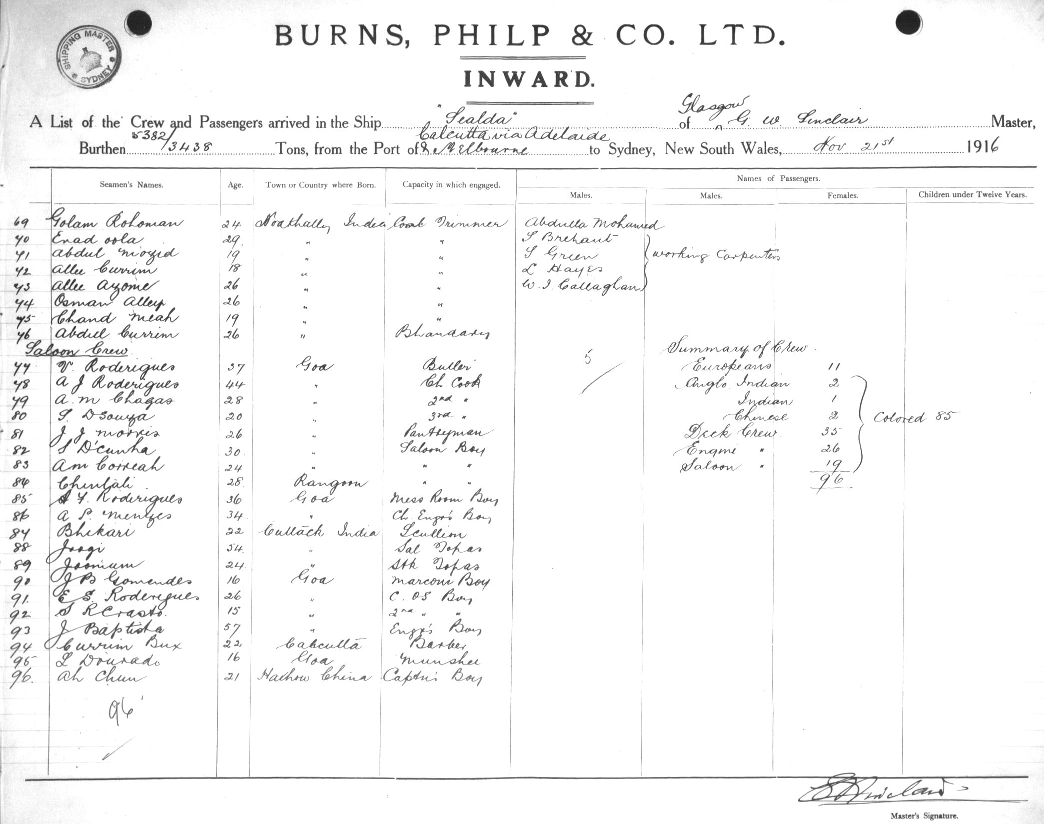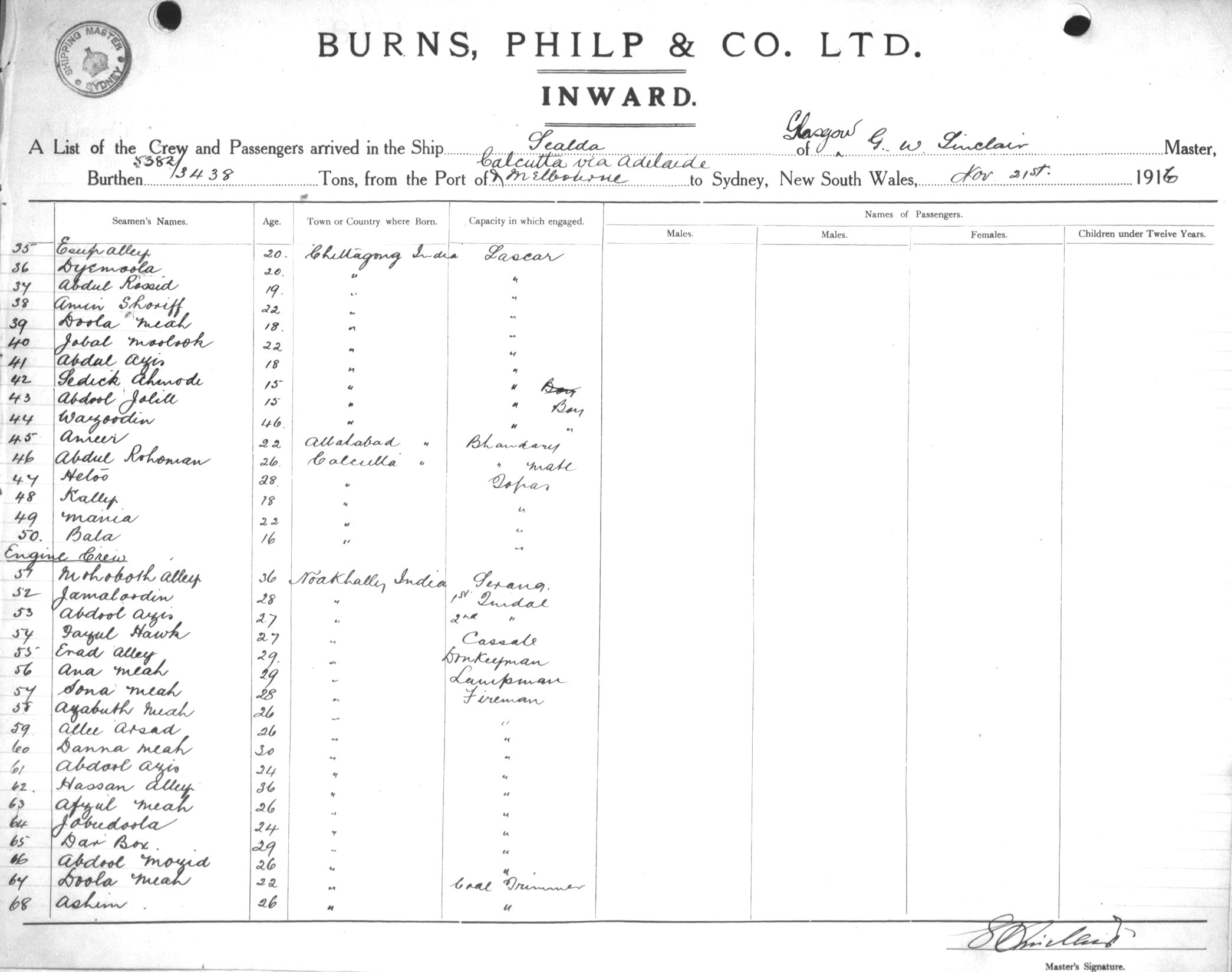 Mariners and ships in Australian Waters | SEALDAOF GLASGOW, G. W. SINCLAIR, MASTER, BURTHEN 5382/3438 TONS FROM THE PORT OF CALCUTTA via ADELAIDE & MELBOURNE TO SYDNEY, 21ST NOVEMBER 1916 |