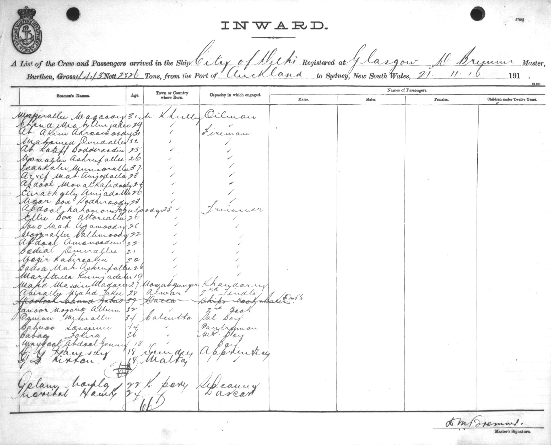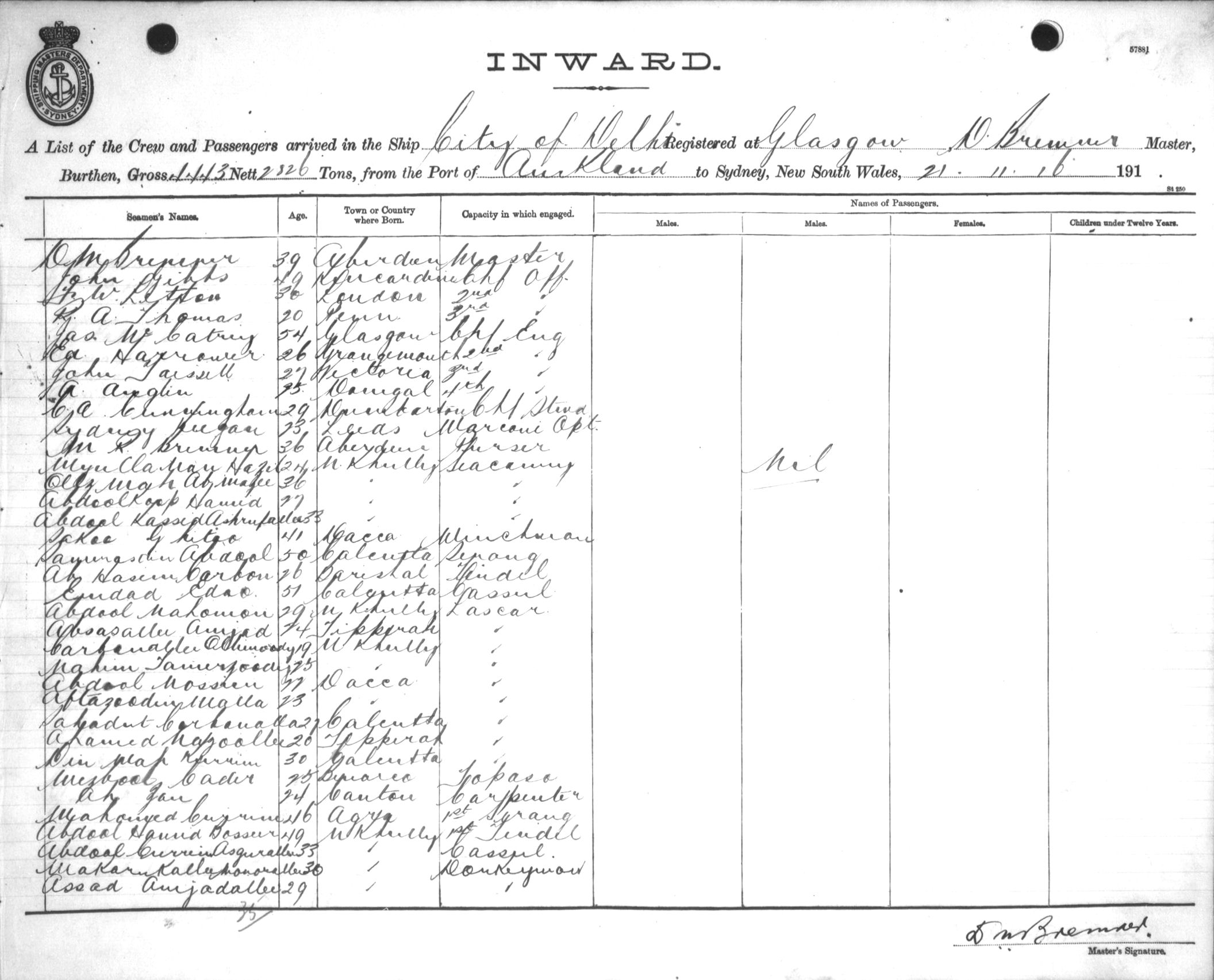 CITY OF DELHIOF GLASGOW, D. BREMNER, MASTER, BURTHEN 4443/2326 TONS FROM THE PORT OF AUCKLAND TO SYDNEY, NEW SOUTH WALES, 21ST NOVEMBER 1916 |