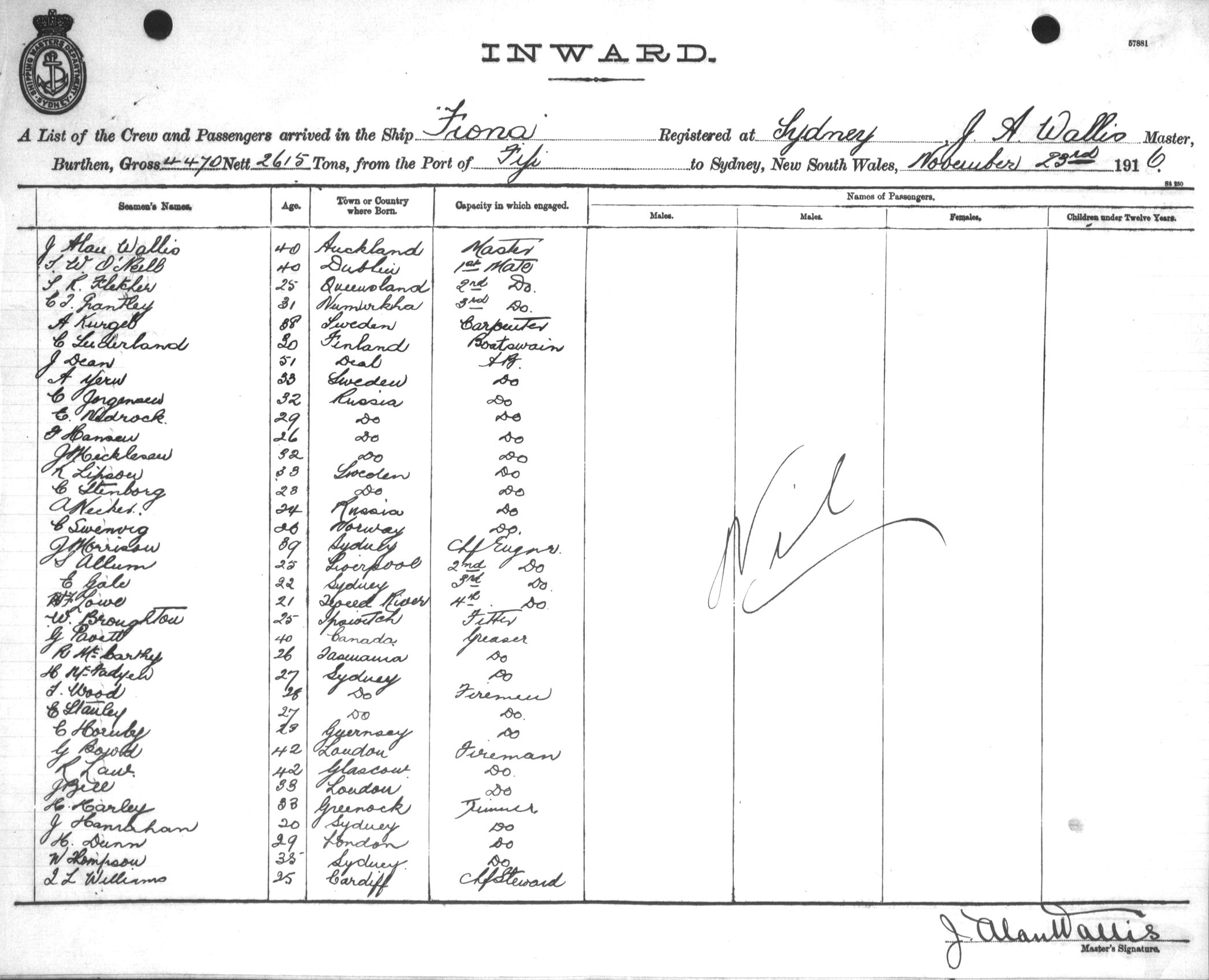 FIONAOF SYDNEY, J. A. WALLIS, MASTER, BURTHEN 4470/2615 TONS FROM THE PORT OF FIJI TO SYDNEY, NEW SOUTH WALES, 23RD NOVEMBER 1916 |