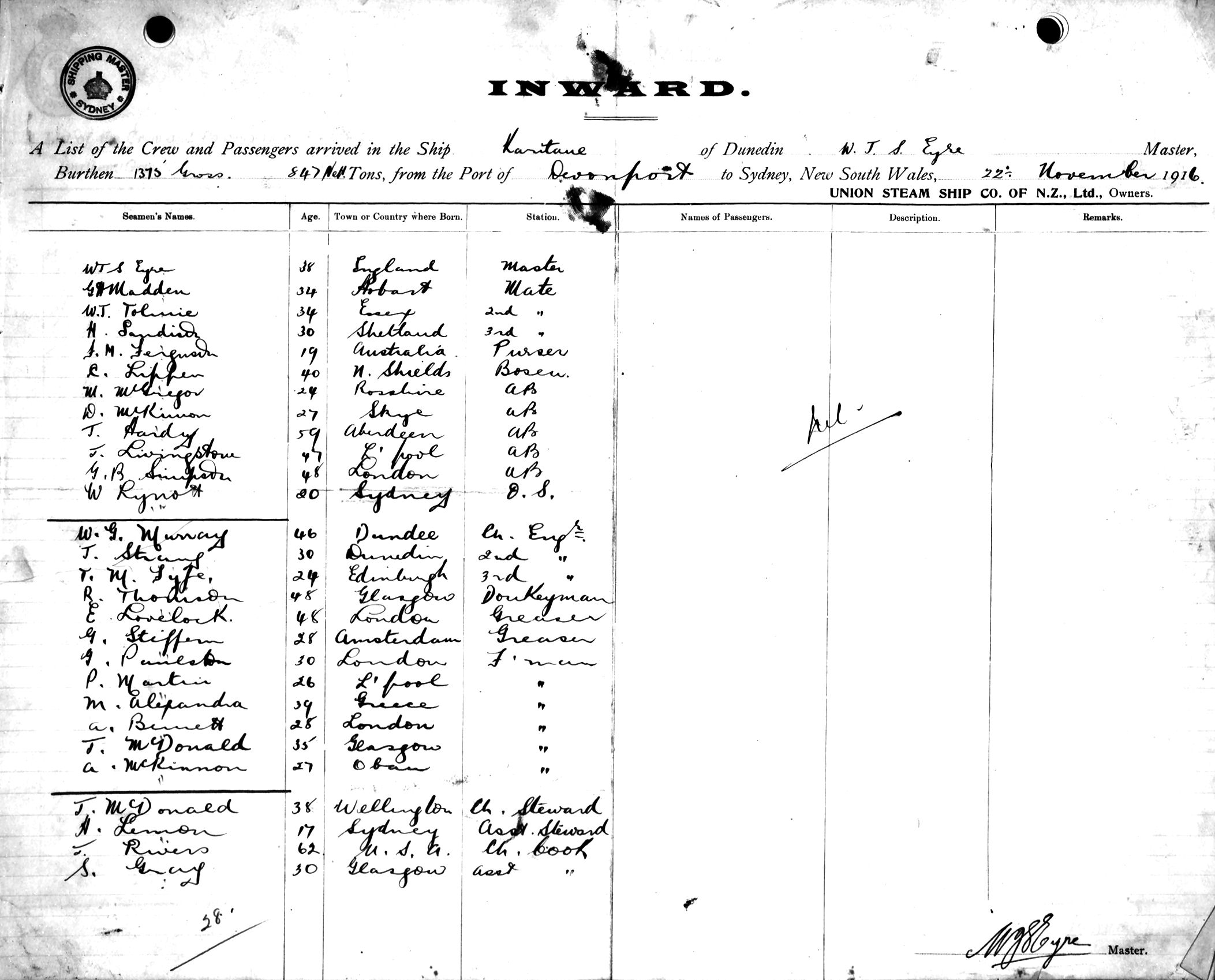 KARITANEOF DUNEDIN, W. J. S. EYRE, MASTER, BURTHEN 1375 TONS FROM THE PORT OF DEVONPORT TO SYDNEY, NEW SOUTH WALES, 22ND NOVEMBER 1916 |