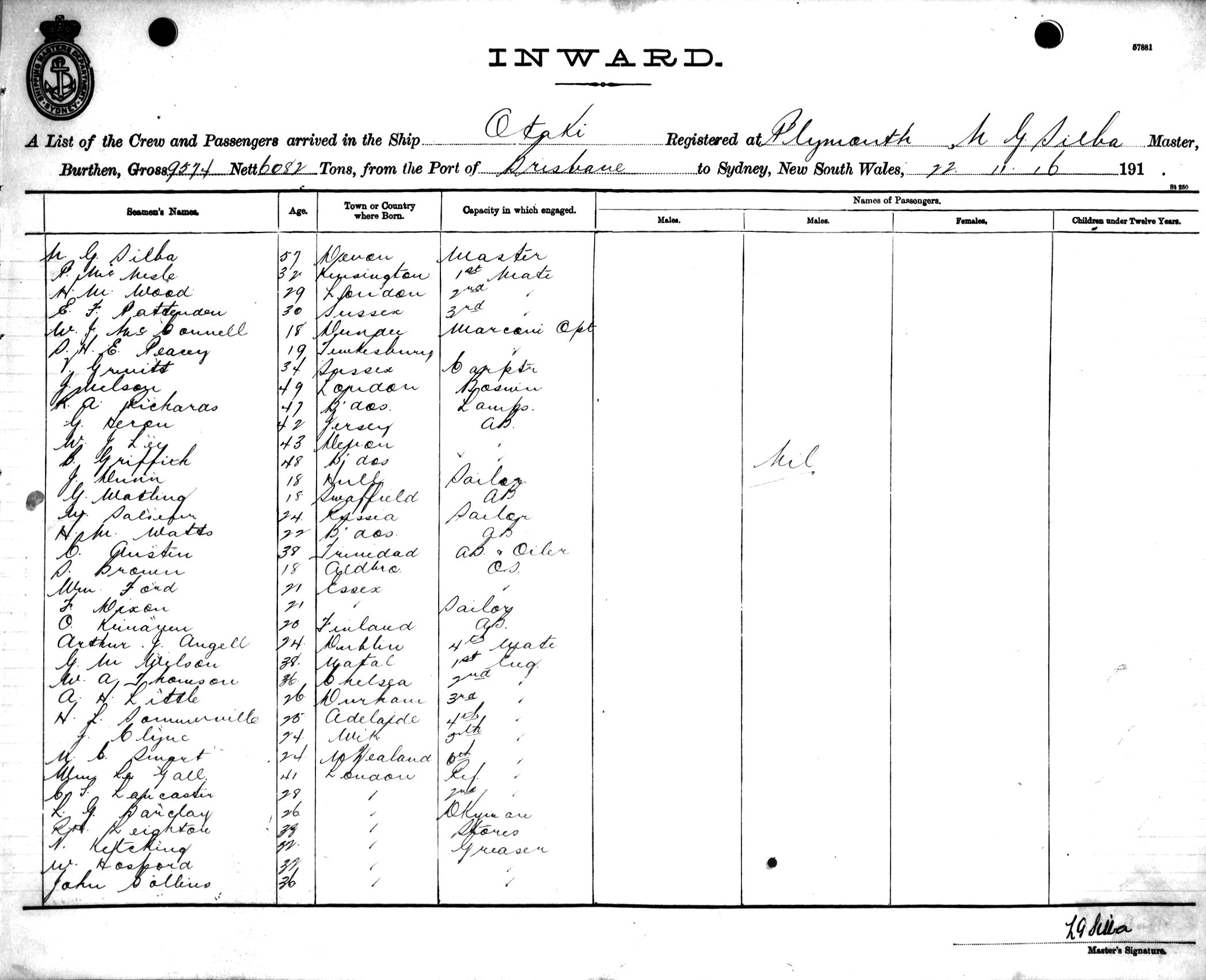 OTAKIOF PLYMOUTH, L. G. SILBA, MASTER, BURTHEN 9574/6082 TONS FROM THE PORT OF BRISBANE TO SYDNEY, NEW SOUTH WALES, 22ND NOVEMBER 1916 |