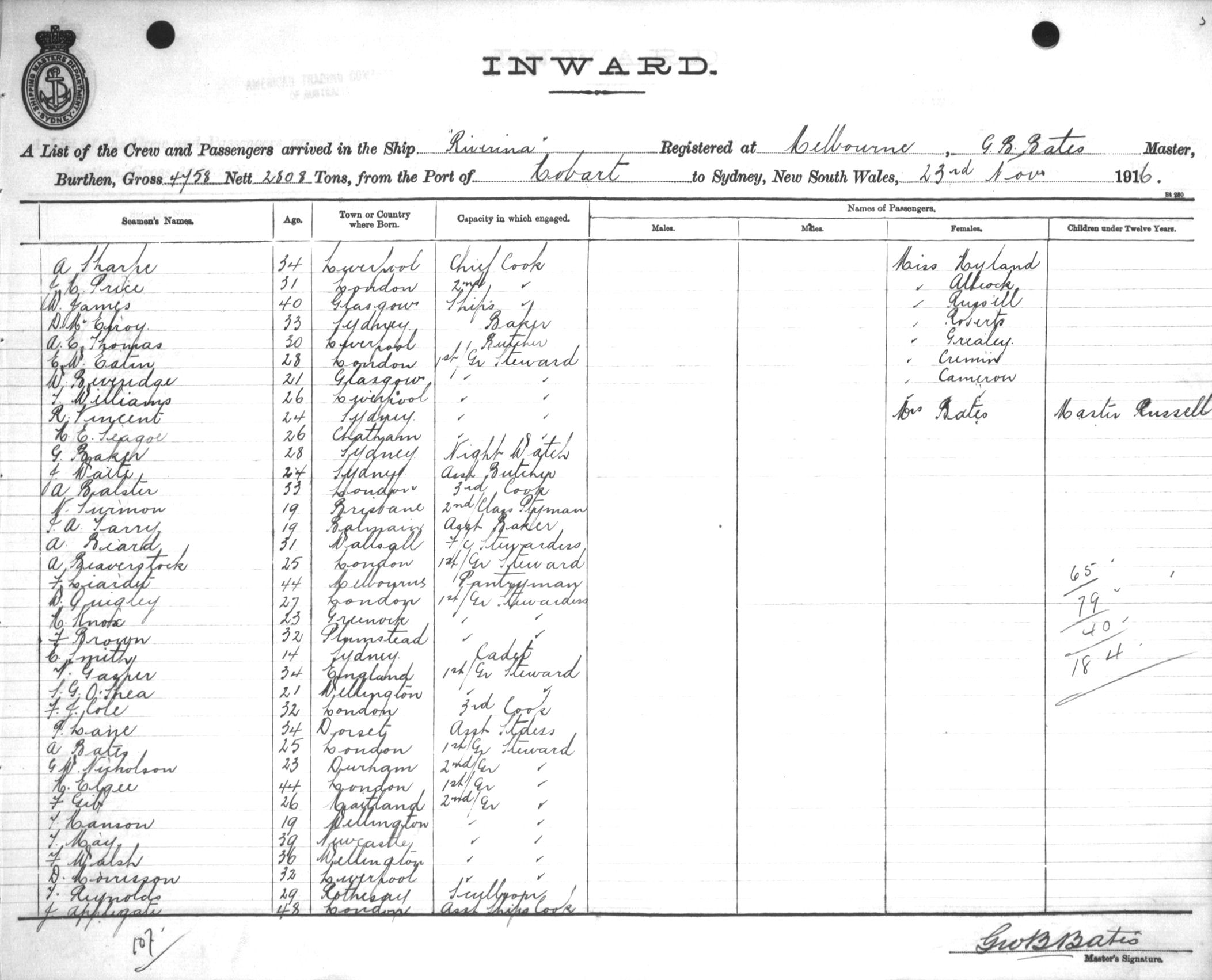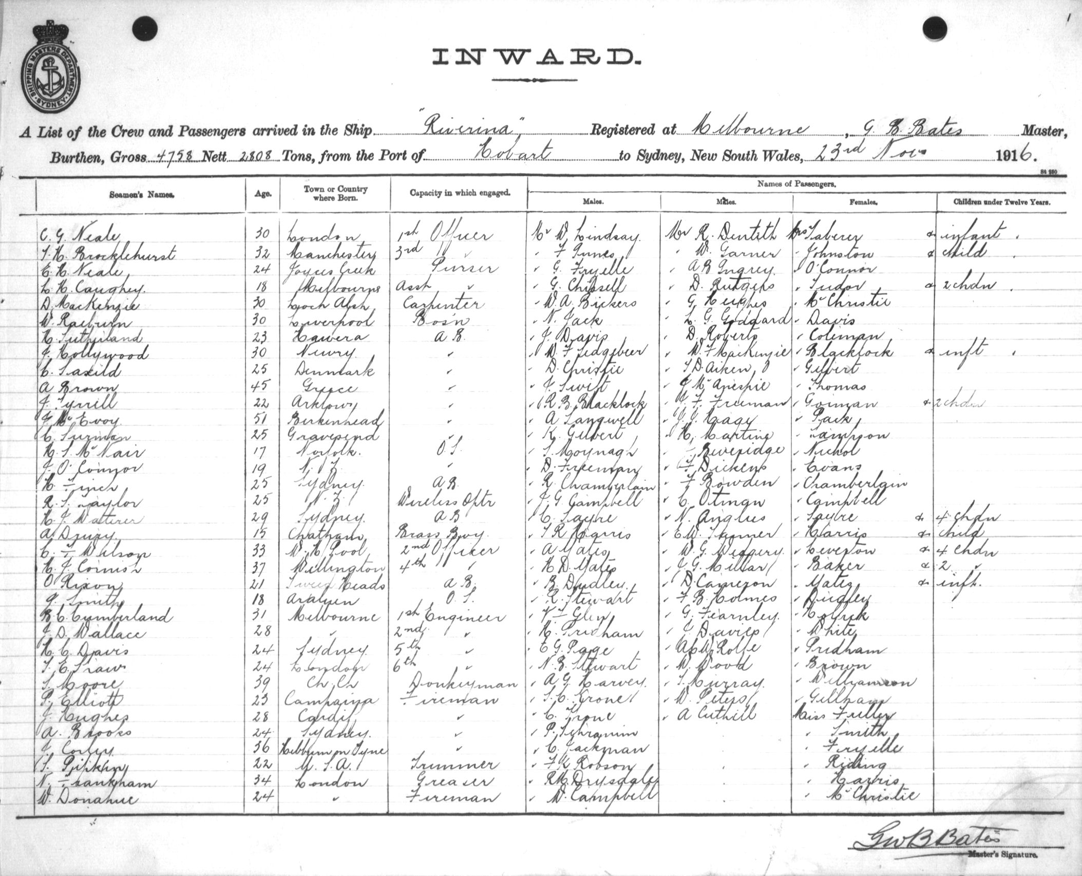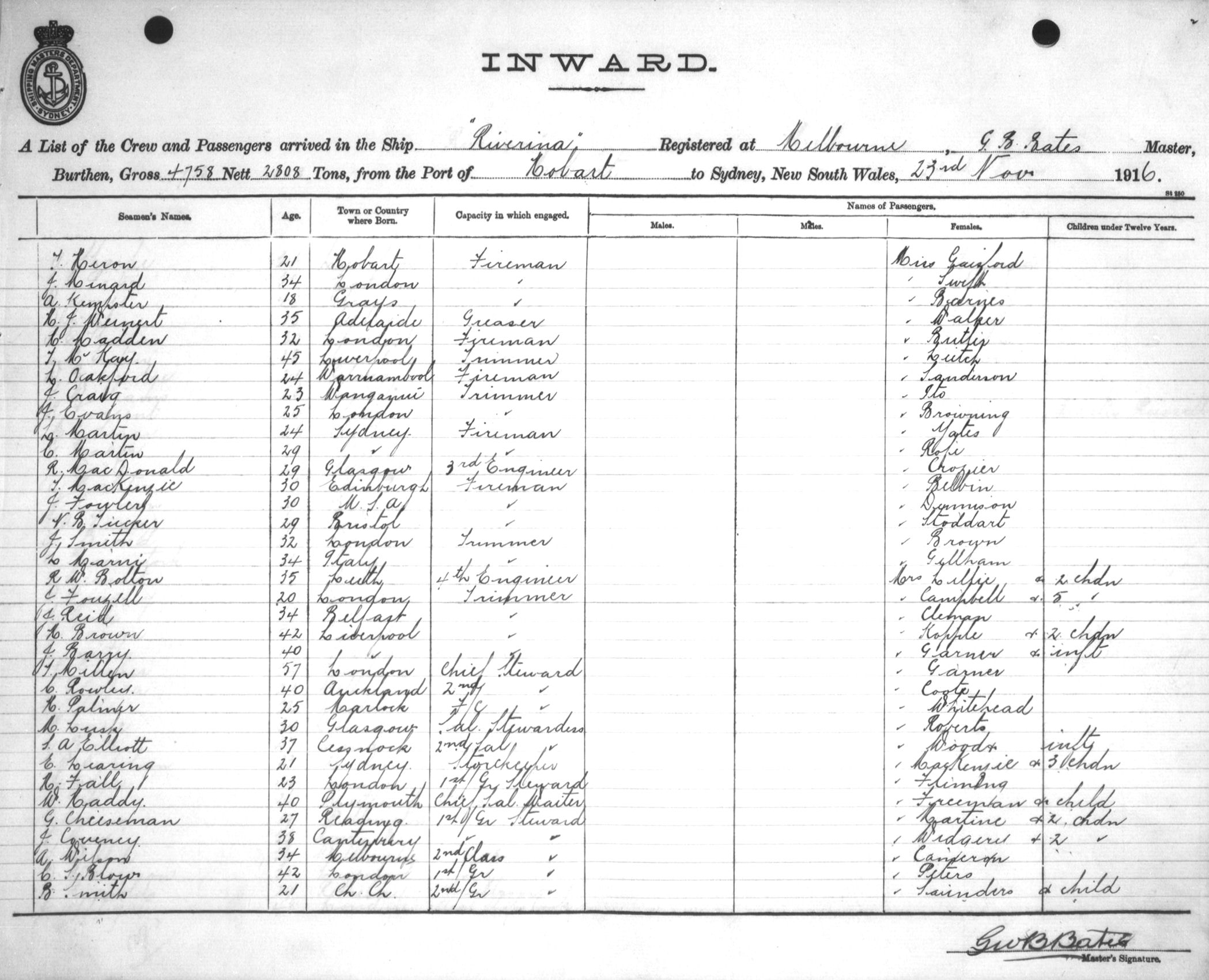 RIVERINAOF MELBOURNE, G. B. BATES, MASTER, BURTHEN 4758/2808 TONS FROM THE PORT OF HOBART TO SYDNEY, NEW SOUTH WALES, 23RD NOVEMBER 1916 |