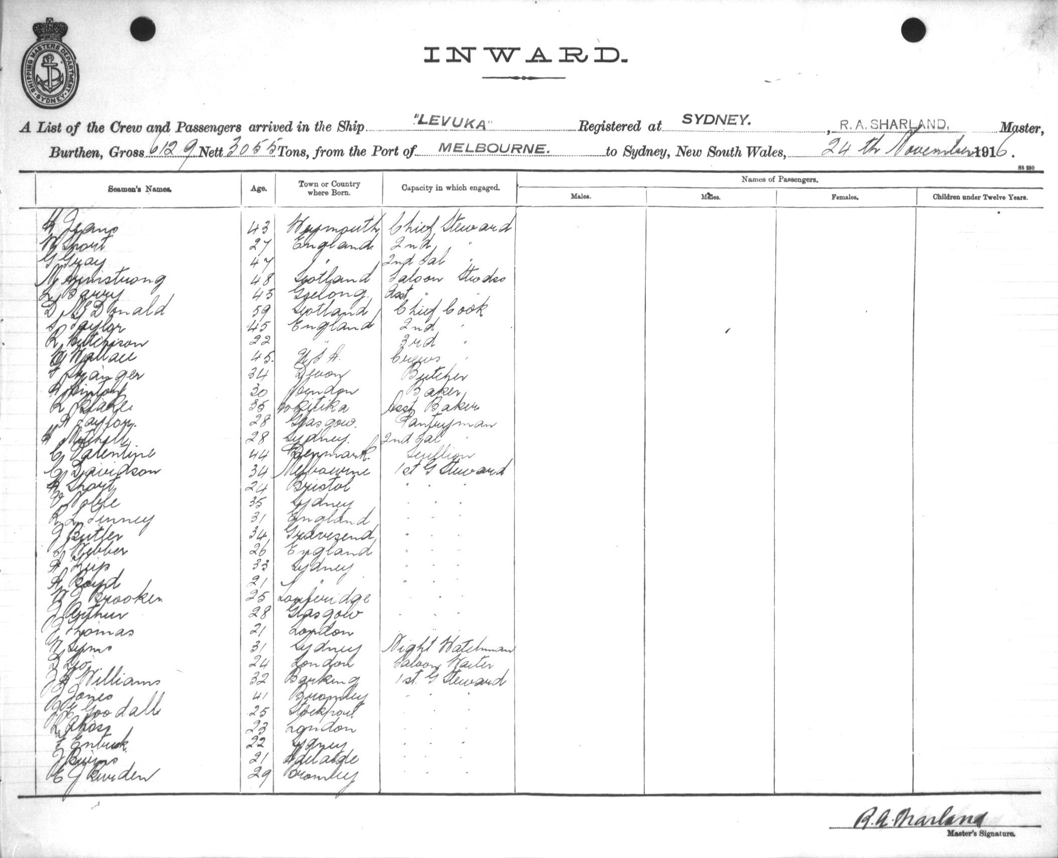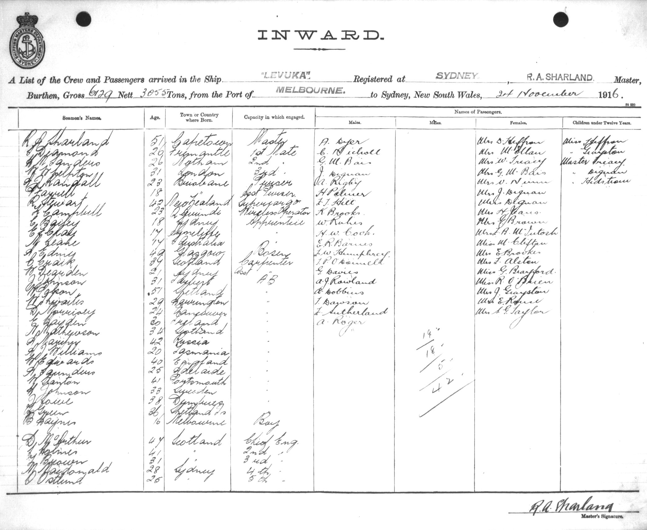 LEVUKAOF SYDNEY, R. A. SHARLAND, MASTER, BURTHEN 6129/3055 TONS FROM THE PORT OF MELBOURNE TO SYDNEY, NEW SOUTH WALES, 24TH NOVEMBER 1916 |