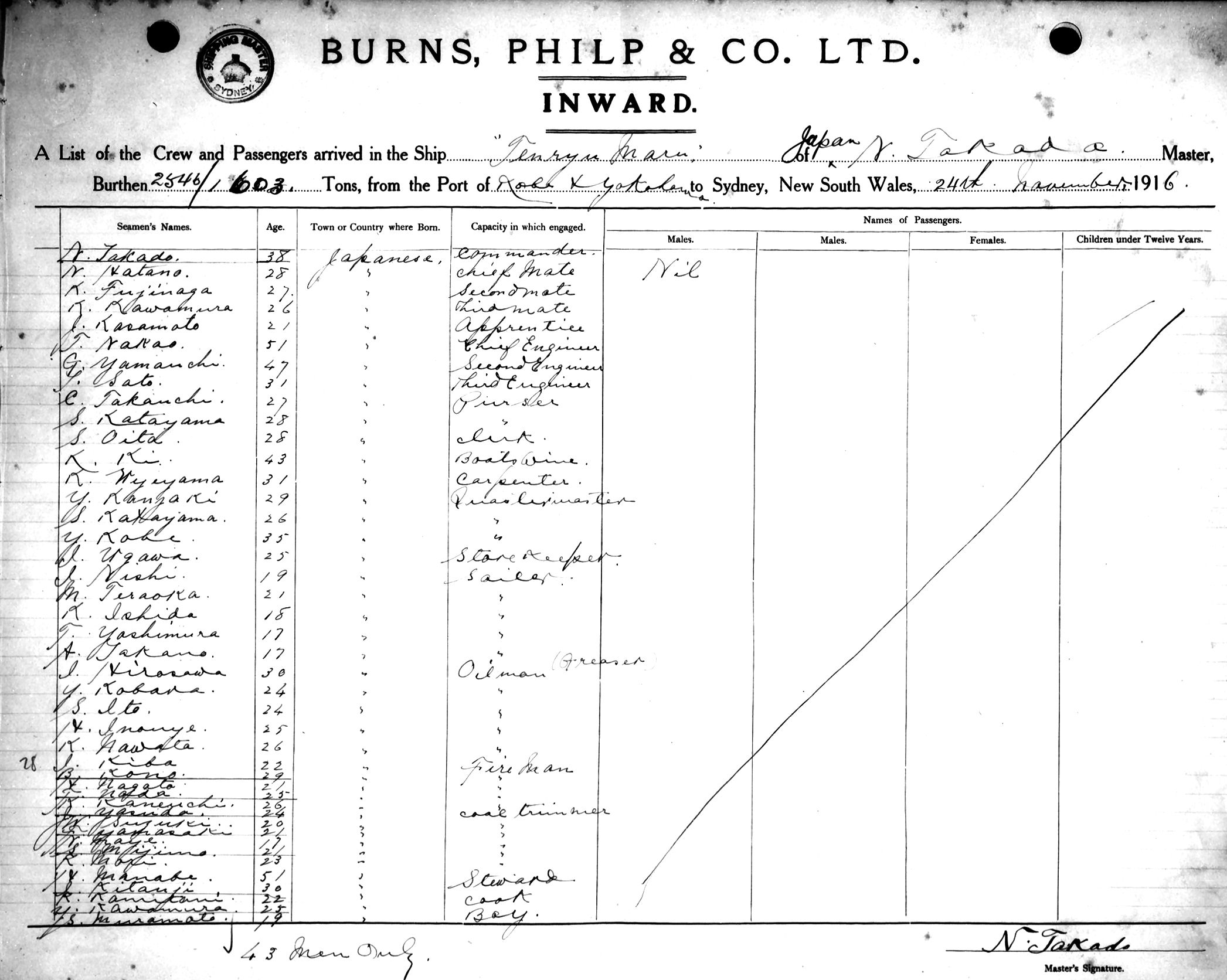 TENRYN MARUOF JAPAN, N. TAKADA, MASTER, BURTHEN 2546/1603 TONS FROM THE PORT OF MELBOURNE TO SYDNEY, NEW SOUTH WALES, 24TH NOVEMBER 1916 |