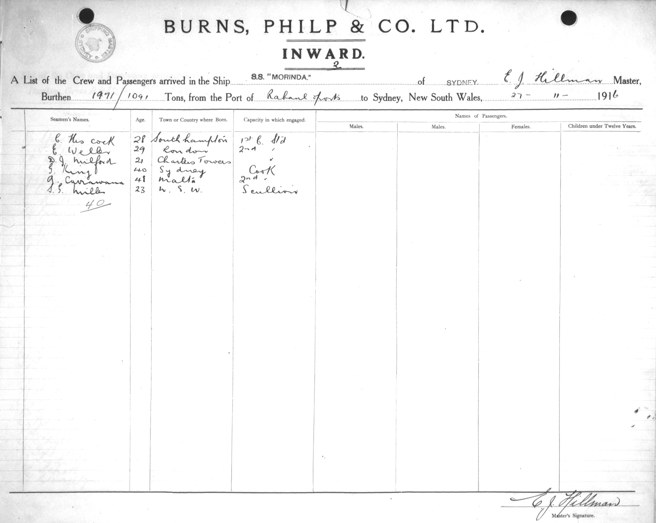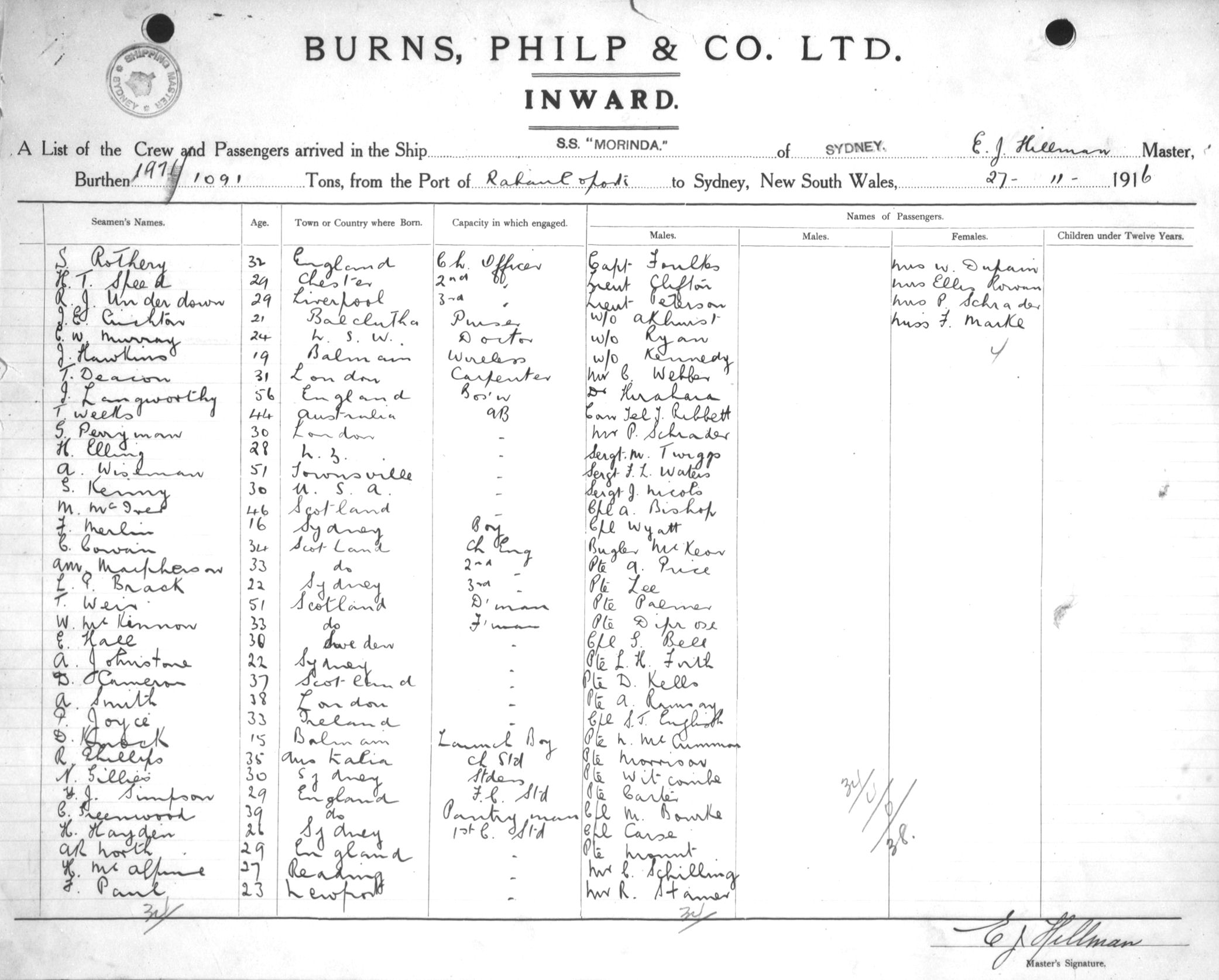 MORINDAOF SYDNEY, E. J. HILLMAN, MASTER, BURTHEN 1971/1091 TONS FROM THE PORT OF RABAUL & PORTS TO SYDNEY, NEW SOUTH WALES, 27TH NOVEMBER 1916 |