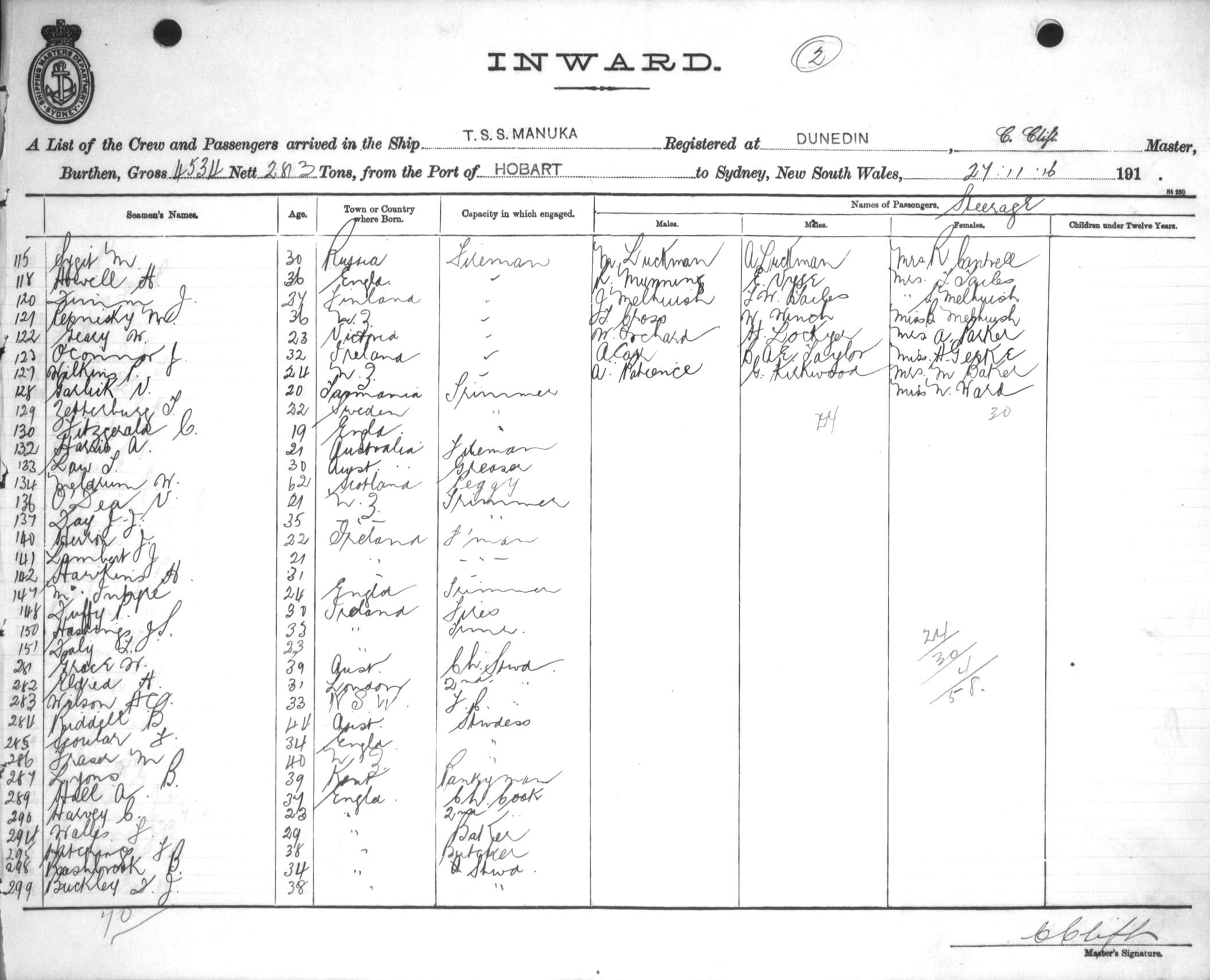 MANUKAOF DUNEDIN, C. CLIFT, MASTER, BURTHEN 4534/2813 TONS FROM THE PORT OF HOBART TO SYDNEY, NEW SOUTH WALES, 27TH NOVEMBER 1916 |