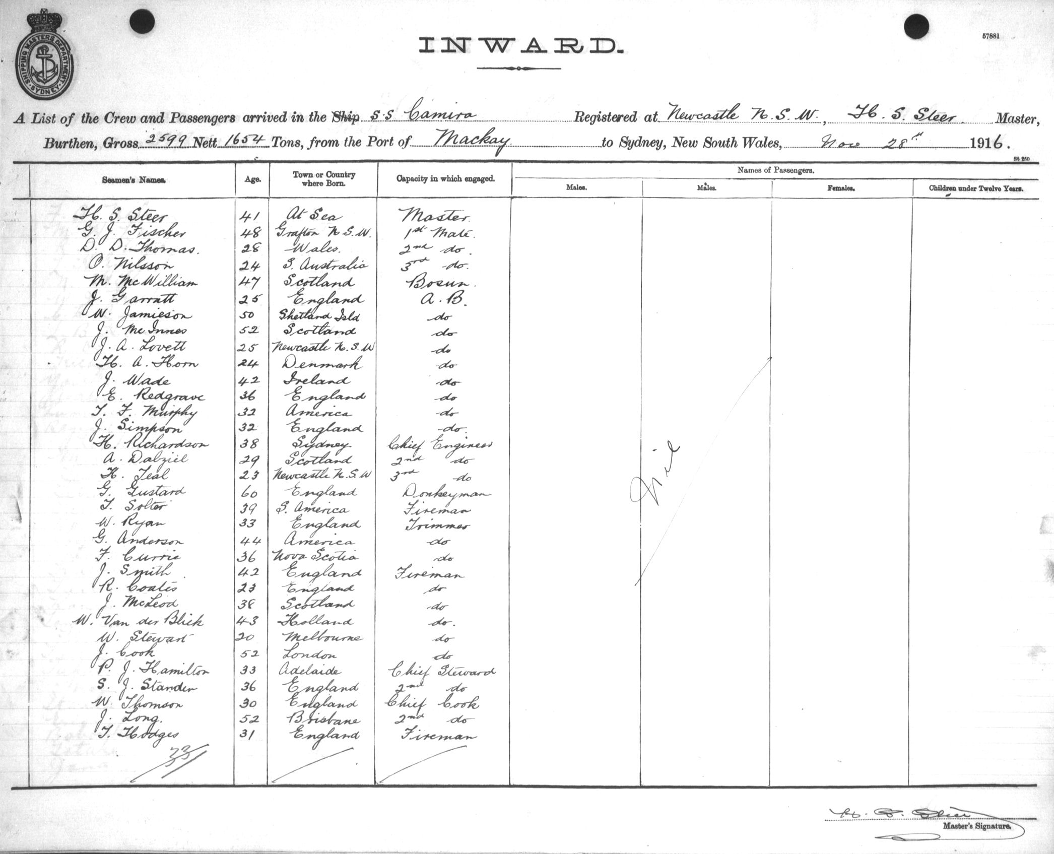 Mariners and ships in Australian Waters | CAMIRAOF NEWCASTLE, N.S.W., H. S. STEER, MASTER, BURTHEN 2599/1654 TONS FROM THE PORT OF MACKAY TO SYDNEY, NEW SOUTH WALES, 29TH NOVEMBER 1916 |