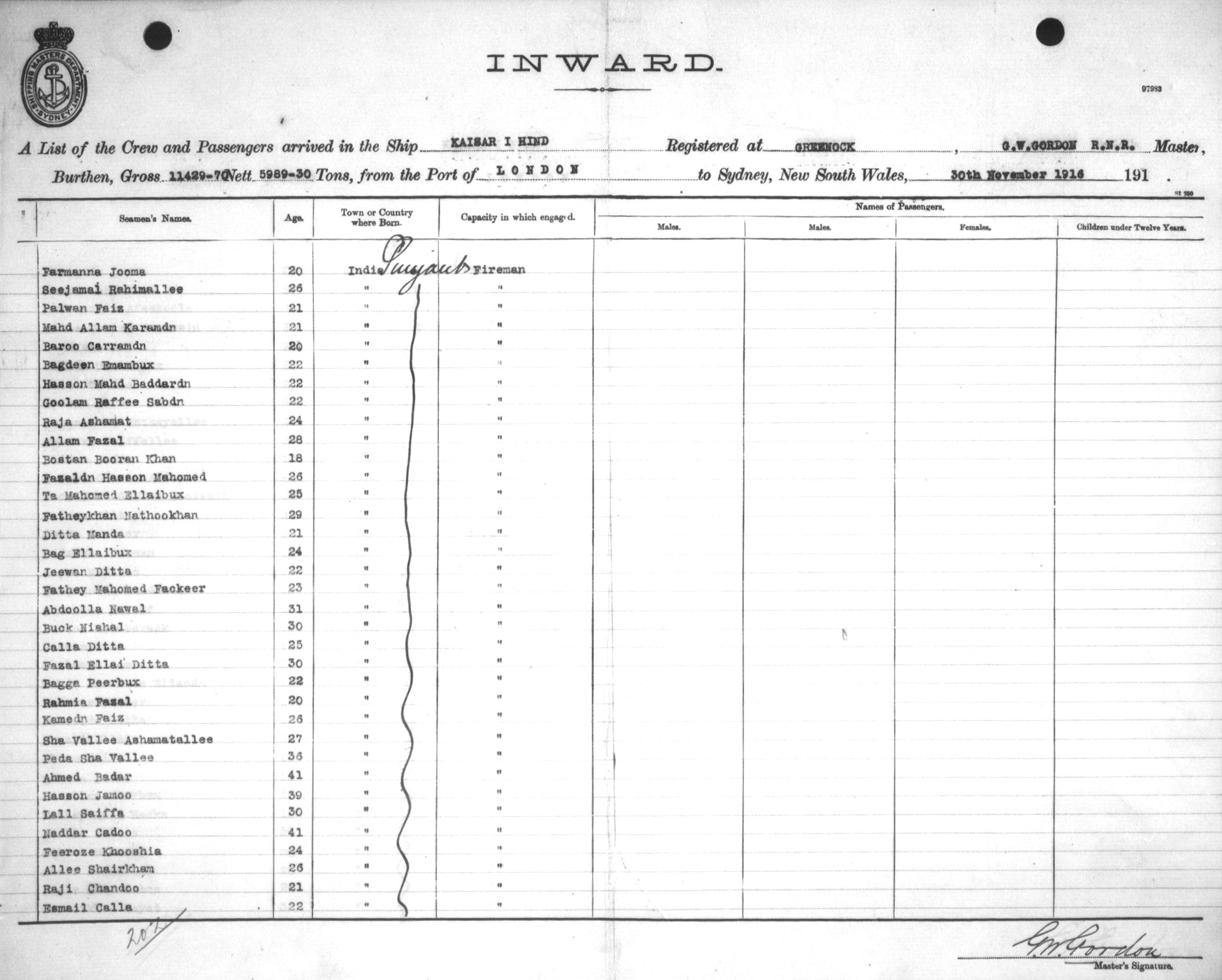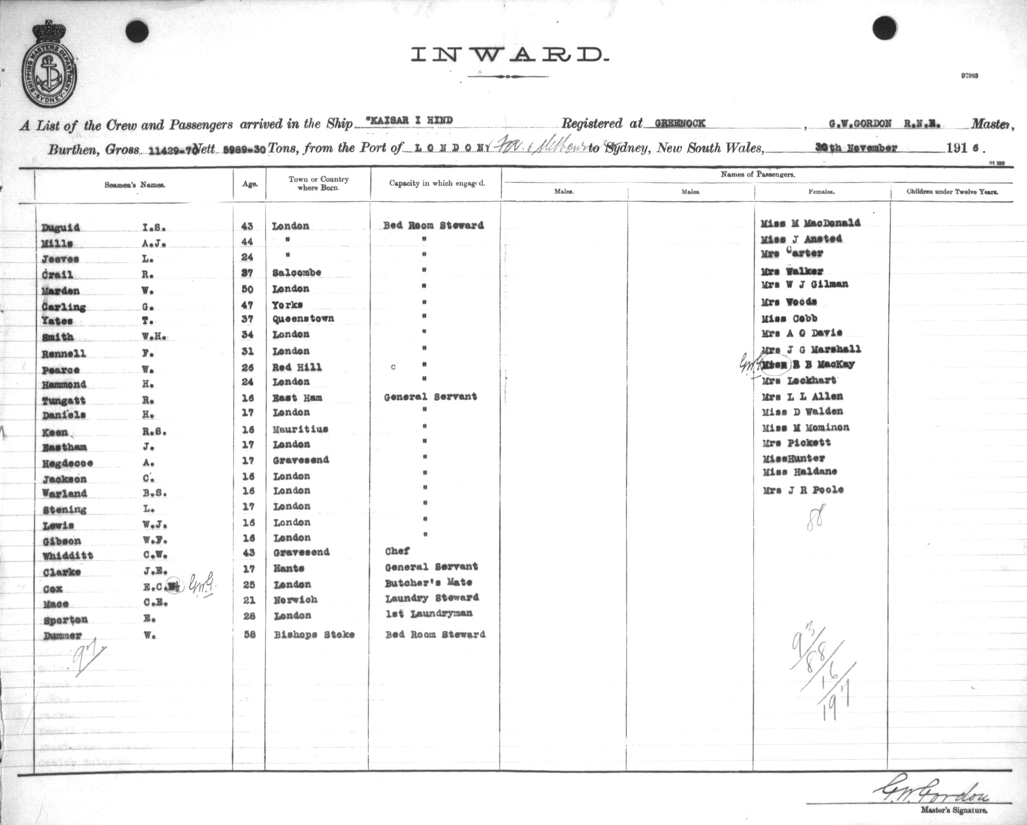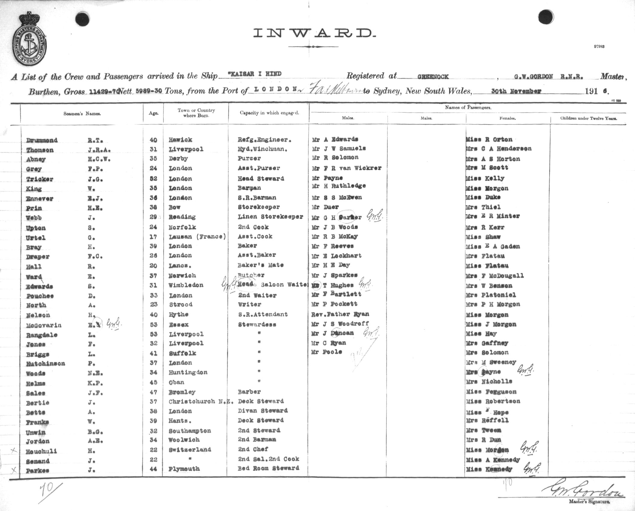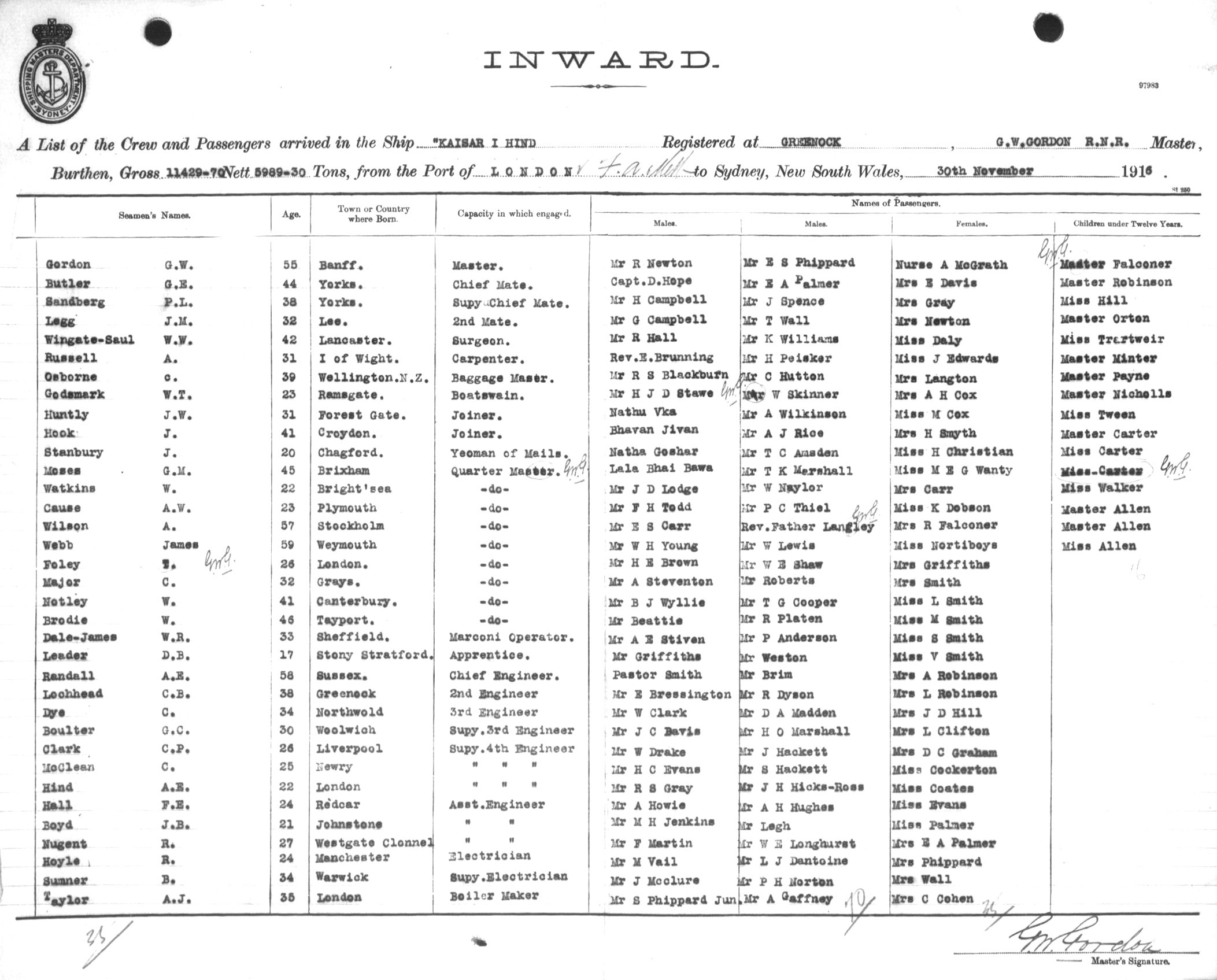 Mariners and ships in Australian Waters | KAISAR-I-HINDOF GREENOCK, G. W. GORDON, MASTER, BURTHEN 11429.70/5989.30 TONS FROM THE PORT OF LONDON via FREMANTLE, ADELAIDE & MELBOURNE TO SYDNEY, NEW SOUTH WALES, 30TH NOVEMBER 1916 |