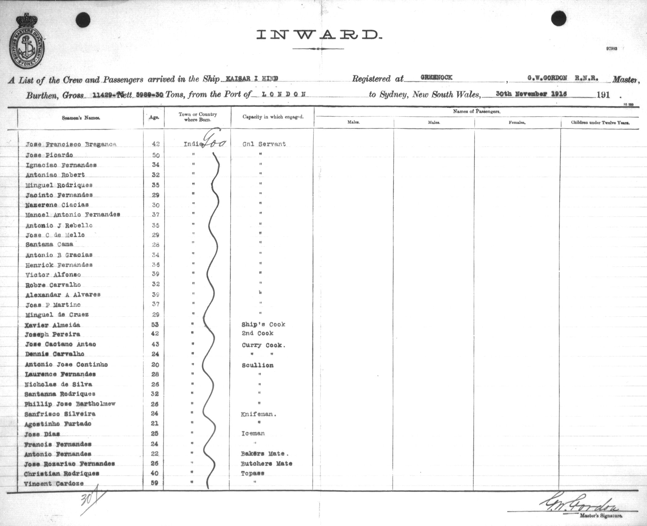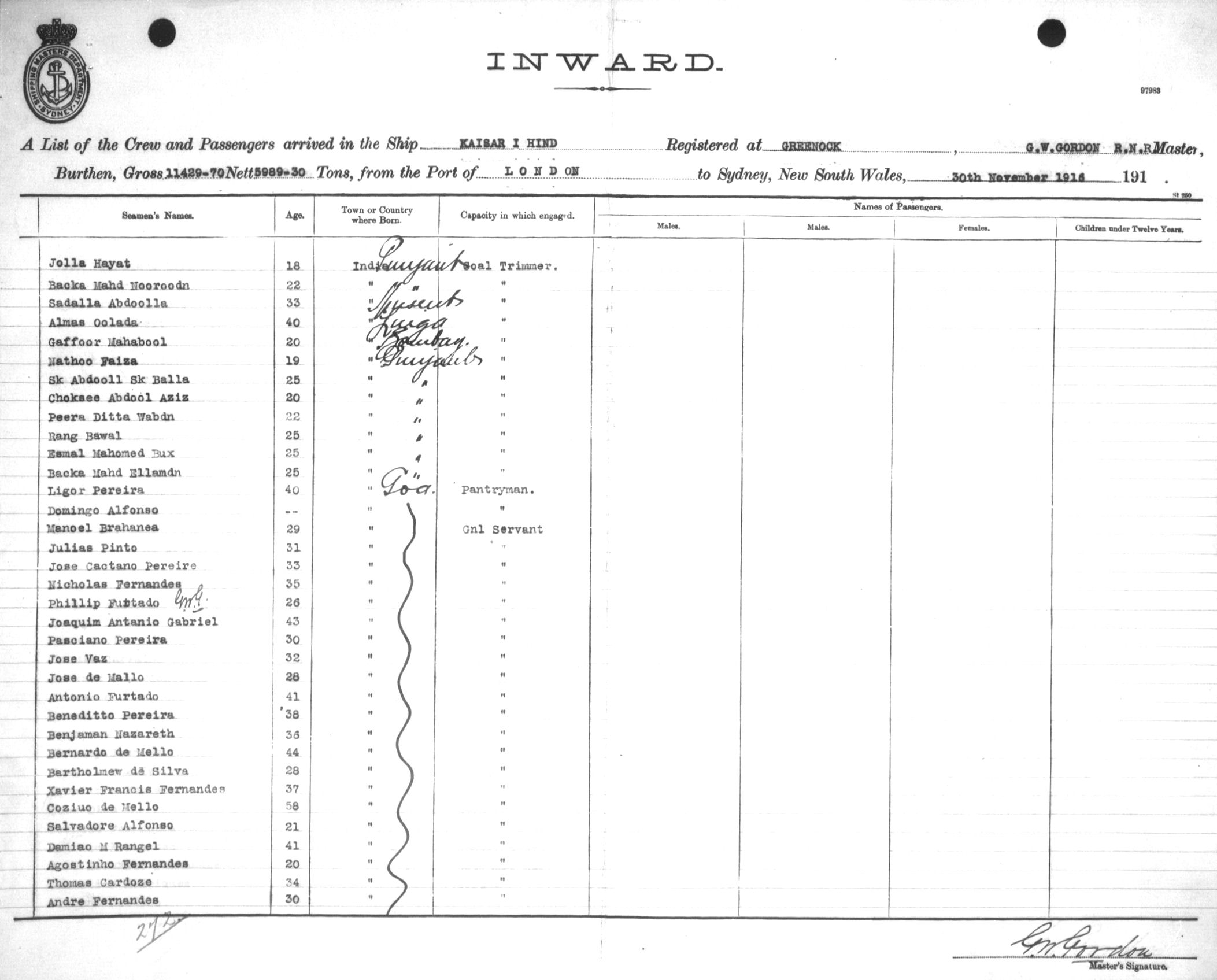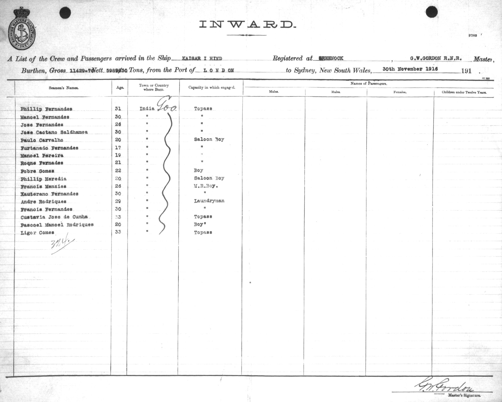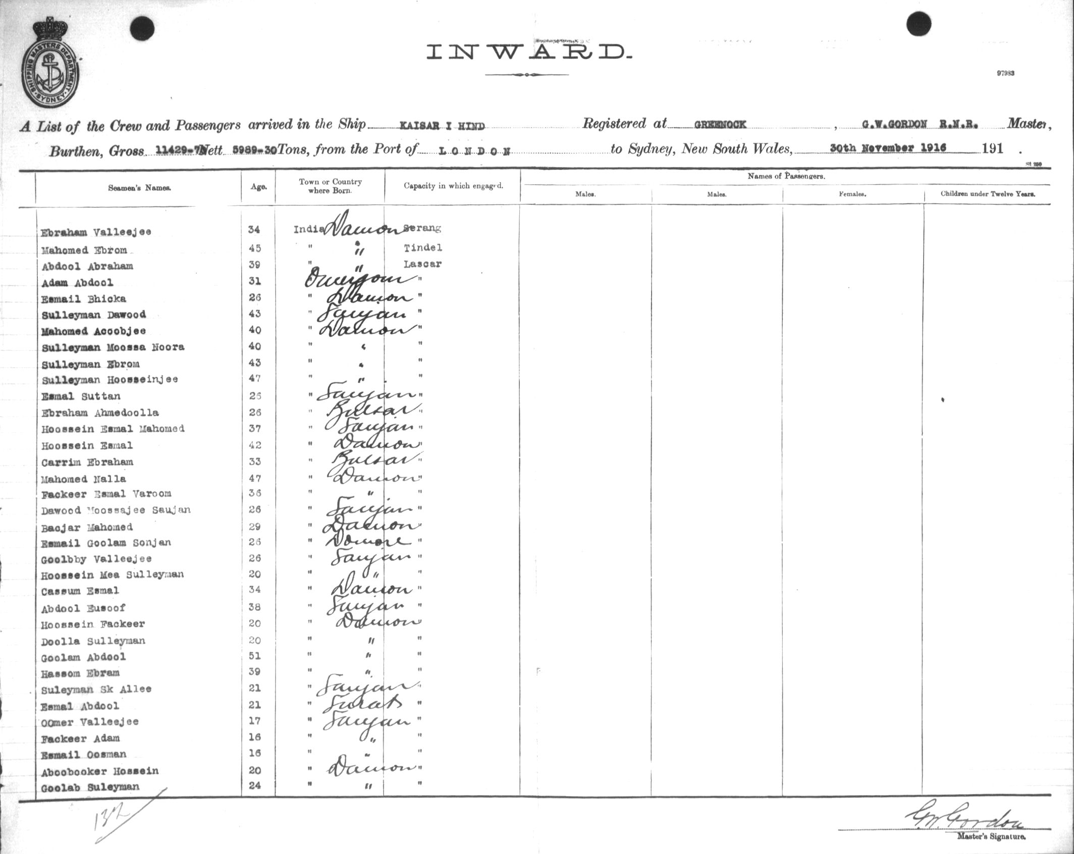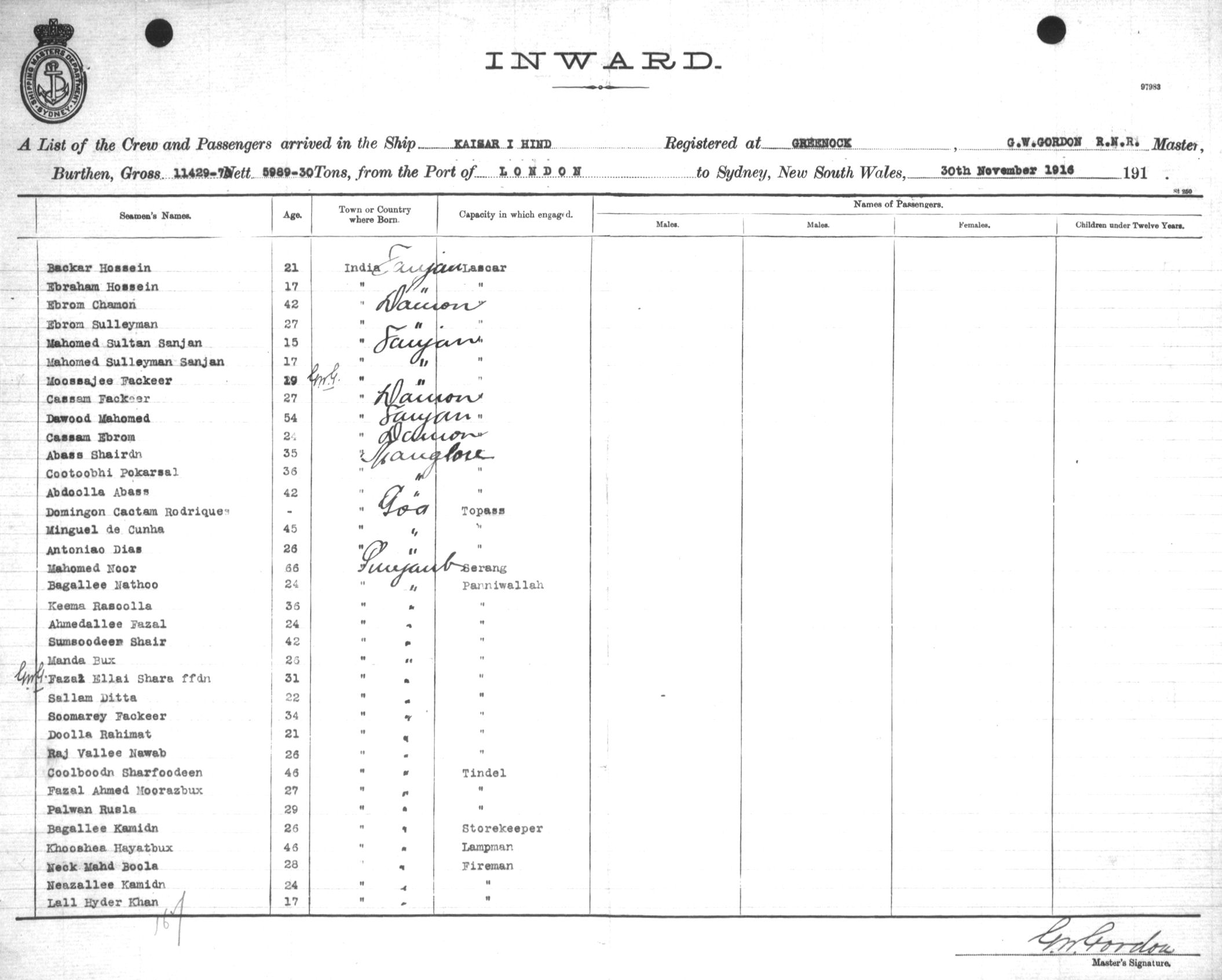 Mariners and ships in Australian Waters | KAISAR-I-HINDOF GREENOCK, G. W. GORDON, MASTER, BURTHEN 11429.70/5989.30 TONS FROM THE PORT OF LONDON via FREMANTLE, ADELAIDE & MELBOURNE TO SYDNEY, NEW SOUTH WALES, 30TH NOVEMBER 1916 |