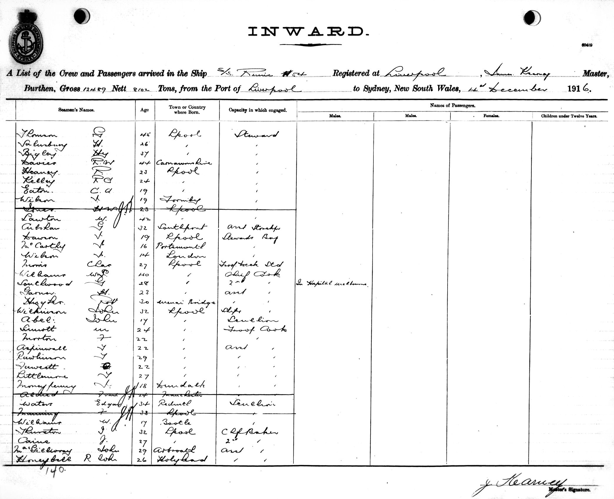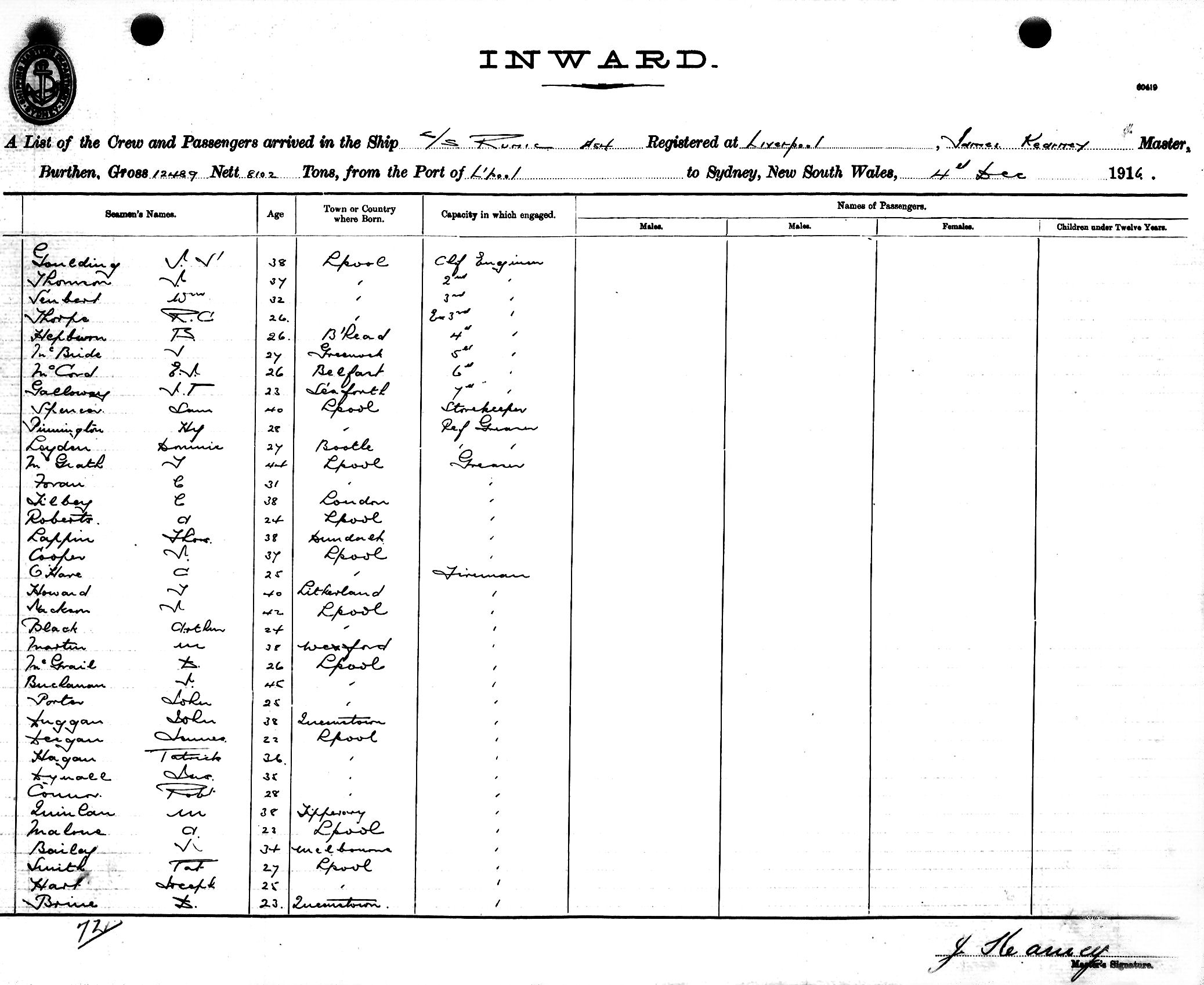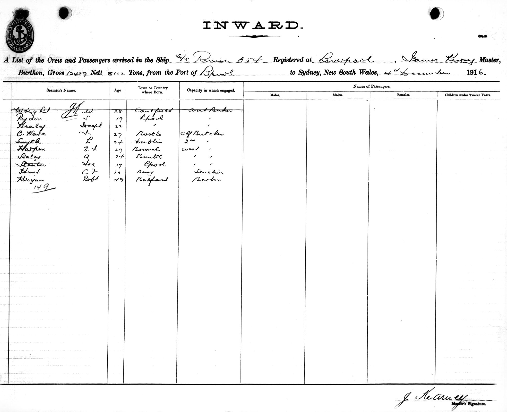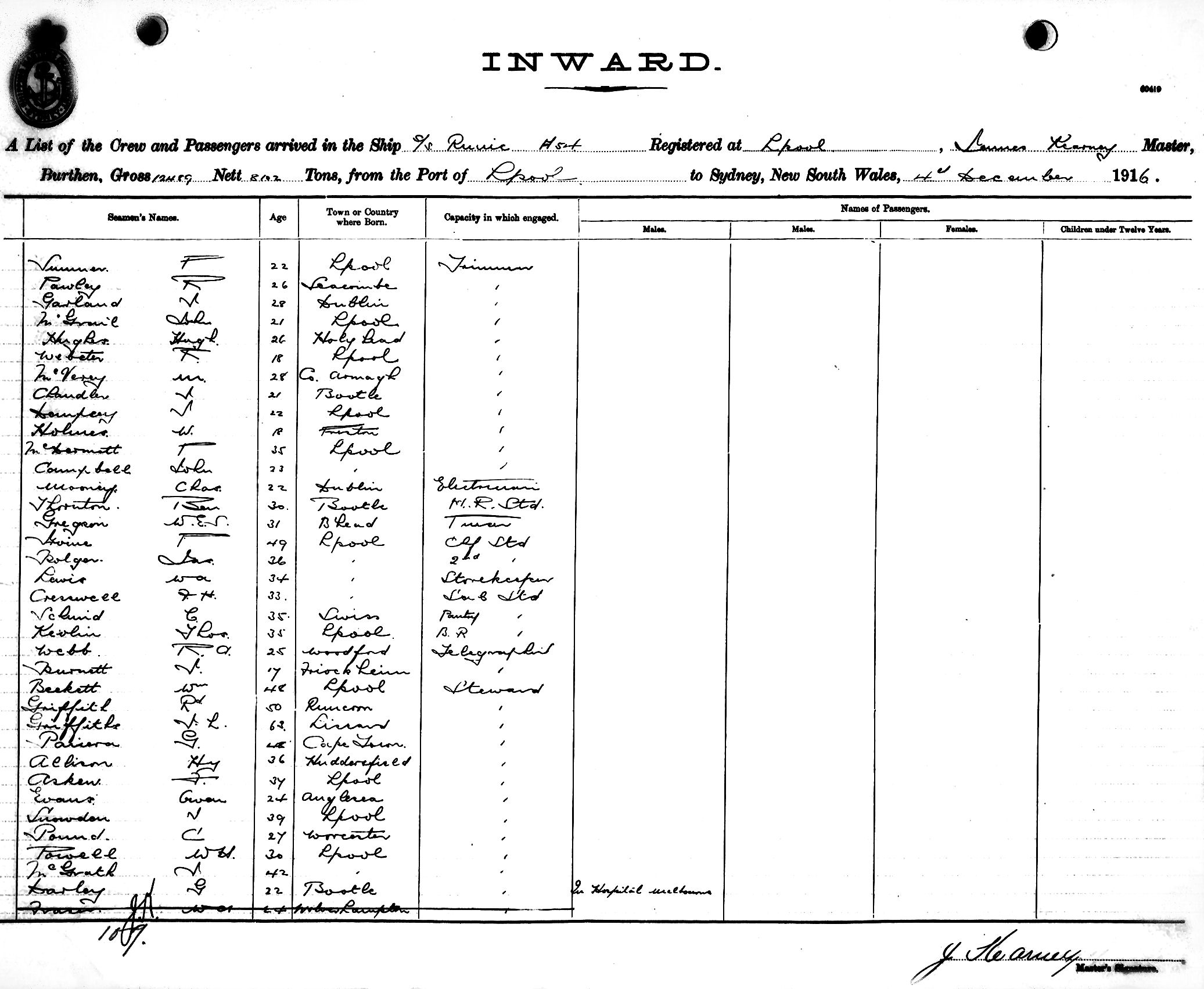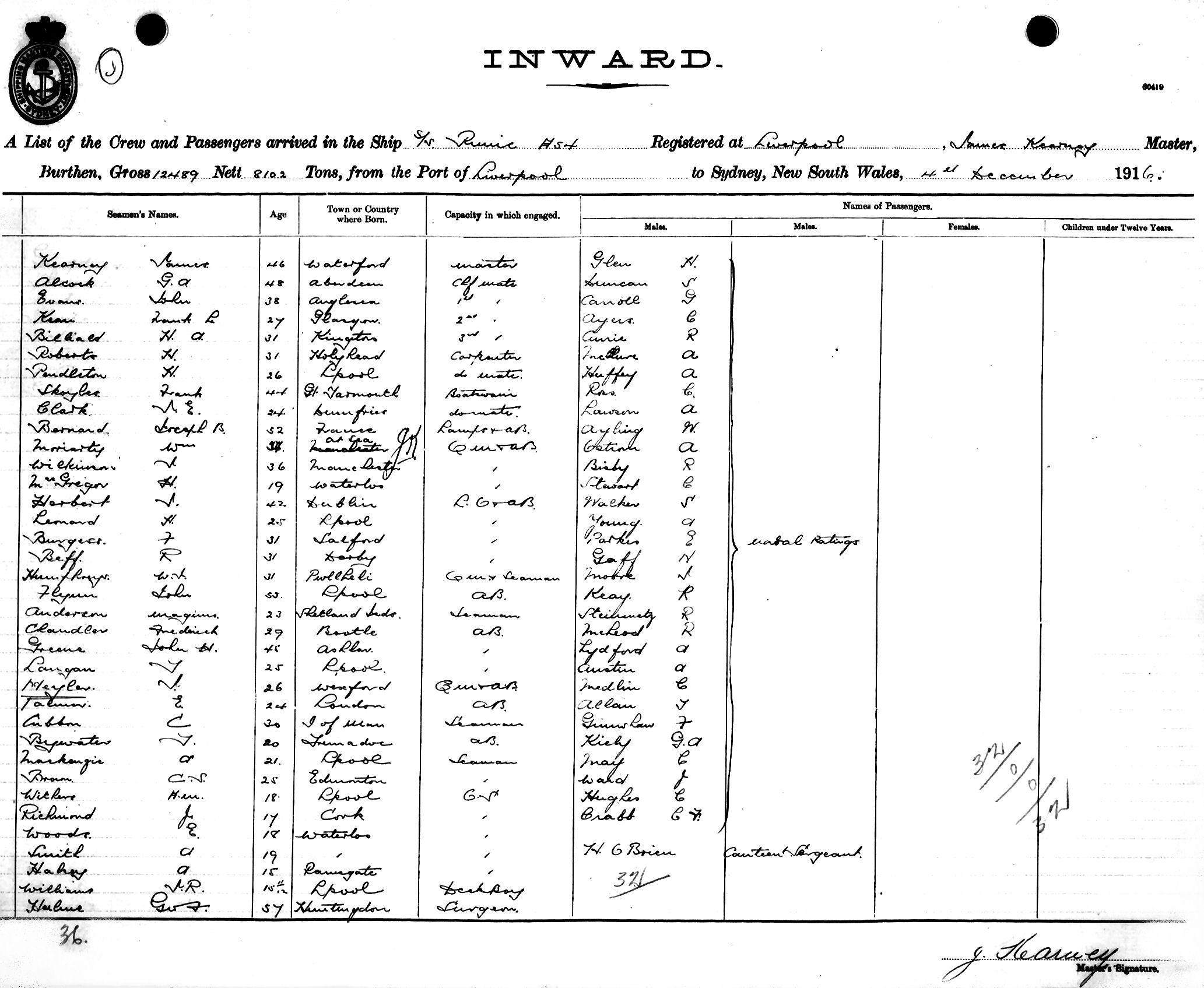 RUNICOF LIVERPOOL, JAMES KEARNEY, MASTER, BURTHEN 12489/8102 TONS FROM THE PORT OF LIVERPOOL TO SYDNEY, NEW SOUTH WALES, 4TH DECEMBER 1916 |