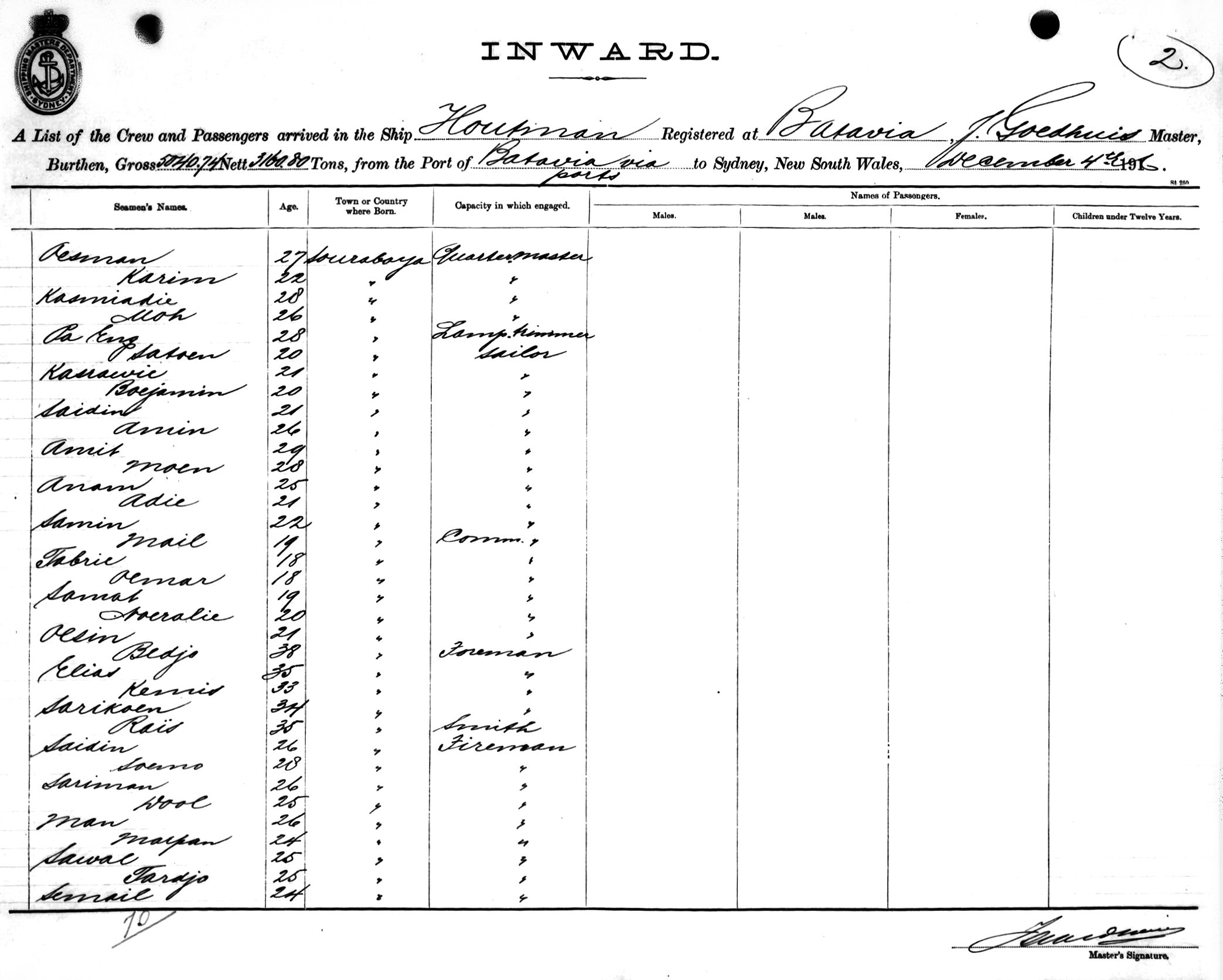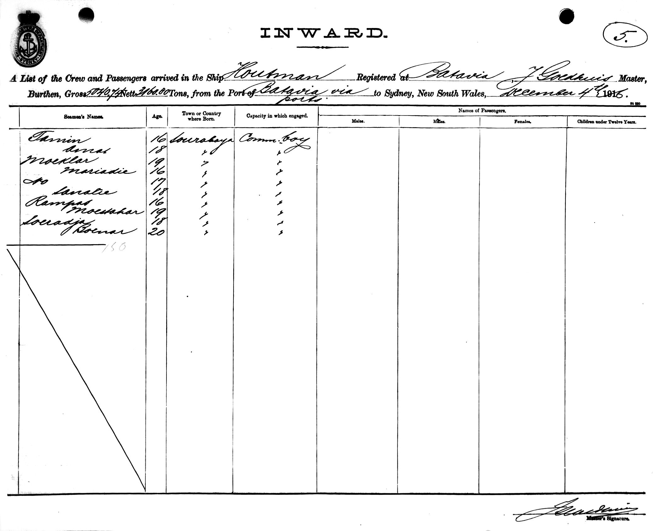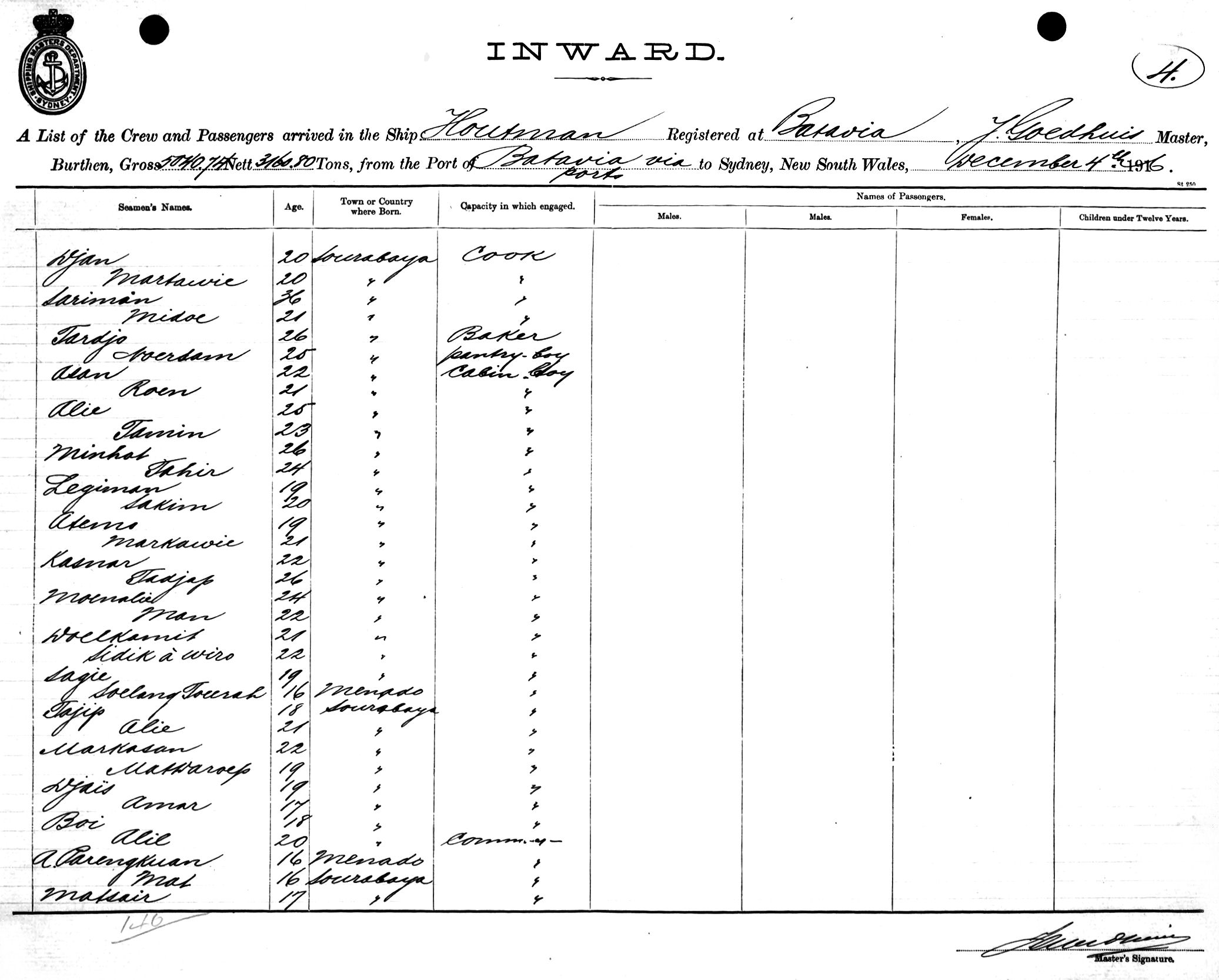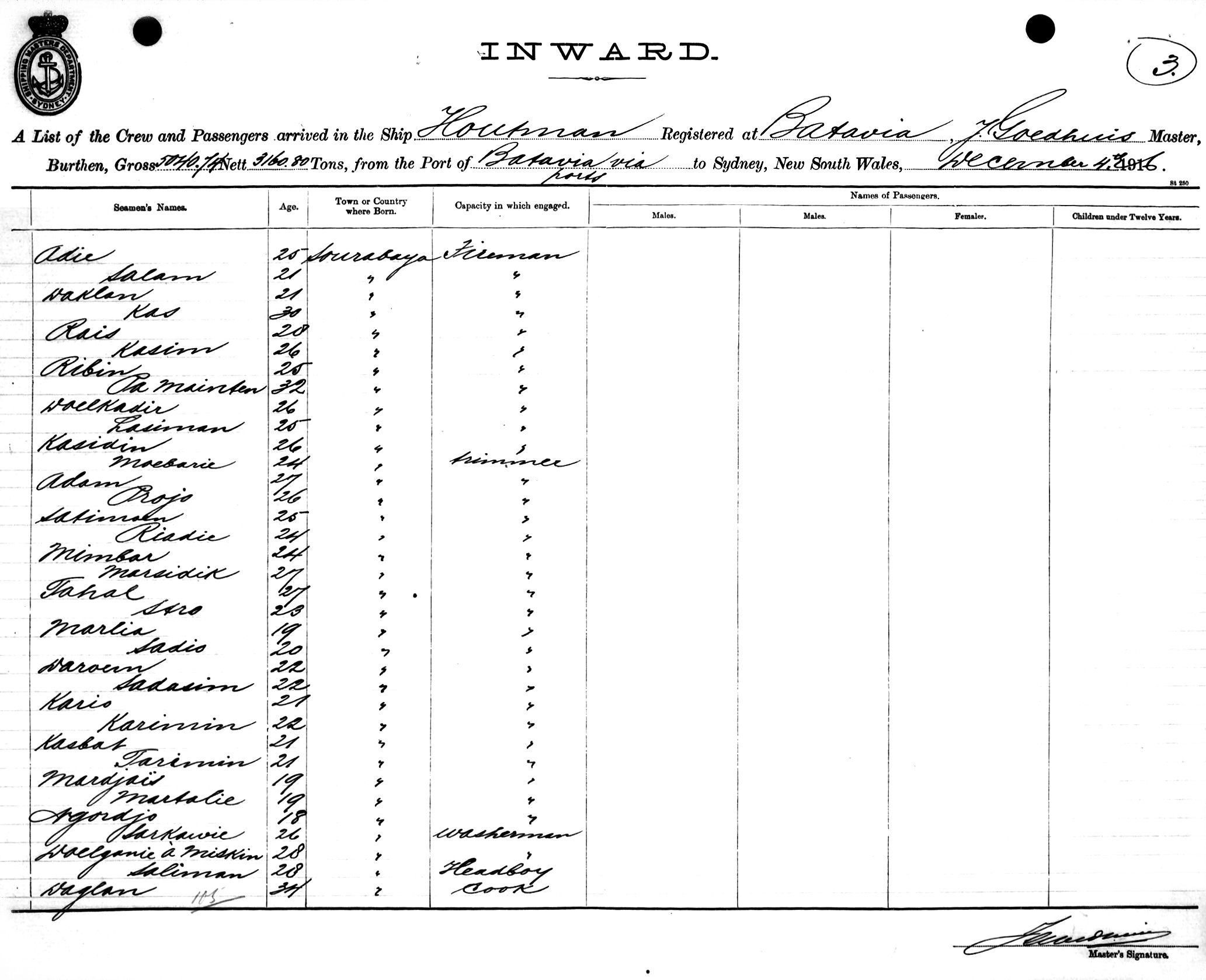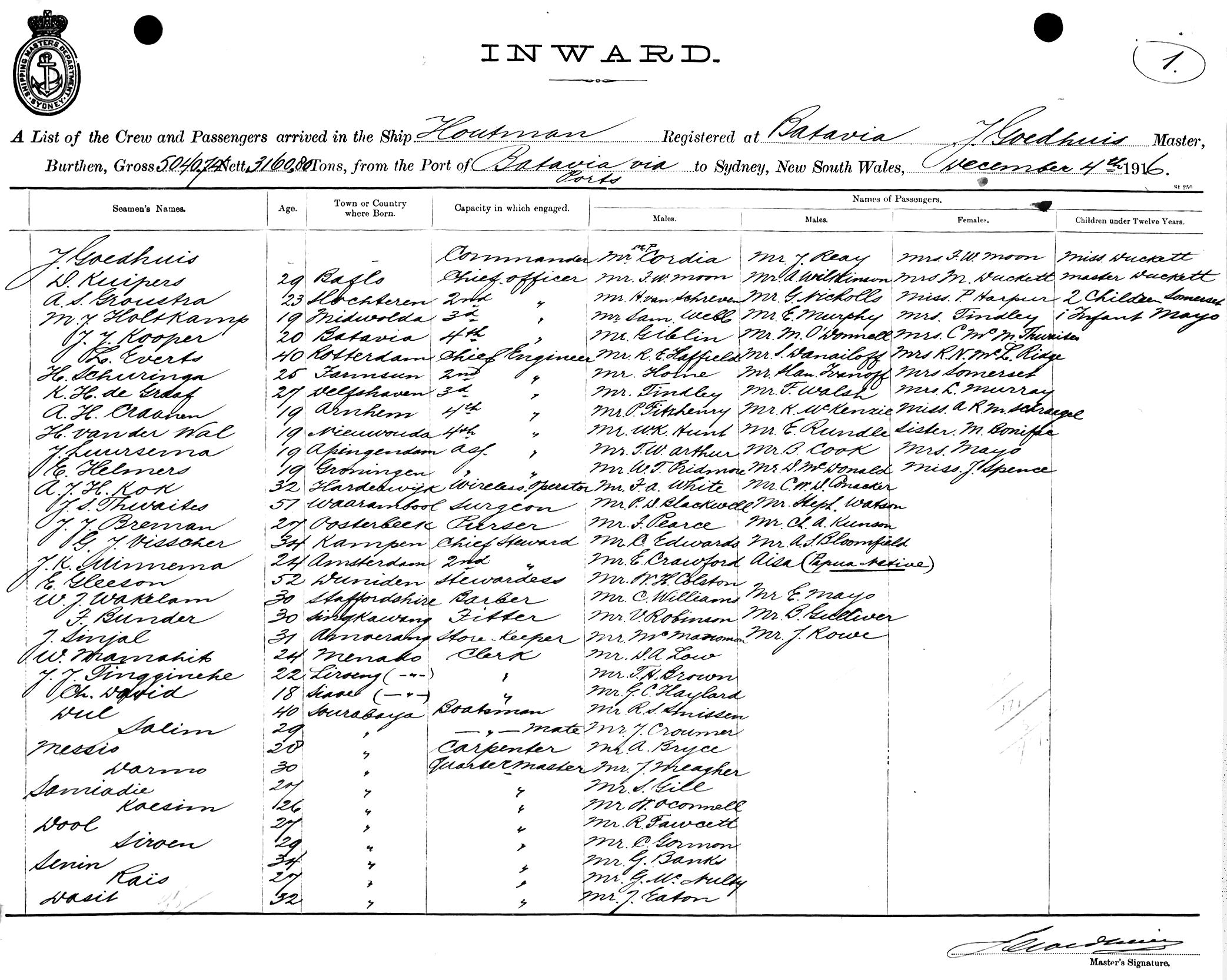 HOUTMANOF BATAVIA, J. GOEDHUIS, MASTER, BURTHEN 5040/3160 TONS FROM THE PORT OF BATAVIA via PORTS TO SYDNEY, NEW SOUTH WALES, 4TH SEPTEMBER 1916 |