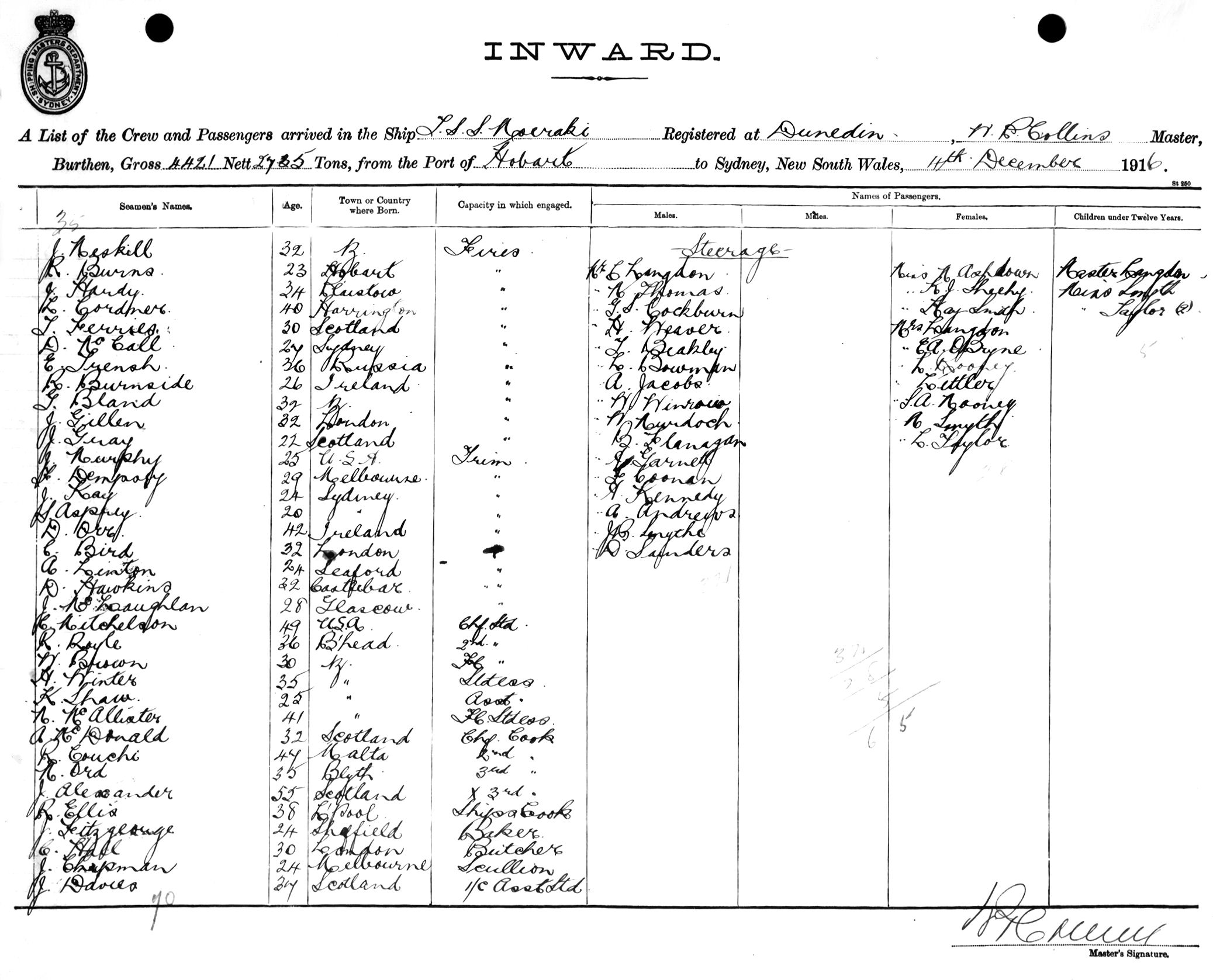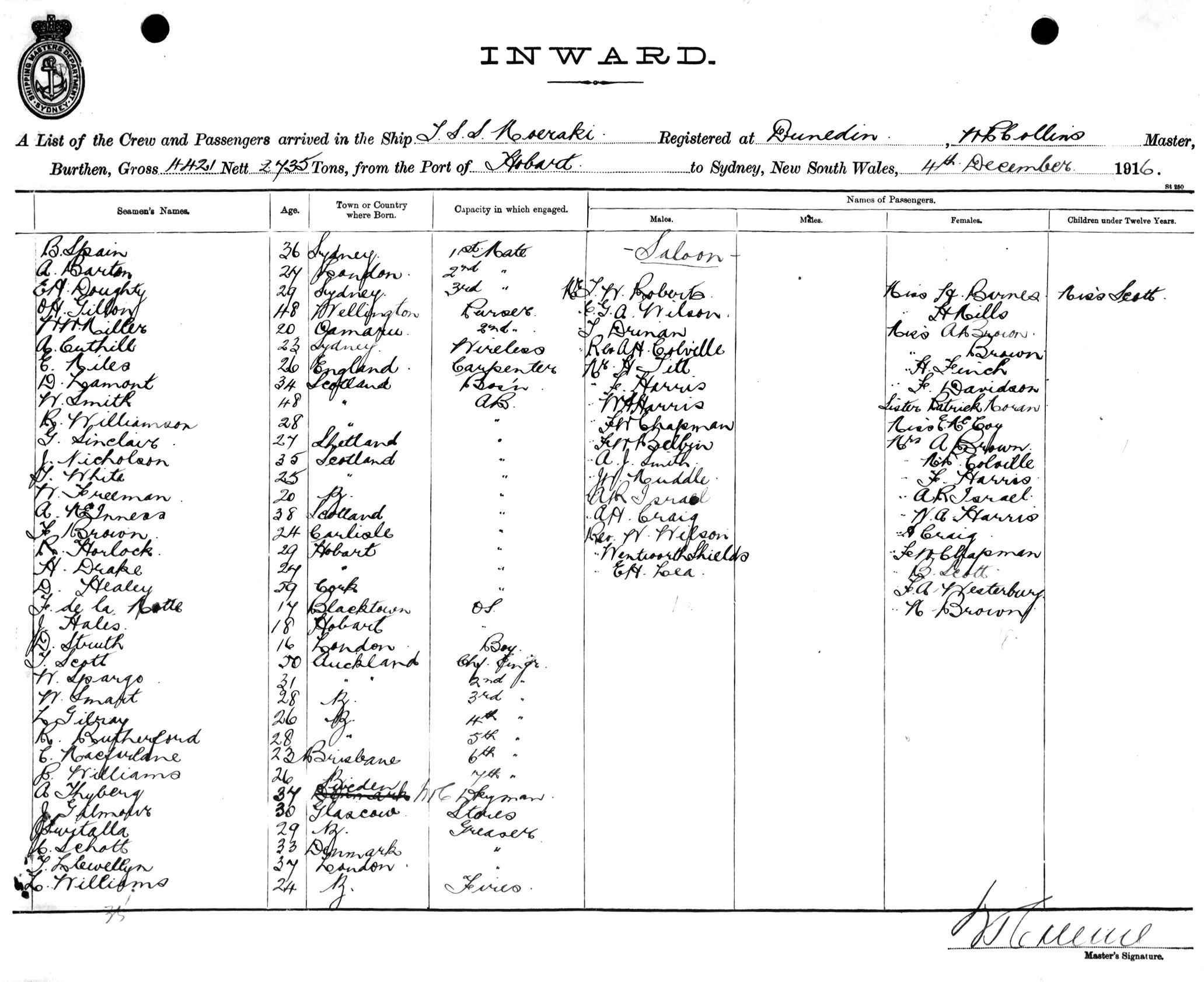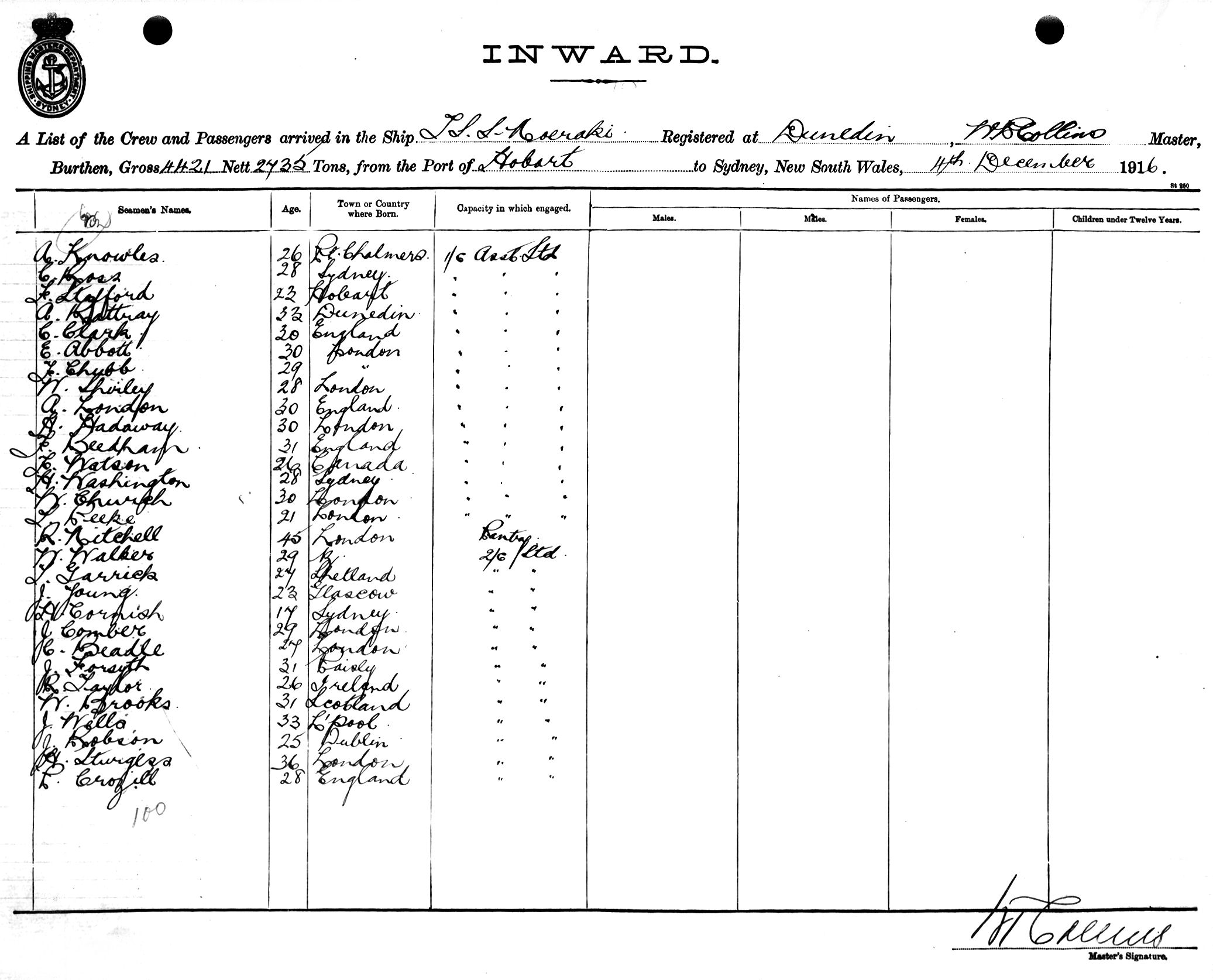 Mariners and ships in Australian Waters | MOERAKIOF DUNEDIN, W. P. COLLINS, MASTER, BURTHEN 4421/2735 TONS FROM THE PORT OF HOBART TO SYDNEY, NEW SOUTH WALES, 4TH DECEMBER 1916 |