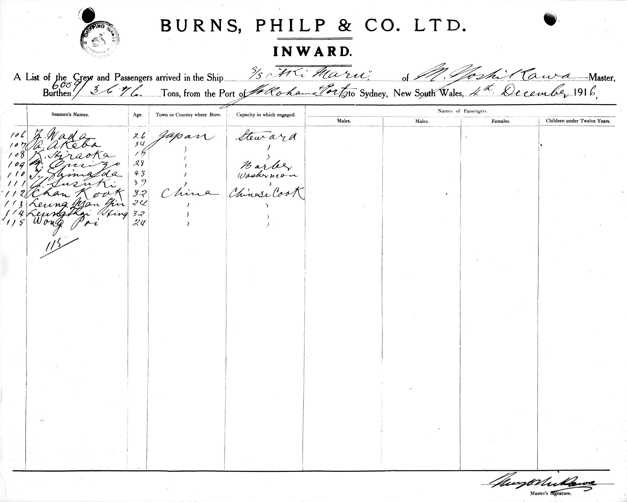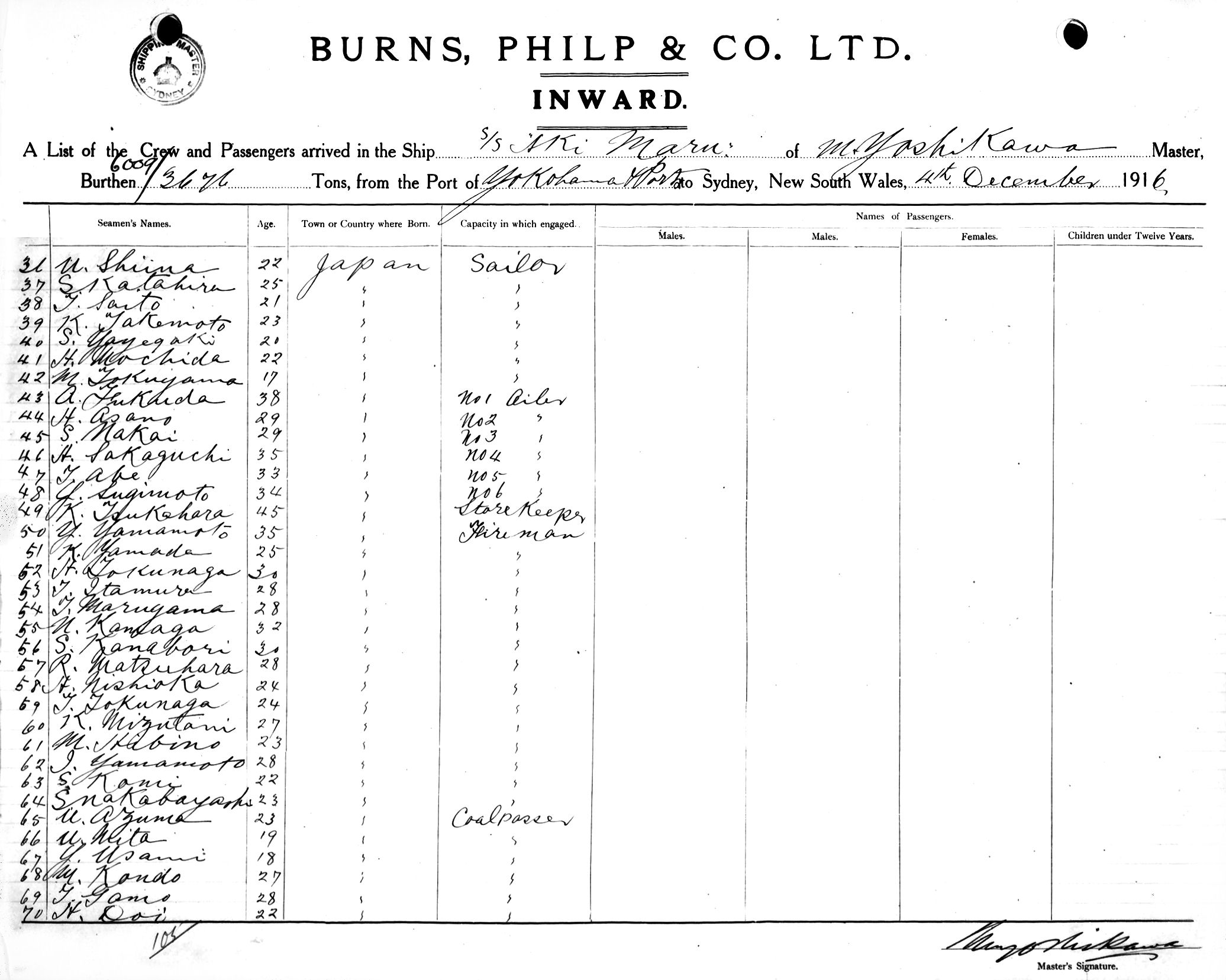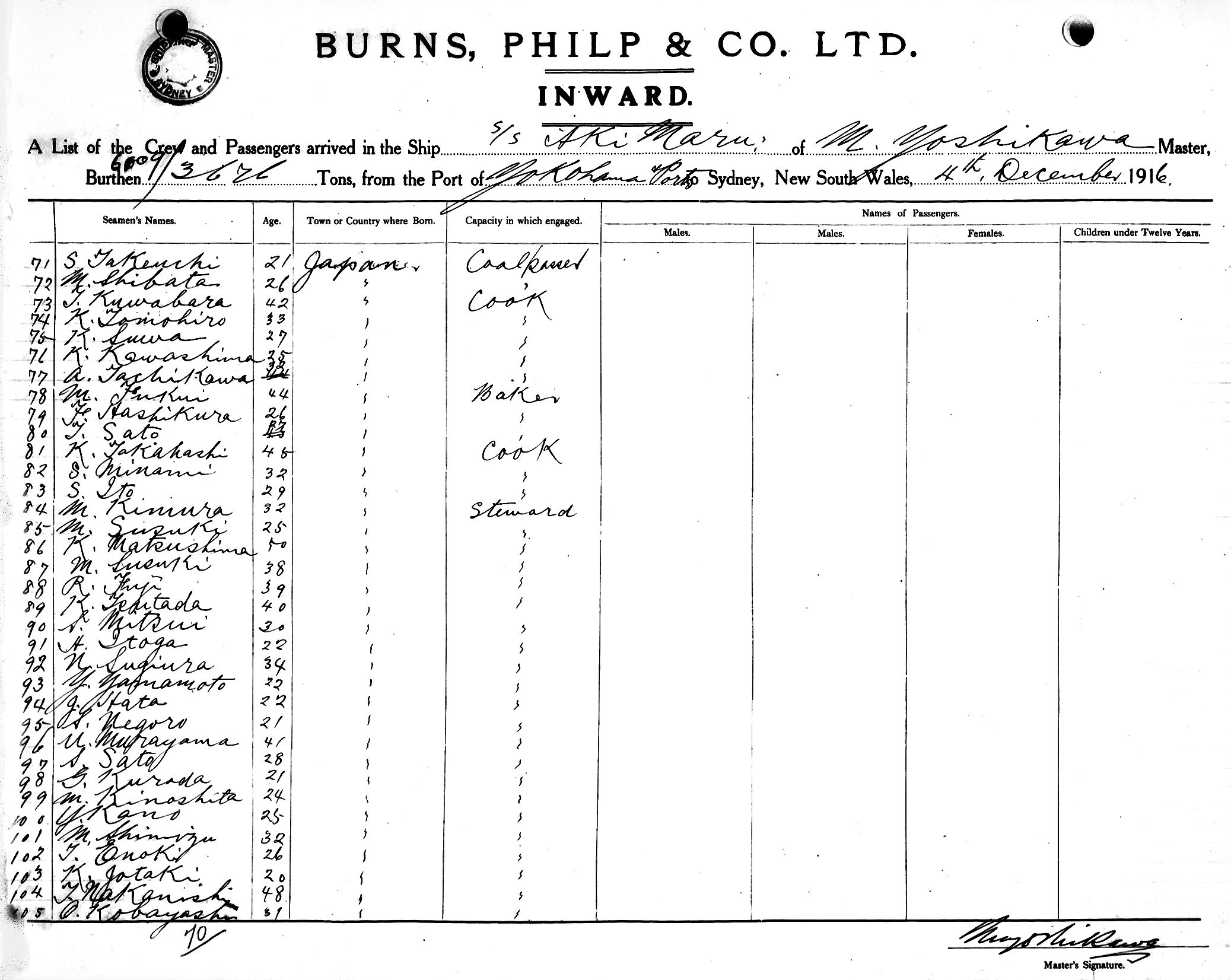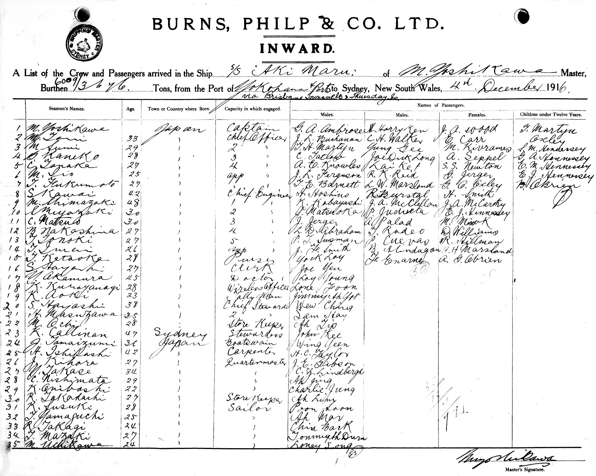 Mariners and ships in Australian Waters | AKI MARUOF JAPAN, M. YOSHIKAWA, MASTER, BURTHEN 6009/3676 TONS FROM THE PORT OF YOKOHAMA &PORTS via THURSDAY IS, TOWNSVILLE & BRISBANE TO SYDNEY, NEW SOUTH WALES, 4TH DECEMBER 1916 |