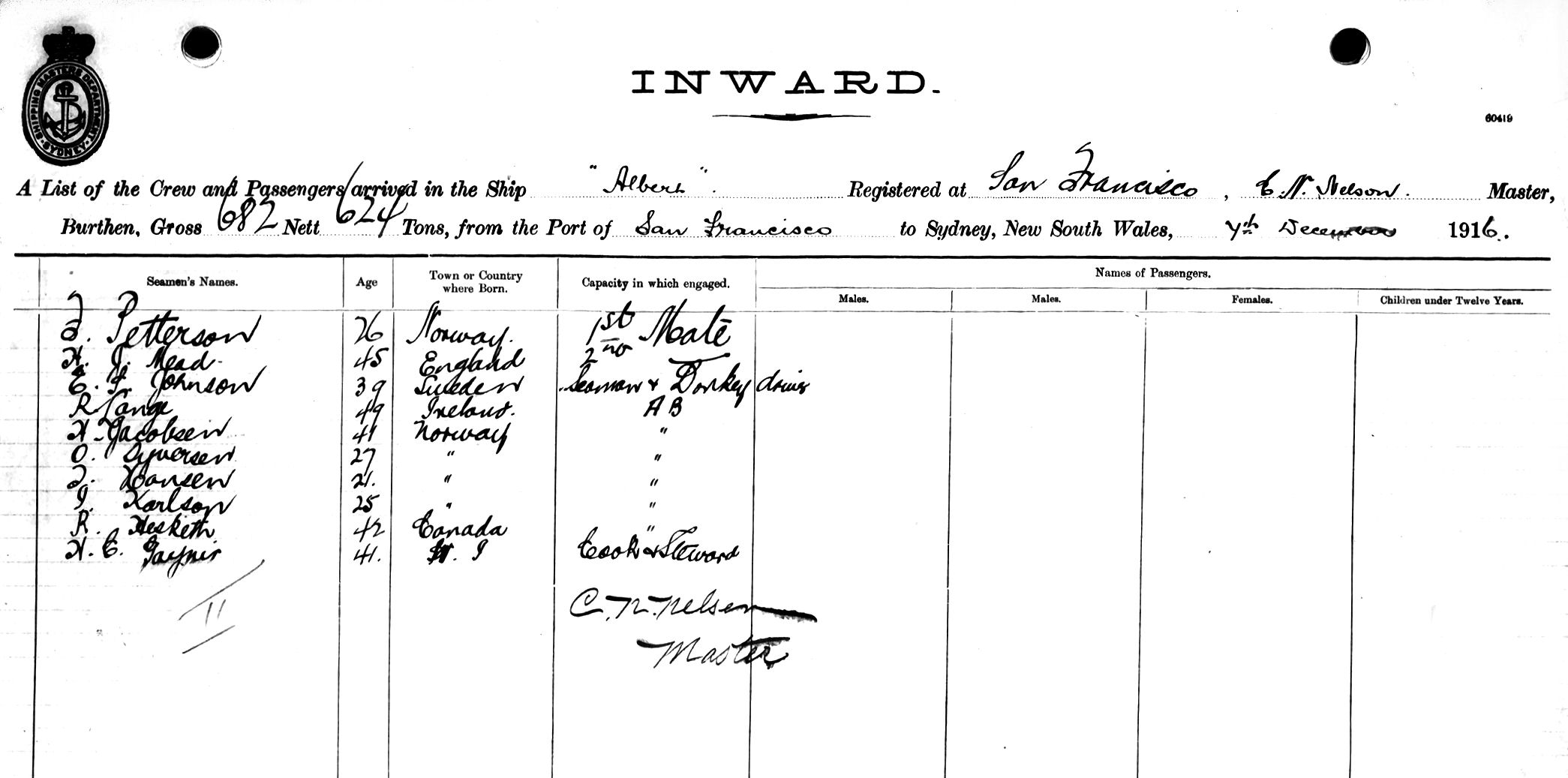 ALBERTOF SAN FRANCISCO, C. N. NELSON, MASTER, BURTHEN 682/624 TONS FROM THE PORT OF SAN FRANCISCO TO SYDNEY, NEW SOUTH WALES, 7TH DECEMEBBER 1916 |