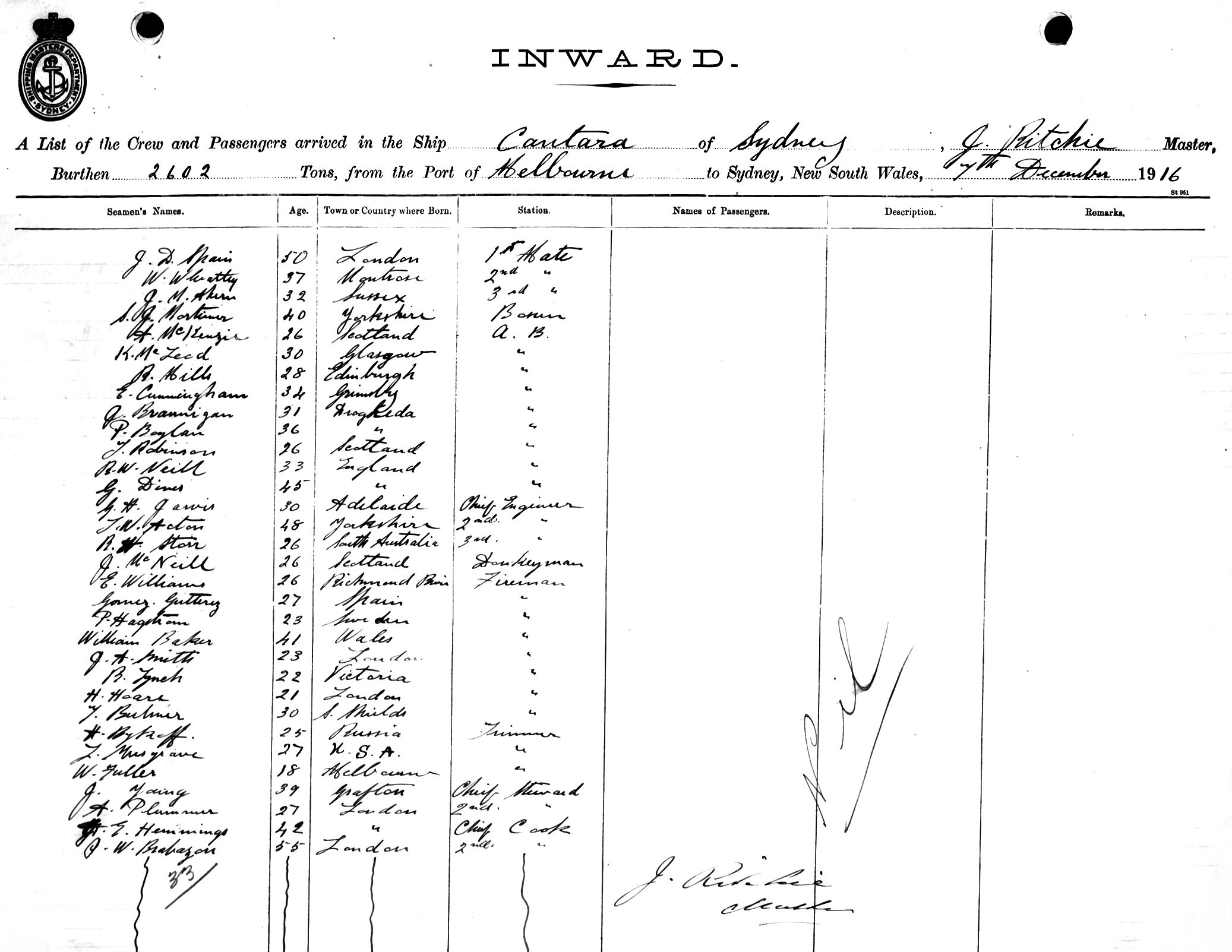 CANTARAOF SYDNEY, J. RITCHIE, MASTER, BURTHEN 2602 TONS FROM THE PORT OF MELBOURNE TO SYDNEY, NEW SOUTH WALES, 7TH DECEMBER 1916 |