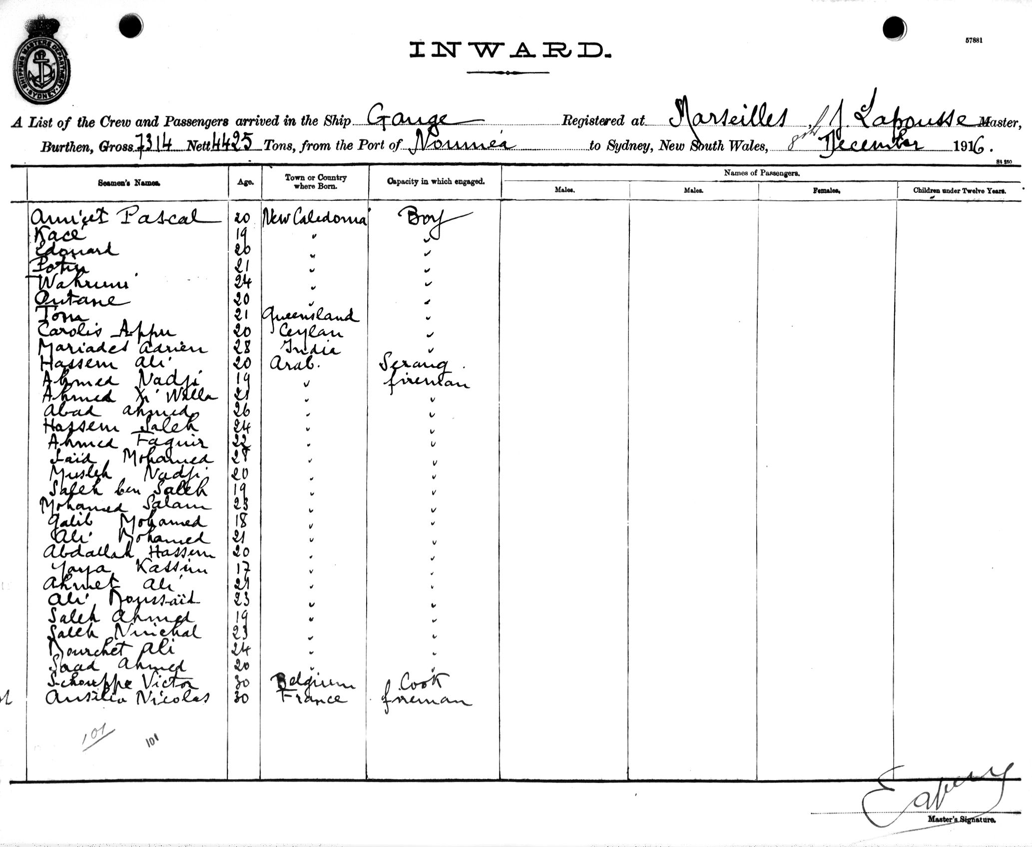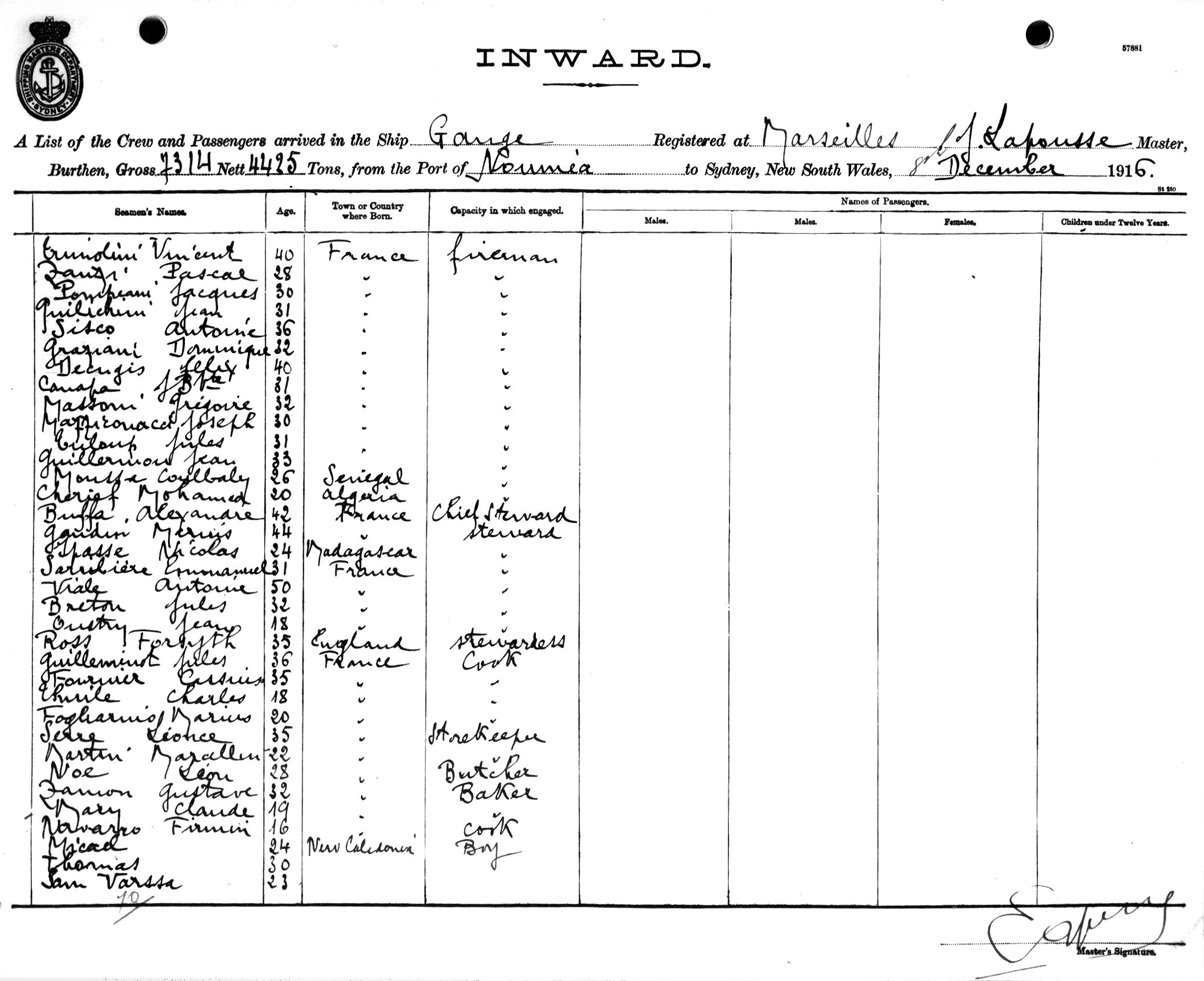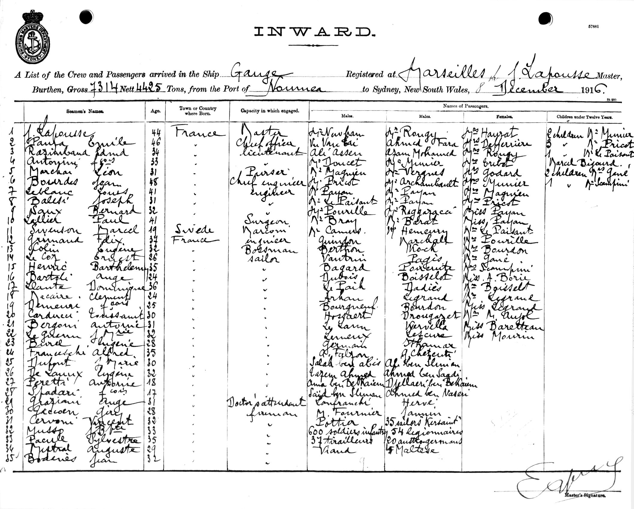 GANGEOF MARSEILLE, J. LAPOUSSE, MASTER, BURTHEN 7314/4425 TONS FROM THE PORT OF NOUMEA TO SYDNEY, NEW SOUTH WALES, 8TH DECEMBER 1916 |