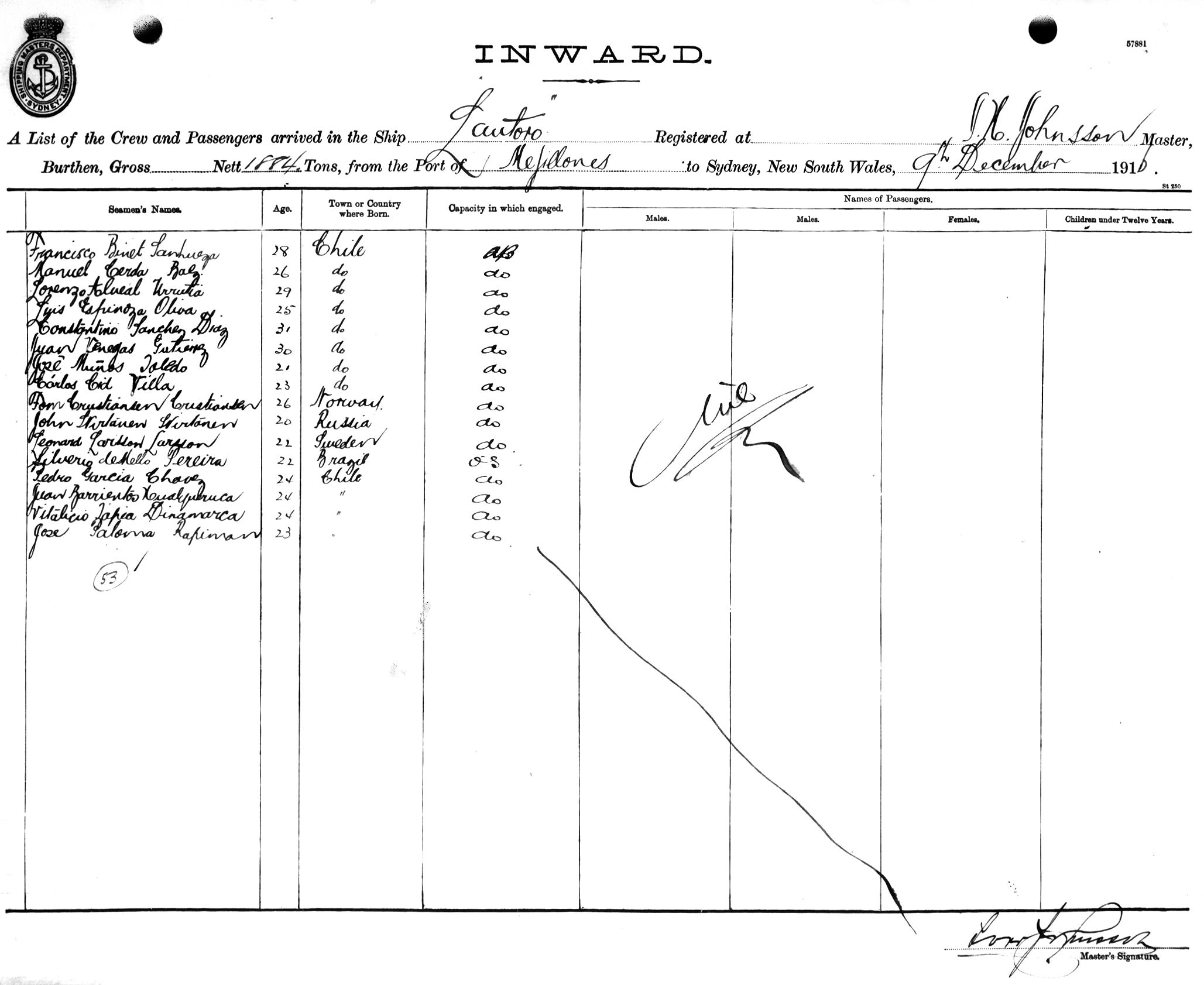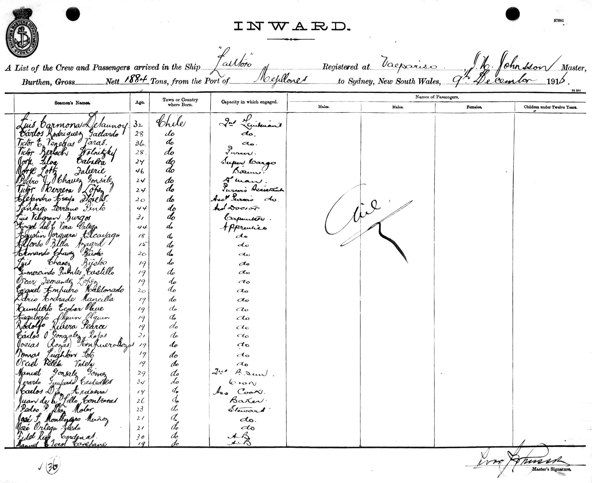 LAUTAROOF VALPARAISO, J. H. JOHNSSON, MASTER, BURTHEN 1884 TONS FROM THE PORT OF MEJILLONES, CHILE TO SYDNEY, NEW SOUTH WALES, 9TH DECEMBER 1916 |