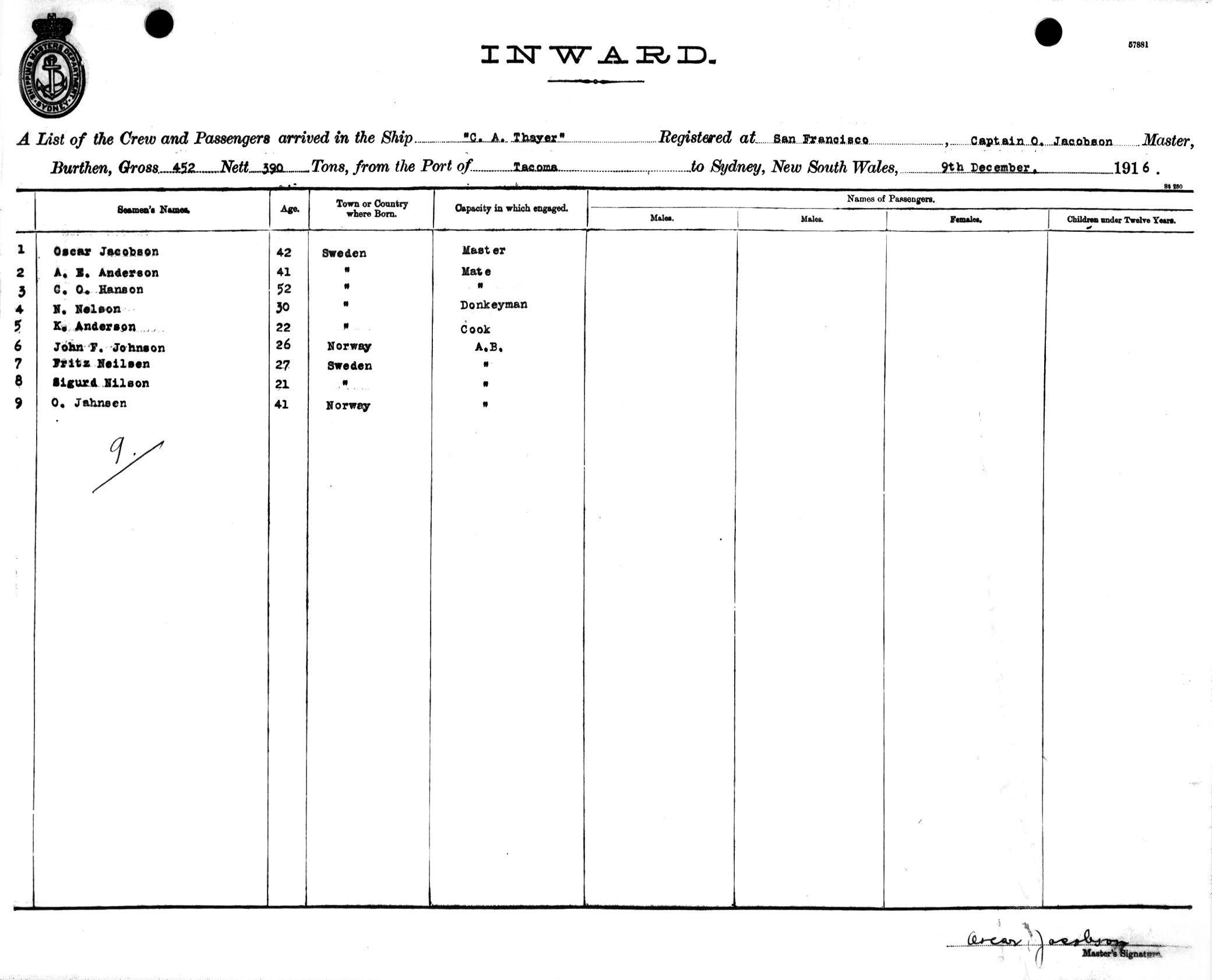 C A THAYEROF SAN FRANCISCO, OSCAR JACOBSON, MASTER, BURTHEN 452/390 TONS FROM THE PORT OF TACOMA, U.S.A. TO SYDNEY, NEW SOUTH WALES, 9TH DECEMBER 1916 |