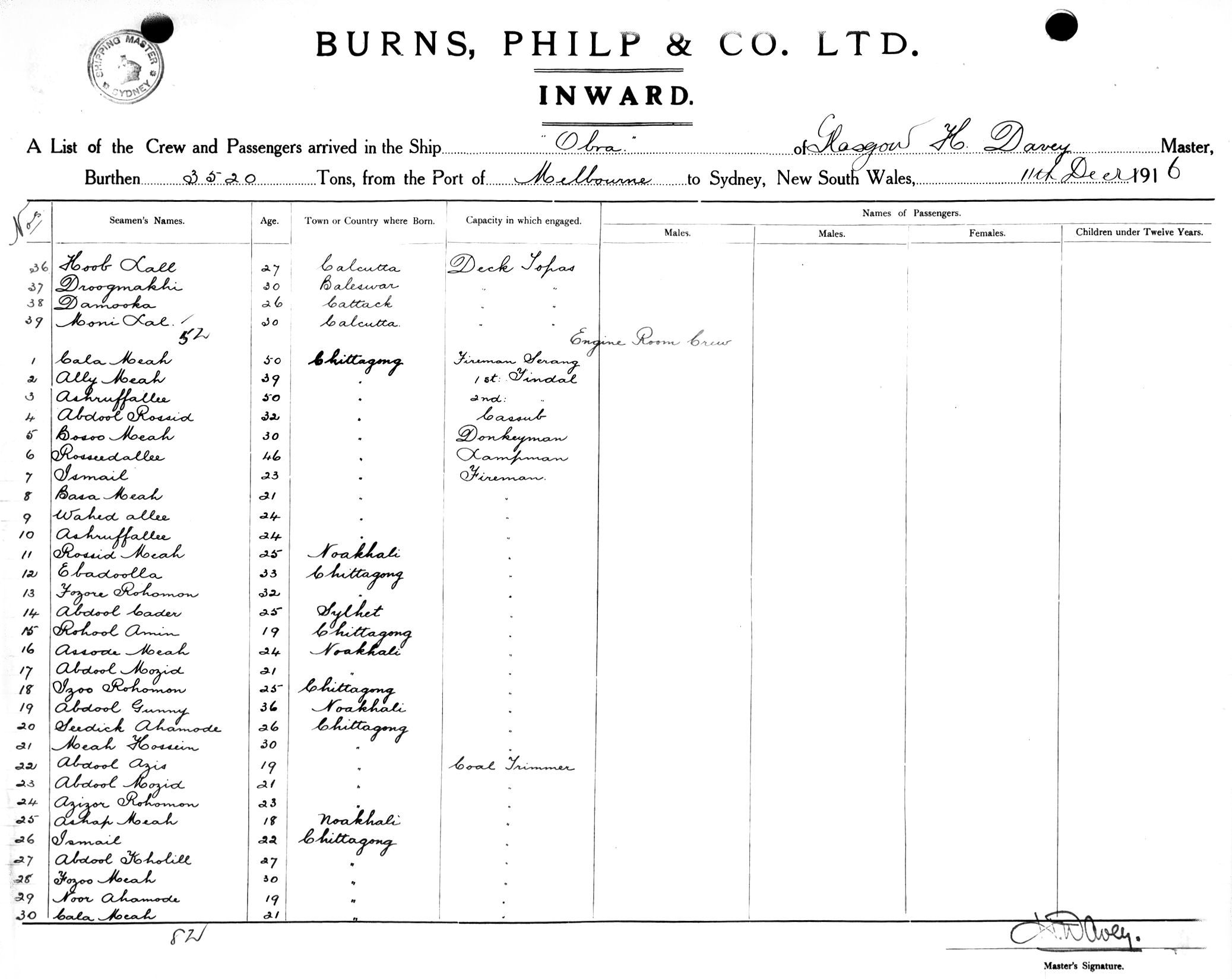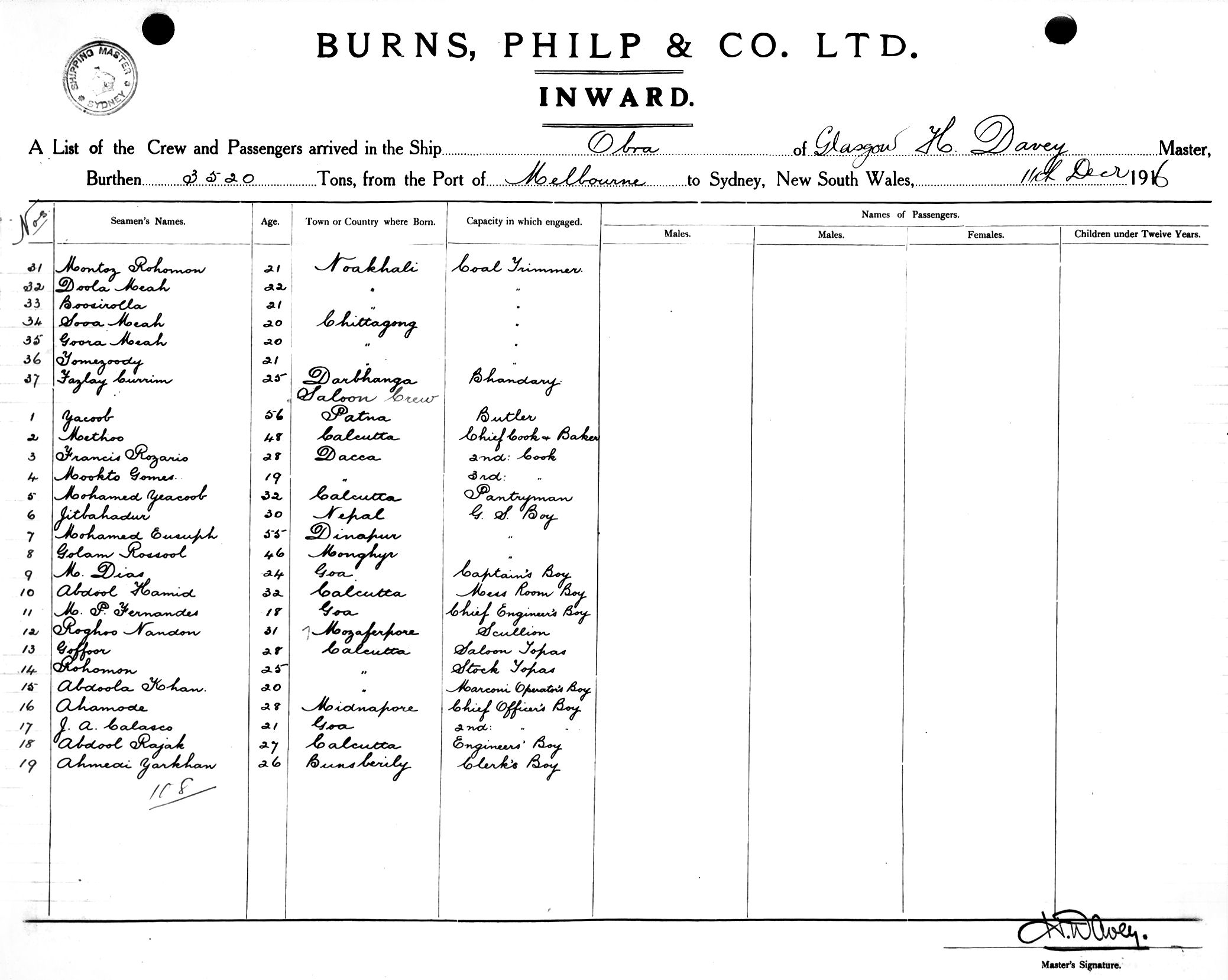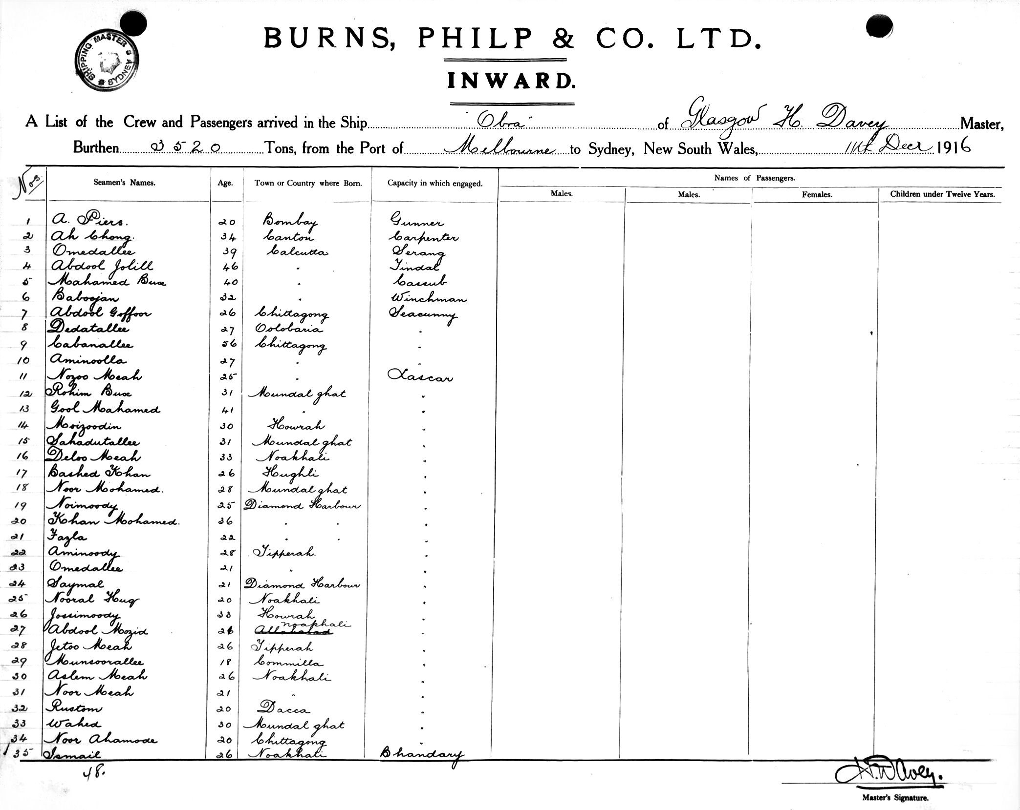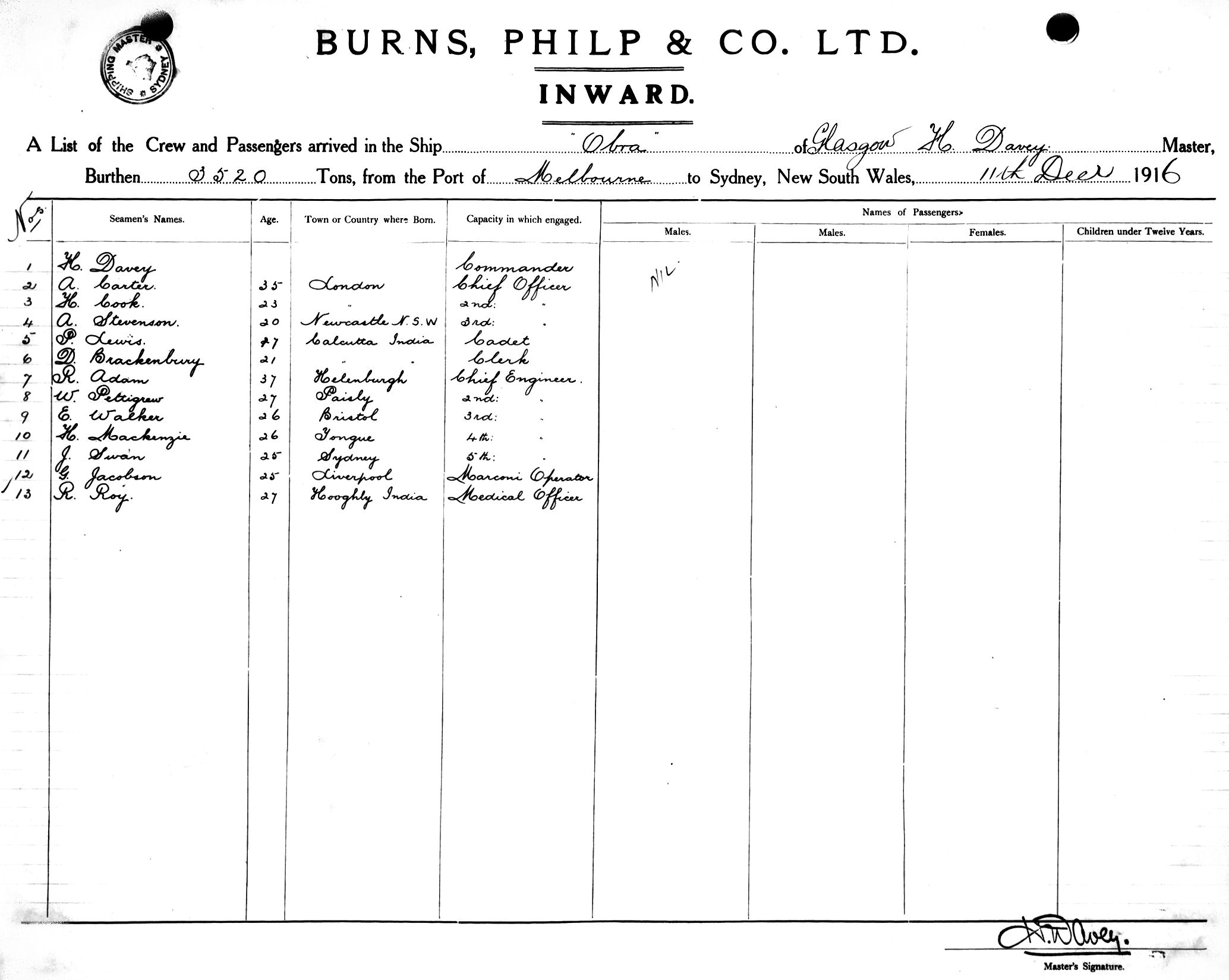 Mariners and ships in Australian Waters | OBRAOF GLASGOW, H. DAVEY, MASTER, BURTHEN 3520 TONS FROM THE PORT OF MELBOURNE TO SYDNEY, NEW SOUTH WALES, 11TH DECEMBER 1916 |