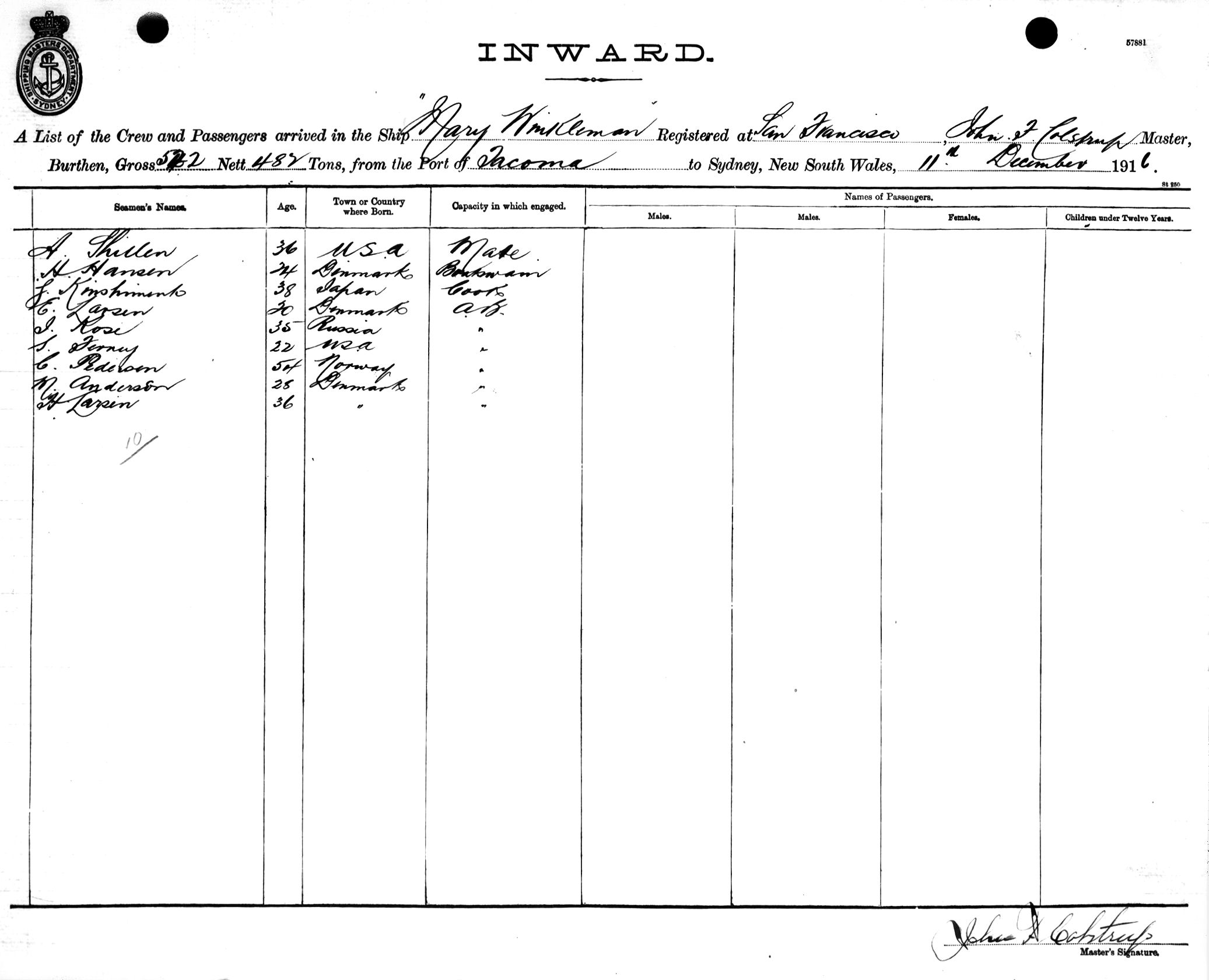 MARY WINKLEMANOF SAN FRANCISCO, JOHN F. COLSTRUP, MASTER, BURTHEN 512/482 TONS FROM THE PORT OF TACOMA, U. S. A. TO SYDNEY, NEW SOUTH WALES, 11TH DECEMBER 1916 |